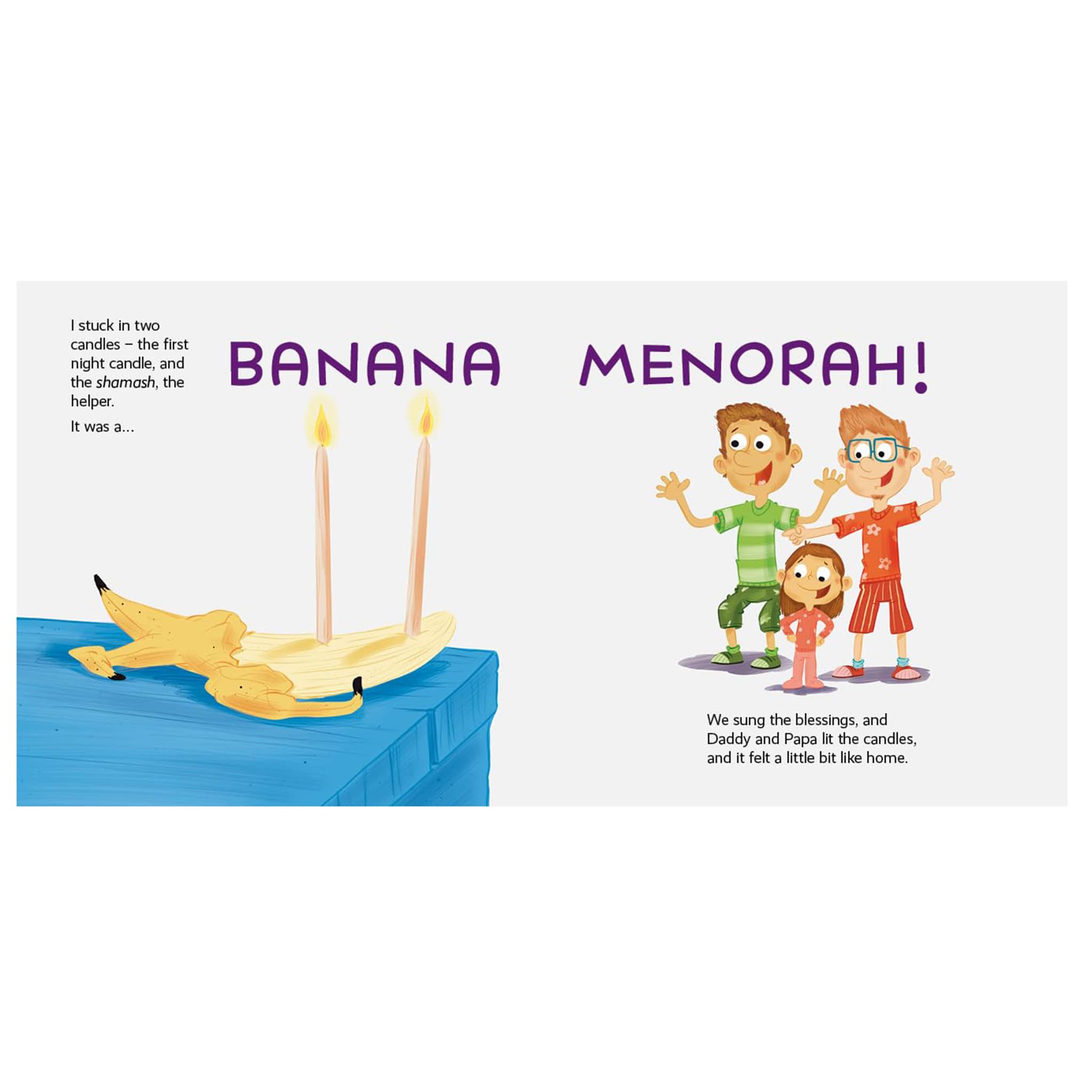 When Skylar and her dads discover they forgot to pack a Hanukkah menorah for their winter vacation, Skylar's creative thinking saves the celebration with unusual and silly replacements.