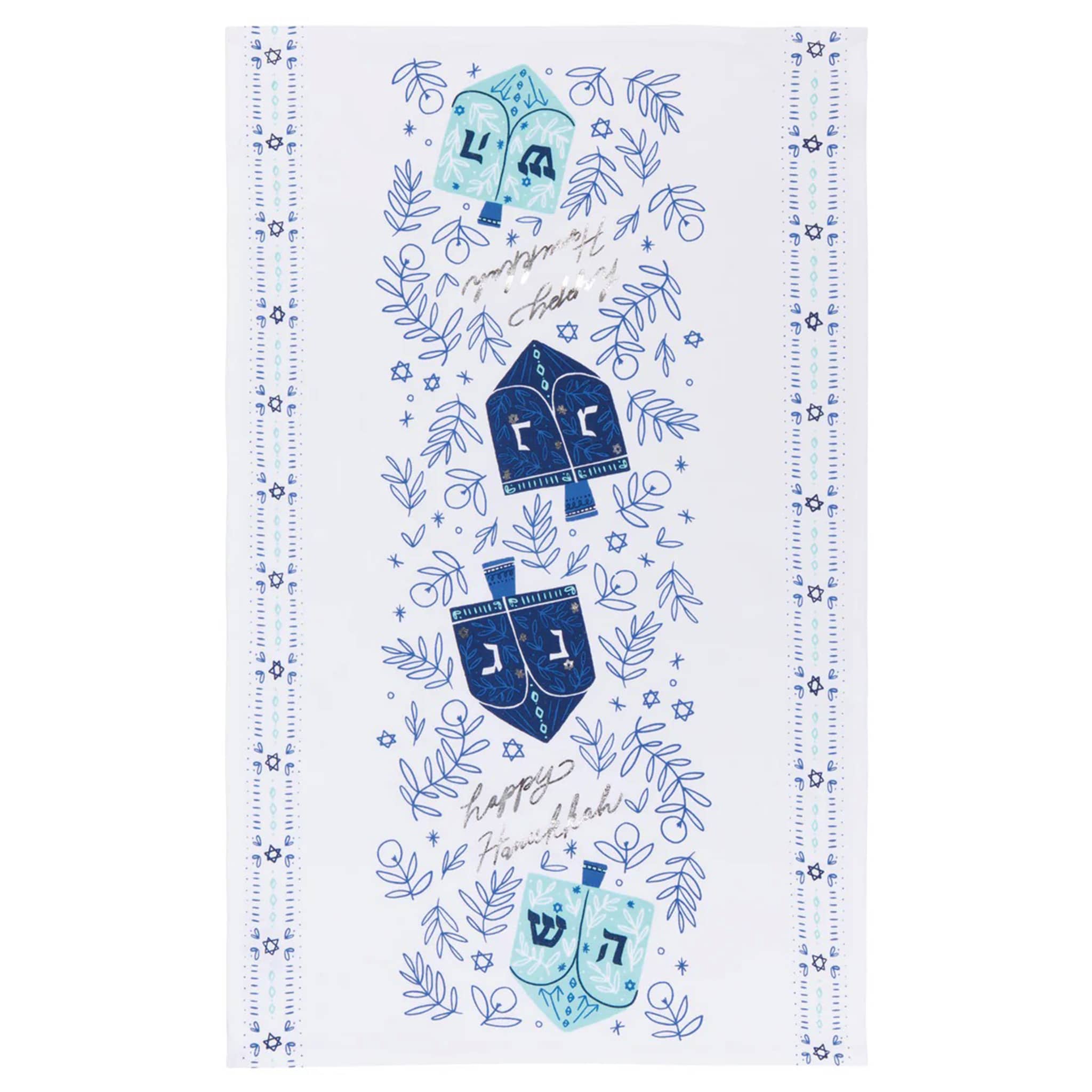 Deck out your kitchen for Hanukkah with the Dreidels cotton dishtowel! Featuring unique embellishments, this towel is anything but ordinary. Whirling dreidels take center stage In shades of blue and glints of metallic foil, with laurel sprigs, Star of David symbols, and "Happy Hanukkah" in silver. Adds a playful touch to the eight days of Chanukah. Machine wash cold, hang to dry. 100% cotton kitchen towel measures 18 x 28 inches.