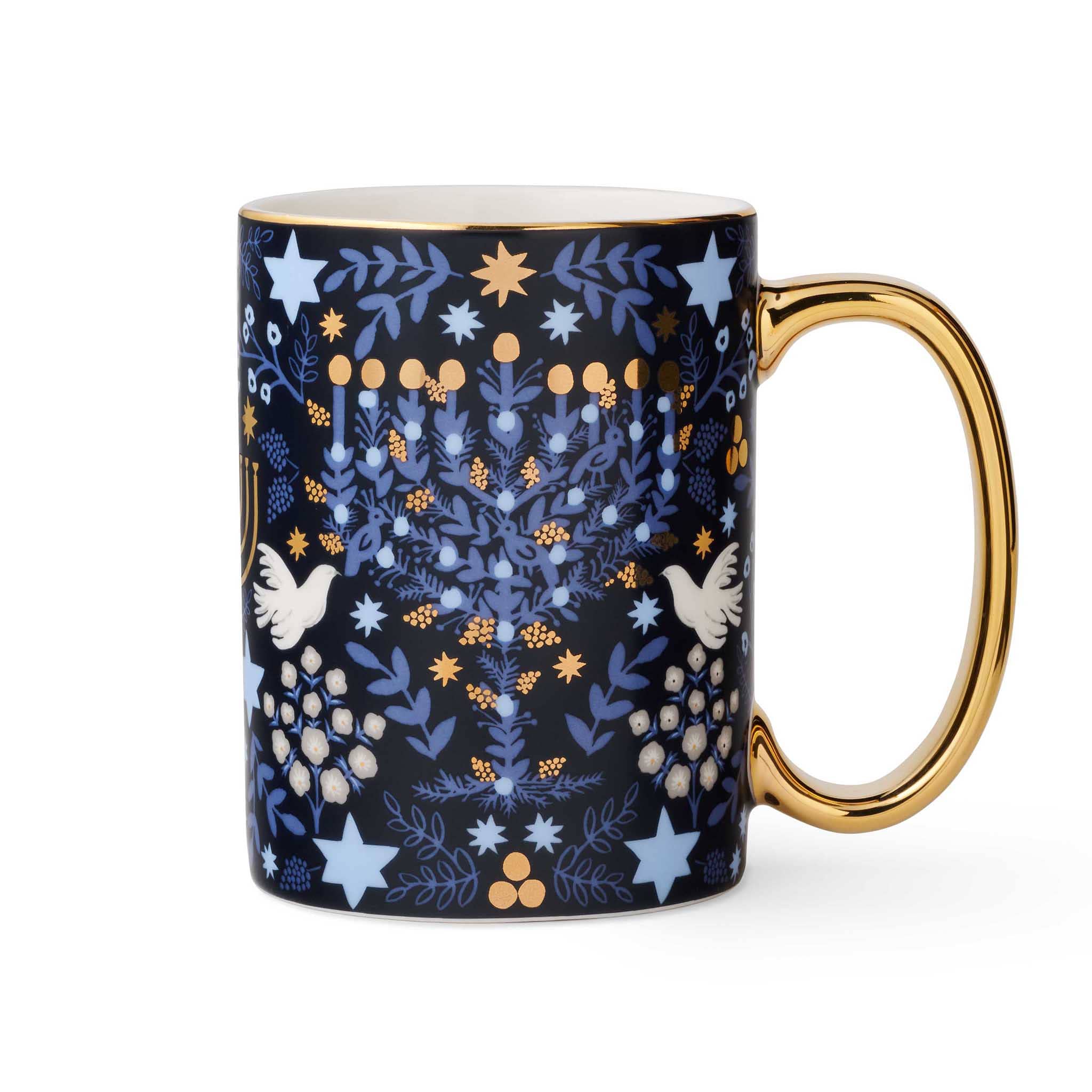The Laurel Menorah Porcelain Mug features illustrations of doves, laurels, and glowing candles. Accented by a polished gold handle and rim with a white interior. Perfect for morning coffee or afternoon tea during Hanukkah. Printed in full color with metallic gold accents. Hand wash, not microwave safe. Mug holds 16 ounces and measures 3.13 inches wide (not including handle) x 4.5 inches tall.