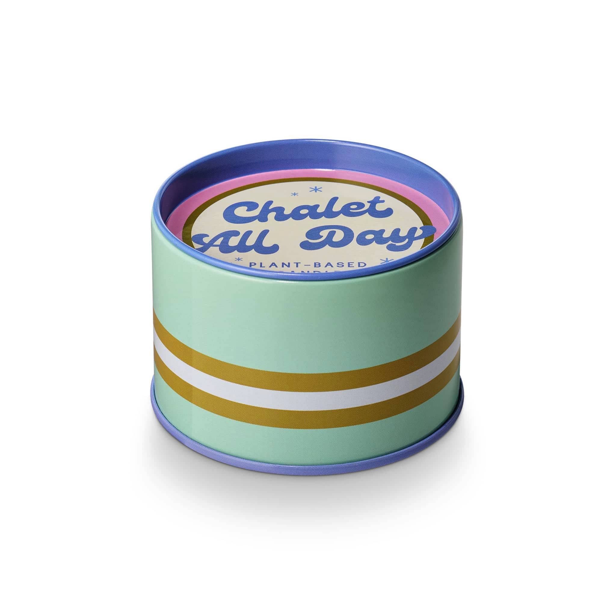 Pairs well with hot cocoa, mountain views, and books by the fire. Kick back and enjoy the winter-ready vibes with the Chalet All Day tin candle. Part of the Slopeside collection, with patterns inspired by knits and woven stripes, these designs are as cozy as wool socks and long johns. The tin features mint, mustard and white stripes, with a solid powder blue sprayed interior. The scent has notes of Fir Balsam, Mountain Air, and Winter Berry. The 4.1-ounce tin measures 3 inches in diameter x 2.125 inches tall. Estimated burn time of 20 hours.