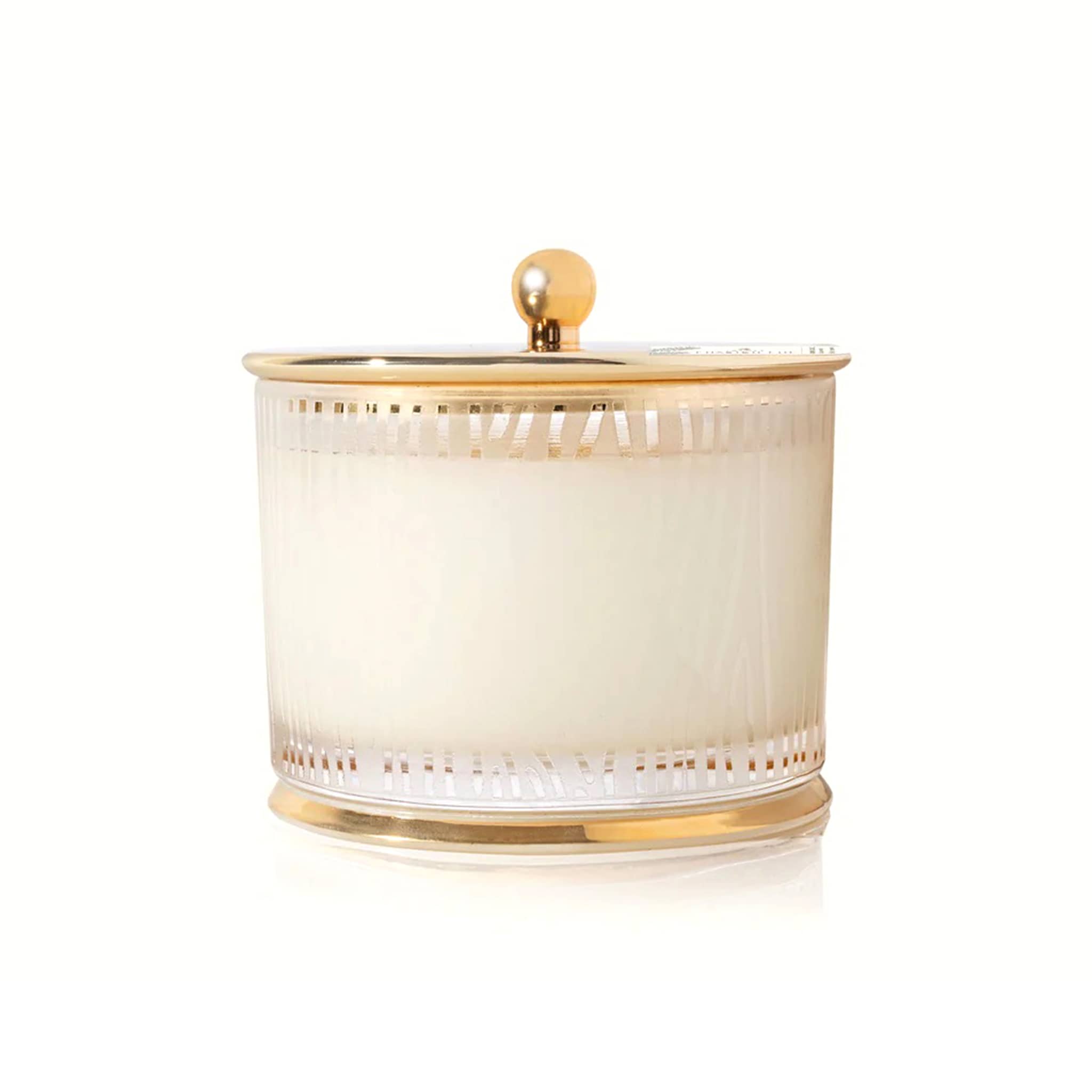 Accented with a glistening gold lid and gilded gold base, this elegant and luminous frosted wood grain candle is the perfect way to experience Frasier Fir.