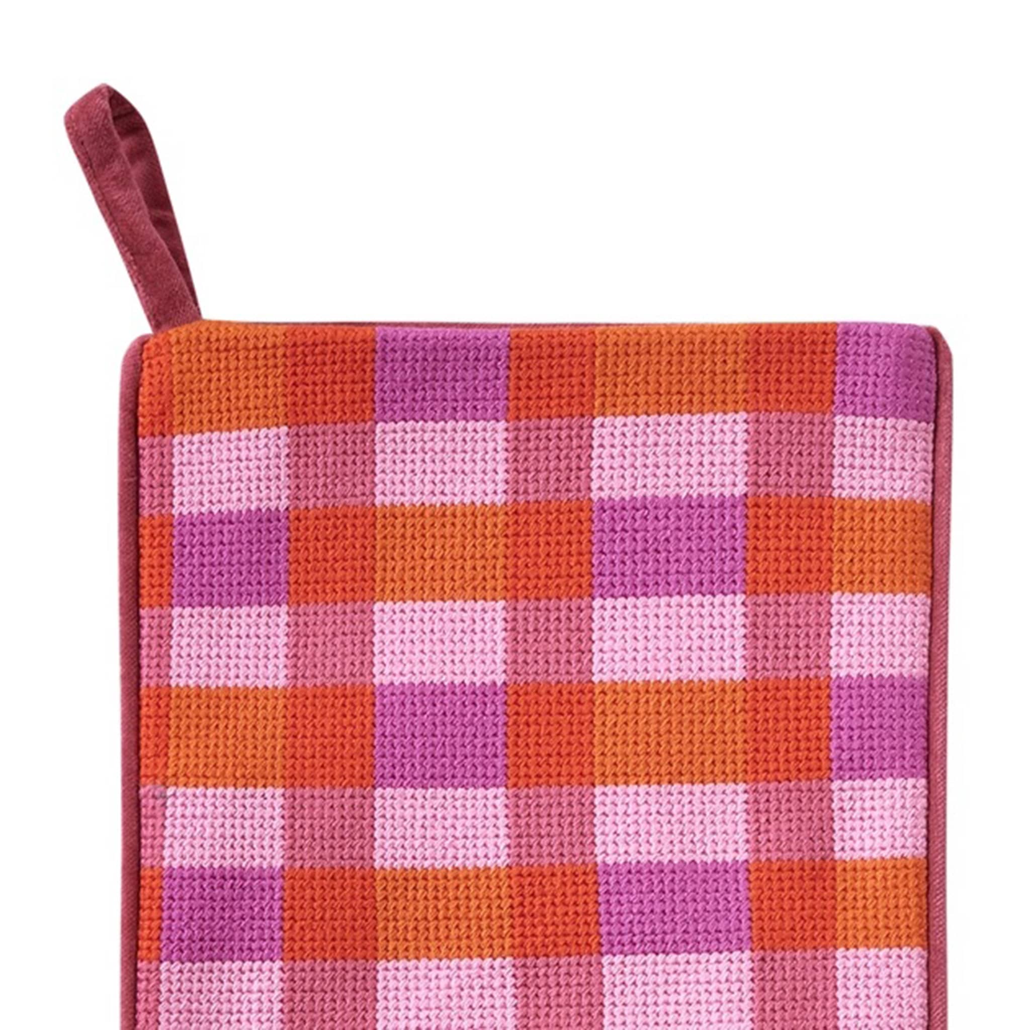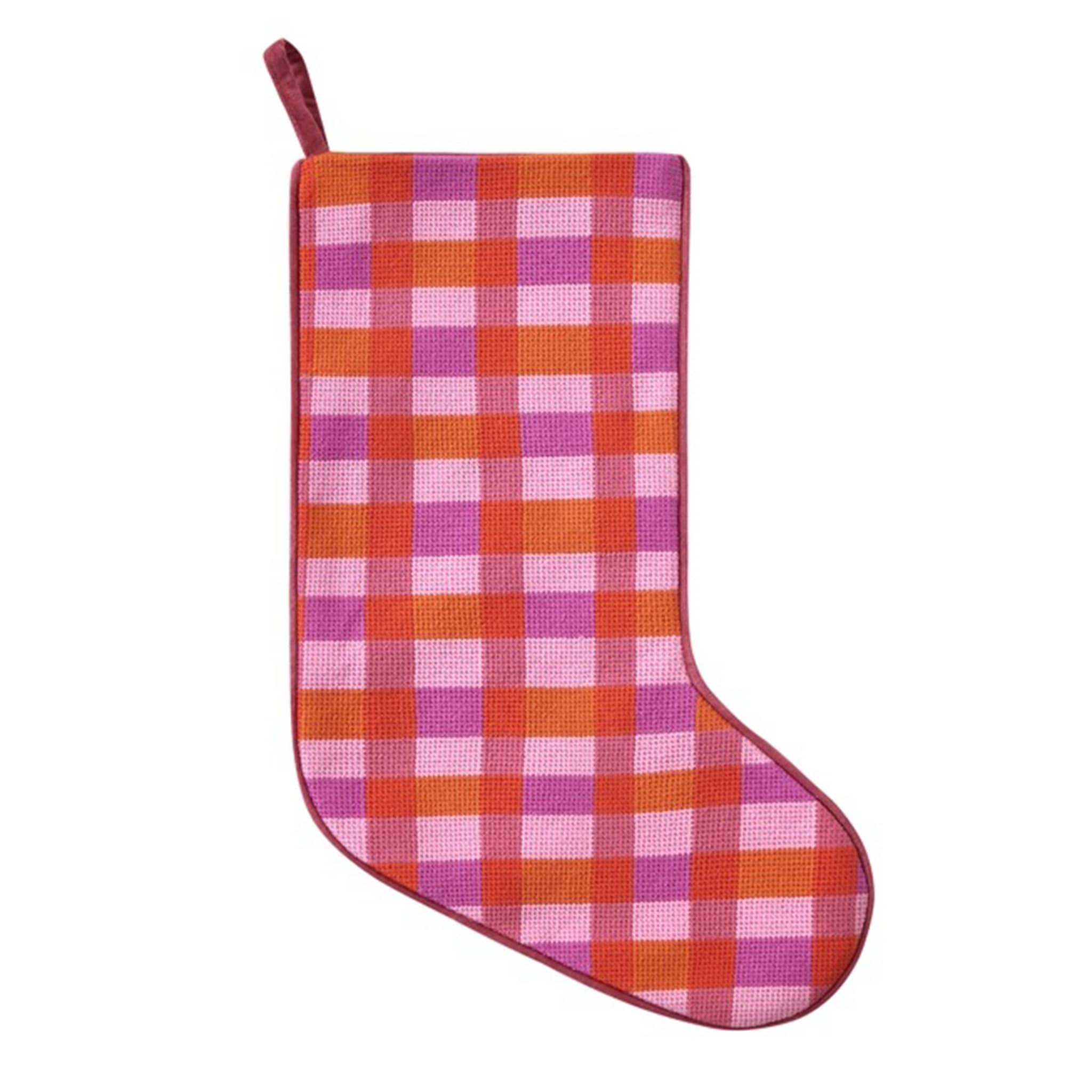 Add a modern touch to your holiday decor with this gorgeous Pink Abstract Plaid Stocking! The beautiful pink, red and purple plaid design is embroidered on the stocking with 100% polyester thread. Features a mauve cotton velvet trim, hang loop, and backing. Designed by Ampersand Design Studio. Measures approximately 11 x 18 inches.