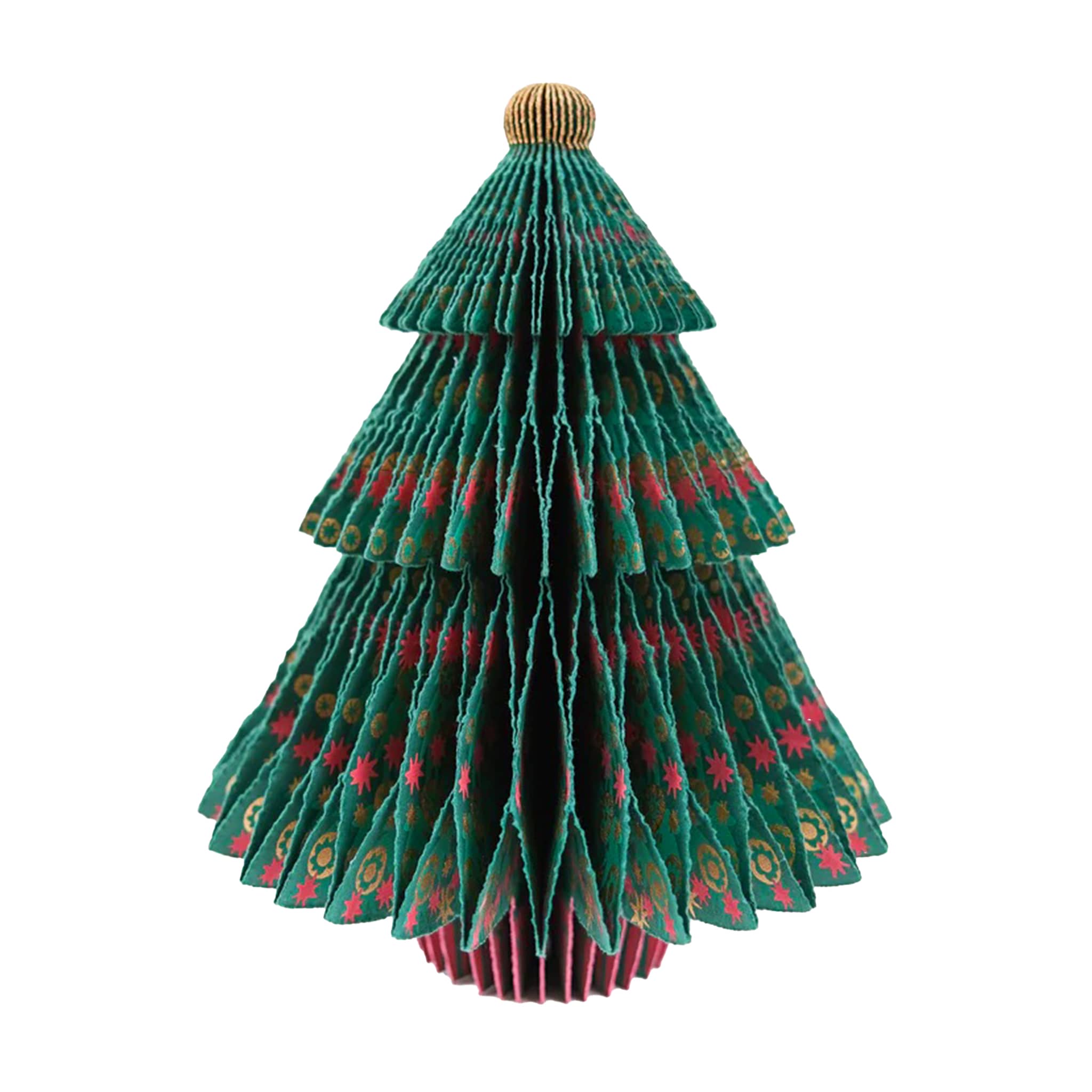 Composed of intricate layers of recycled cotton paper, this decoration unfolds to reveal a gorgeous three-dimensional honeycomb fir tree! Makes a beautiful holiday table centerpiece or statement piece for the mantel. The honeycomb stays securely open with a magnet.