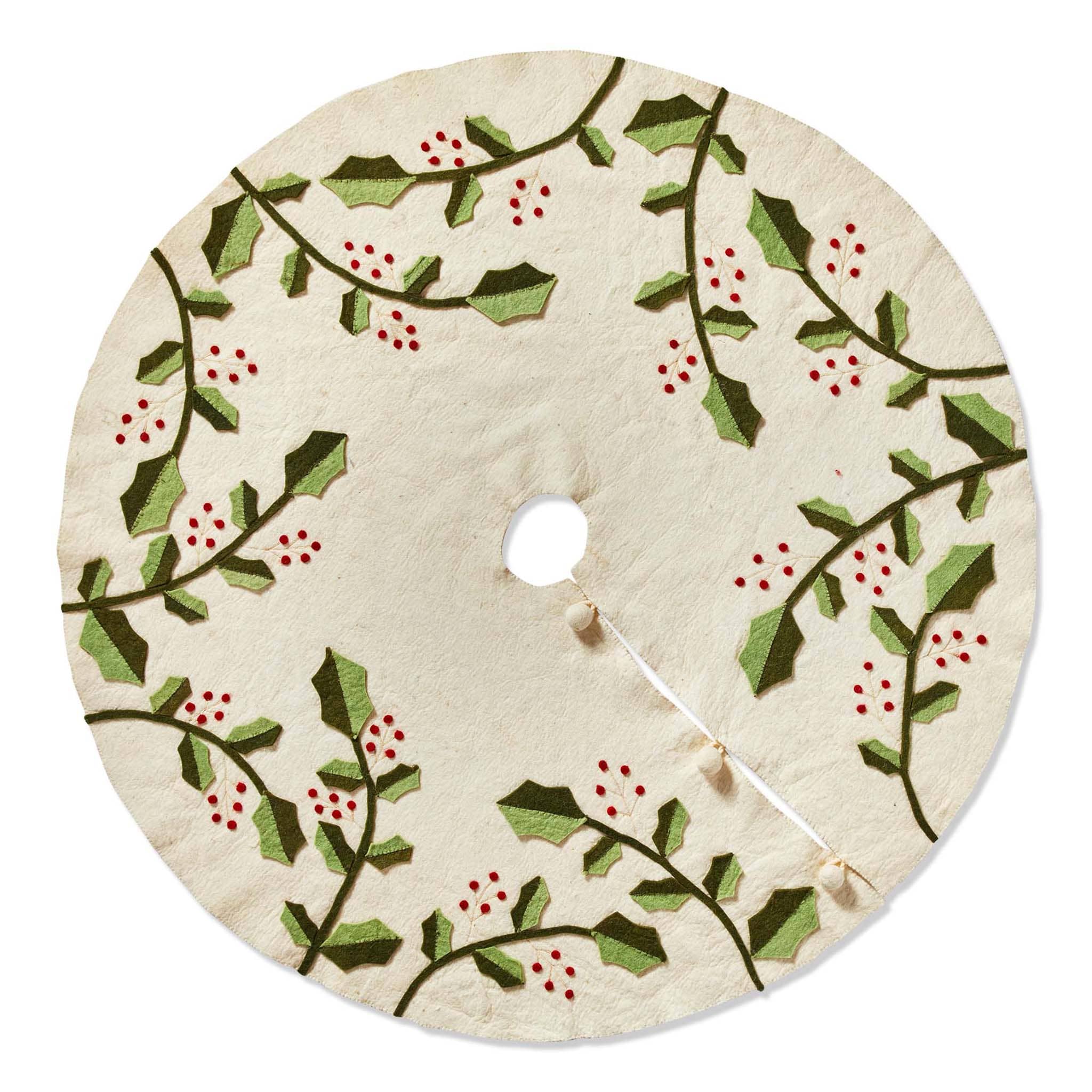 Add a touch of traditional Christmas charm to your holiday decor with this elegant Holly and Berry Tree Skirt. Made from wool felt and cotton thread, this skirt features a classic white design with green holly leaves and red berries. Measures 52 inches in diameter.