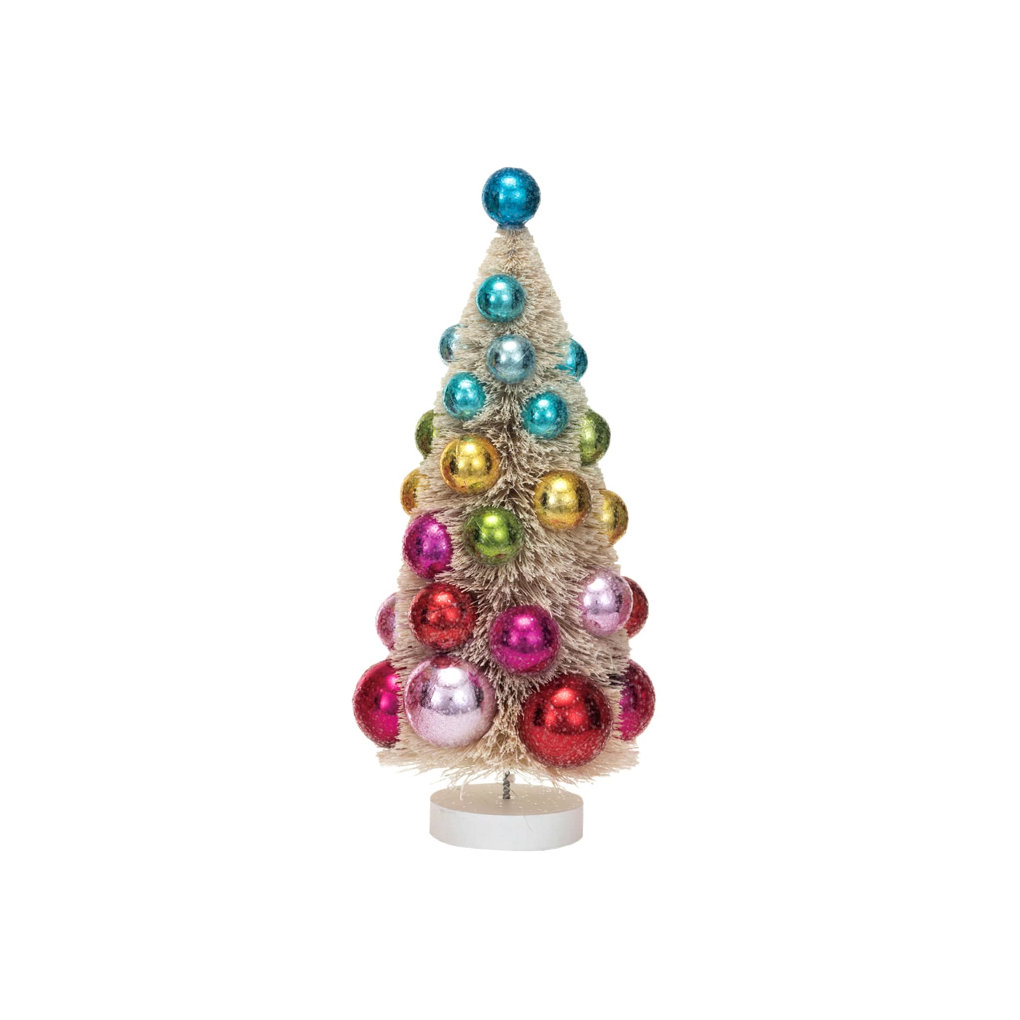 Brighten your holiday display with this cheerful Medium Sisal Bottle Brush Tree. The white tree is accented with colorful ornaments in a variety of sizes. Set on a clean white wood base, it brings a playful pop of color and charm to mantels, shelves, and tabletop décor. The vibrant baubles give it a whimsical, festive look that complements both classic and modern holiday styles. Perfect on its own or grouped with other bottle brush trees for a charming winter scene. Medium size measures 4.5 inches in diameter x 11 inches tall.