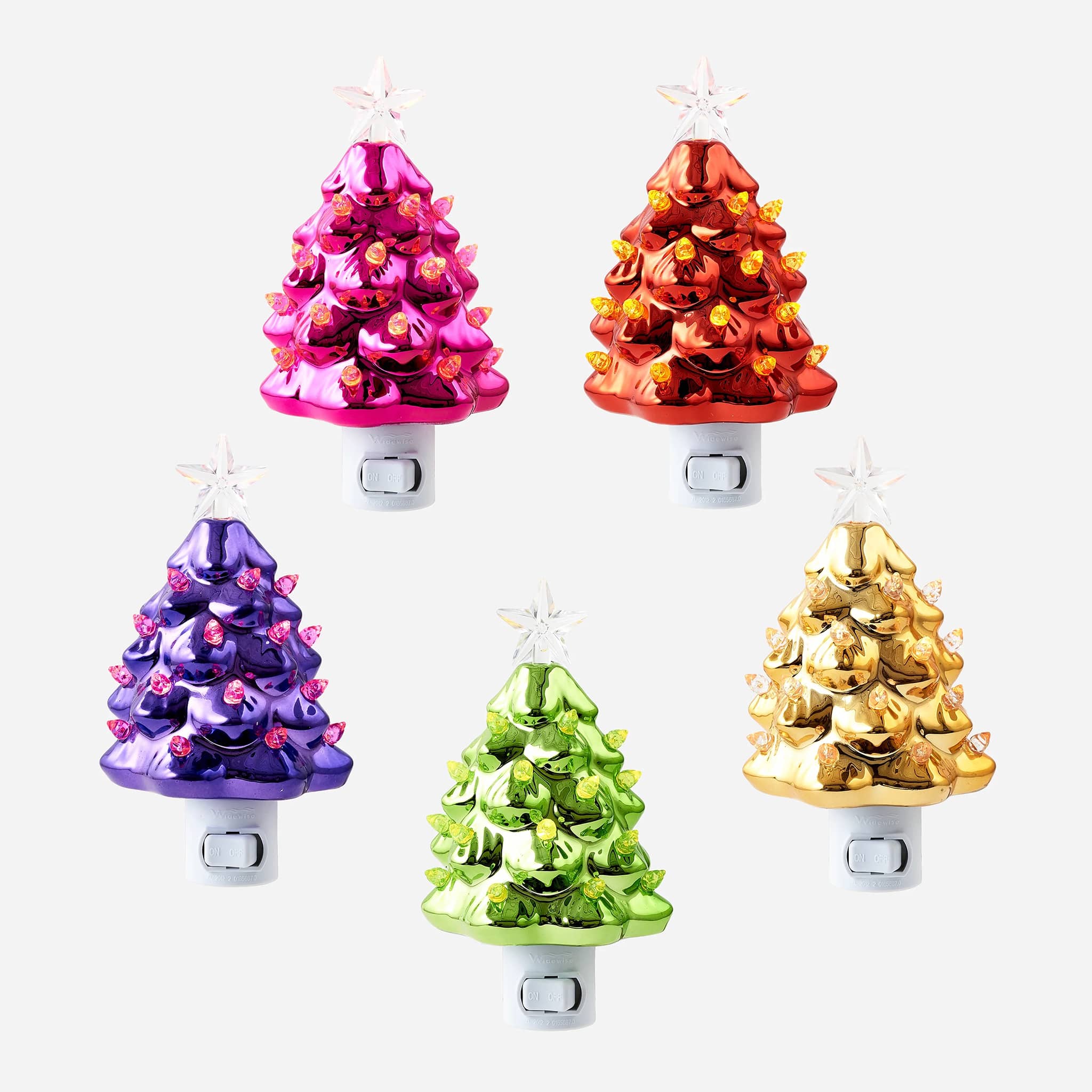 Add a festive glow to any room with this ceramic Christmas Tree Night Light, featuring a beautiful shiny metallic finish. The colorful LED bulbs and shining star on top bring cheerful holiday charm to your space. With a convenient on/off switch, timer, and plug-in design, this decorative night light makes it easy to brighten up kids bedrooms, hallways for guests, or living areas all season long. Available in pink, orange, yellow, green, and purple. Measures 6.25 inches tall.