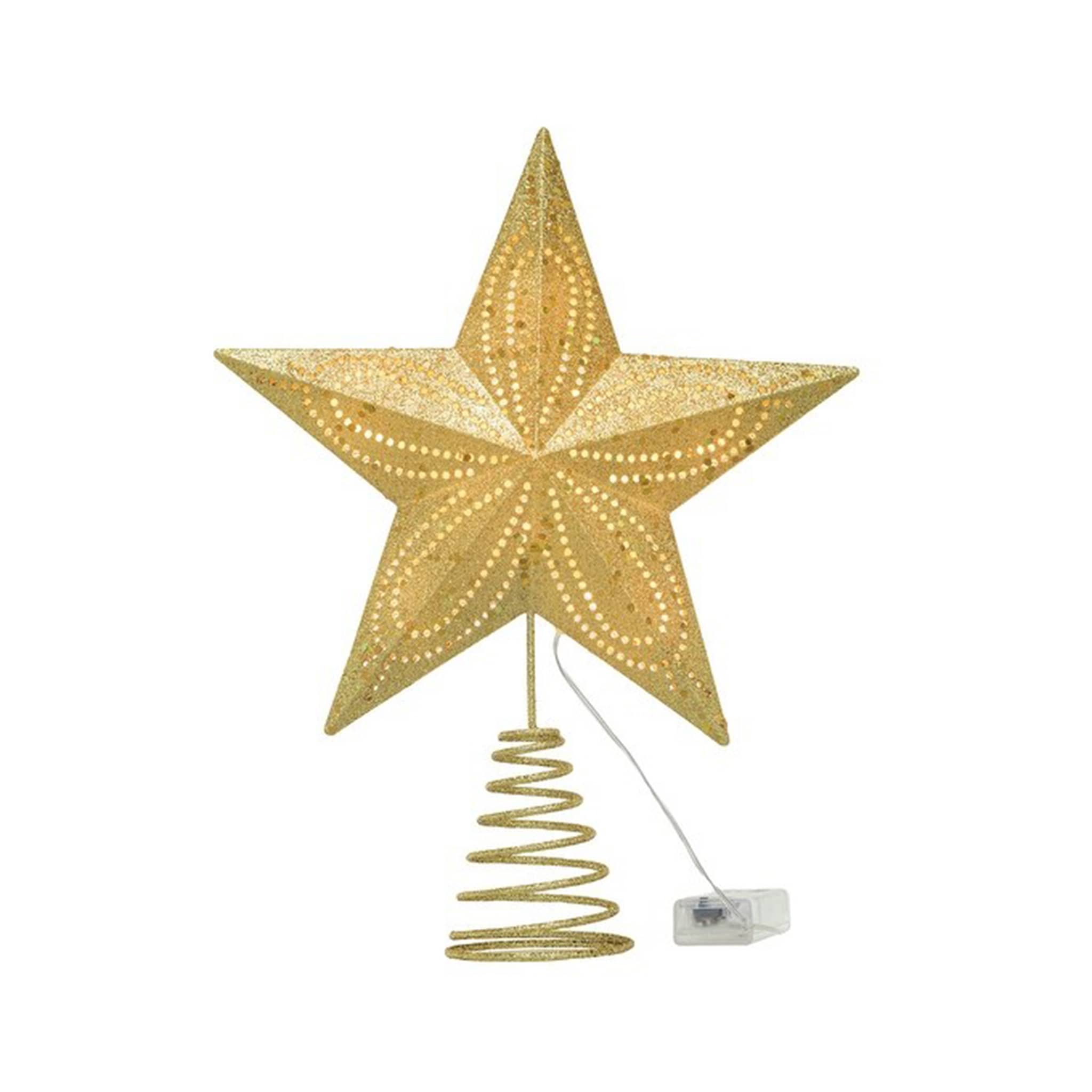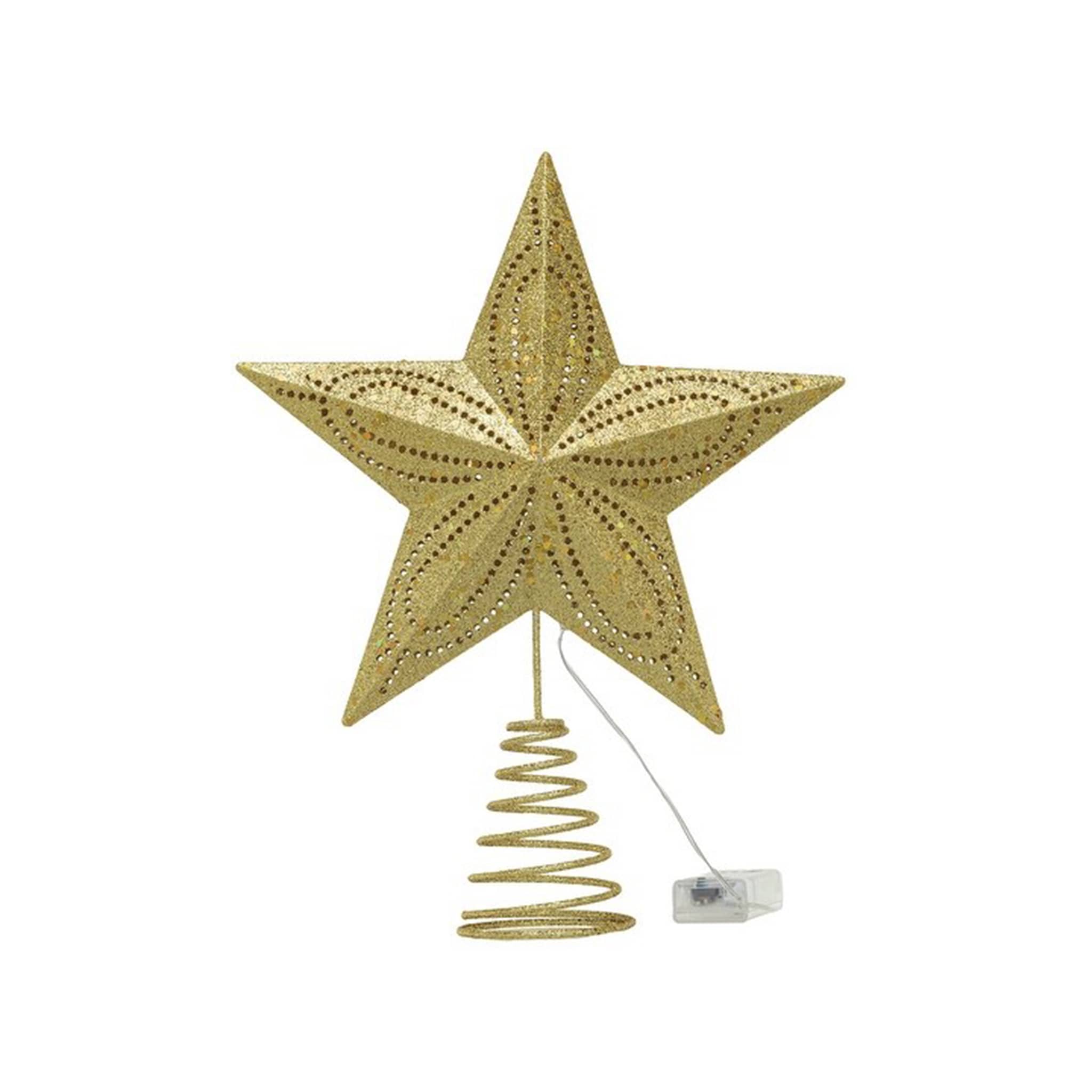 This Gold Star Tree Topper is a dazzling addition to the top of your Christmas tree! it features a classic star shape with charming cut-outs that illuminate with warm LED lights. The warm glow of the lights creates a magical and festive atmosphere atop the Christmas tree, while the beautiful gold finish adds an elegant touch. Made of lightweight plastic for easy placement, this tree topper is sure to become a cherished part of every holiday tradition. Please note that 2 AA batteries are required for operation (not included). Measures 10 inches wide x 2.75 inches deep x 12.5 inches tall.