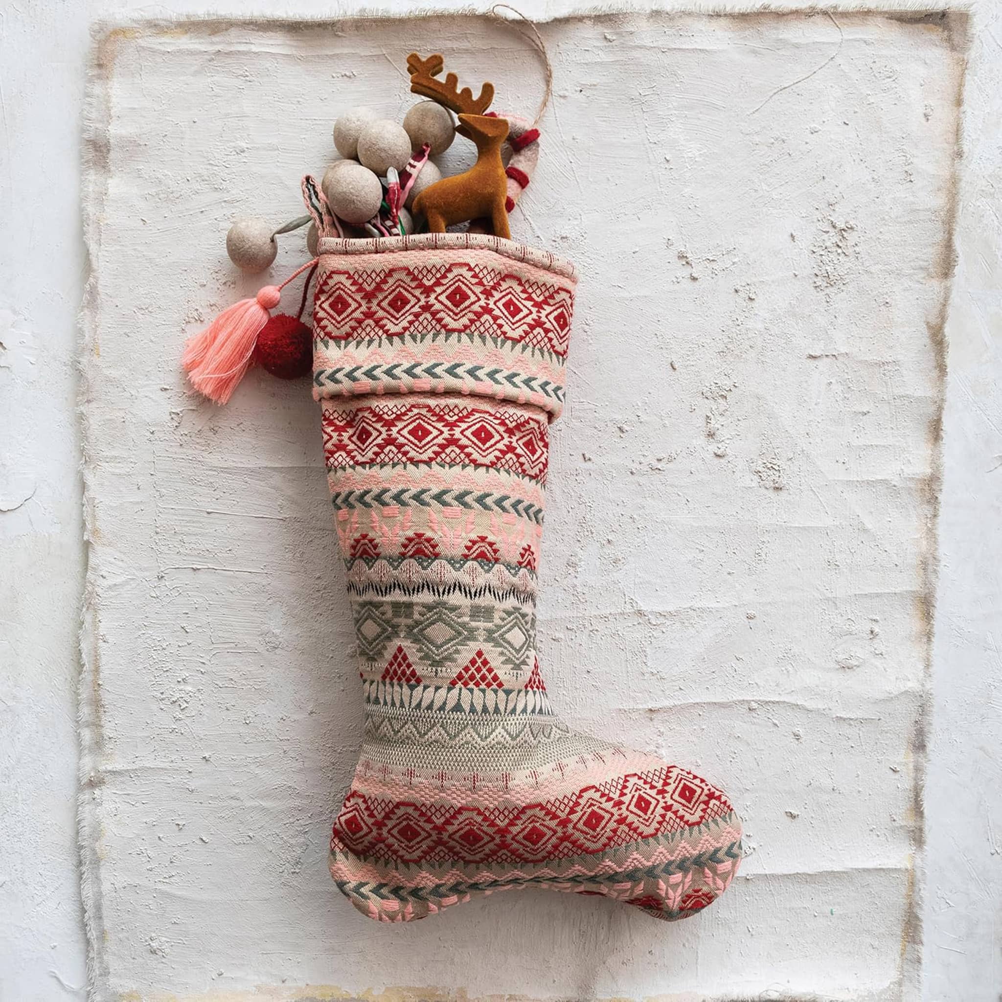 A luxurious tapestry of festive design, this Woven Acrylic Jacquard Stocking is detailed with metallic gold thread embroidery, complete with a tassel and pom pom in a rich multicolor palette. An opulent addition to any holiday decor, it's sure to bring a touch of sophistication and festive sparkle. This stocking, with its intricate pattern and golden accents, is perfect for hanging on the mantel or as a distinguished holiday feature. Made of a sumptuous blend of polyester and acrylic, it's crafted for both elegance and durability. Measures 20 inches tall.