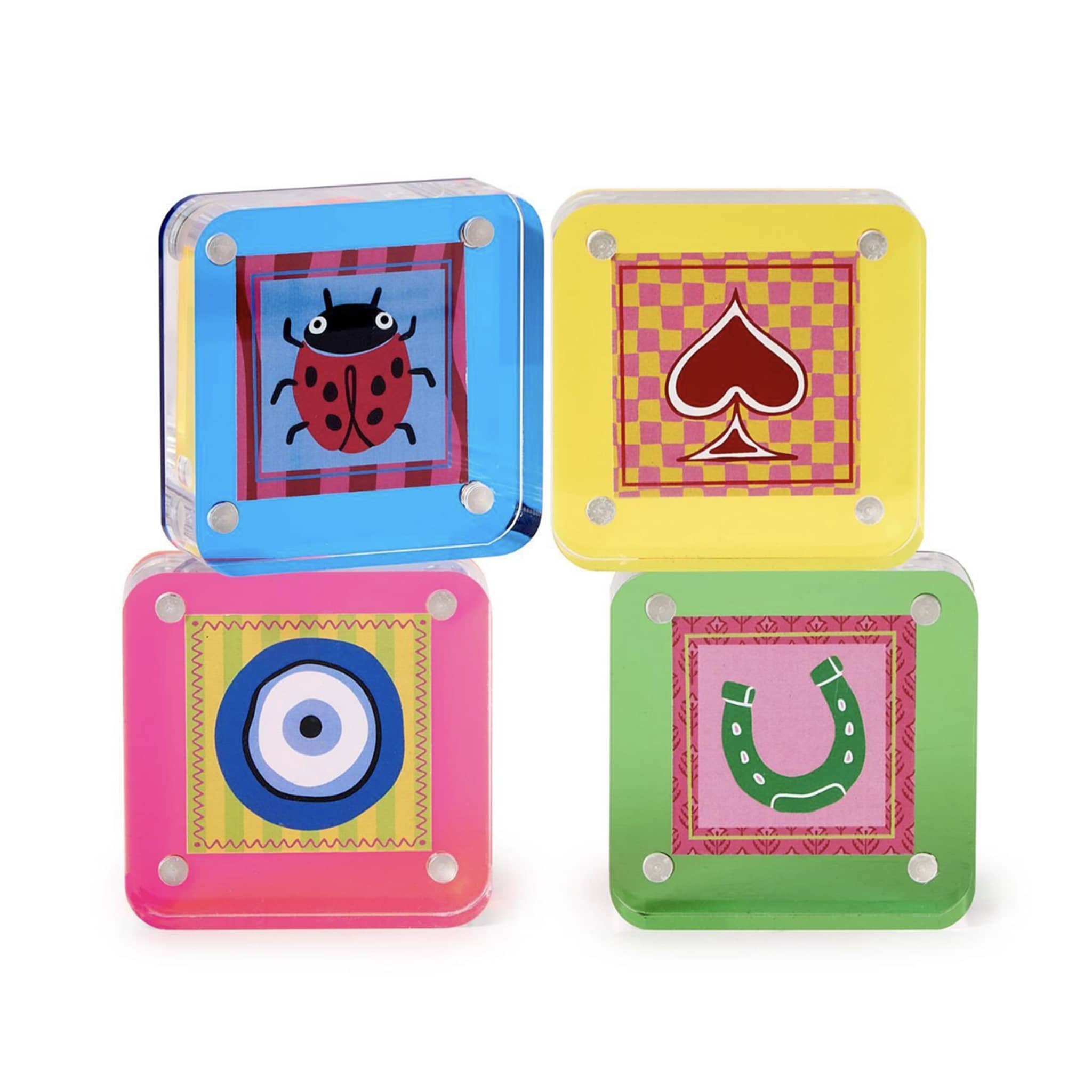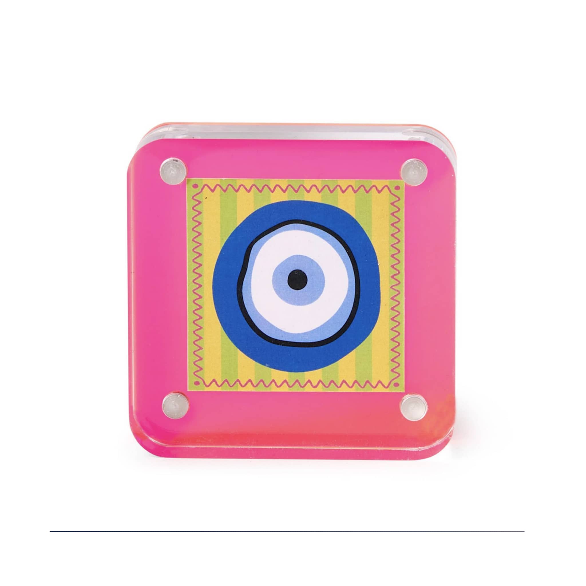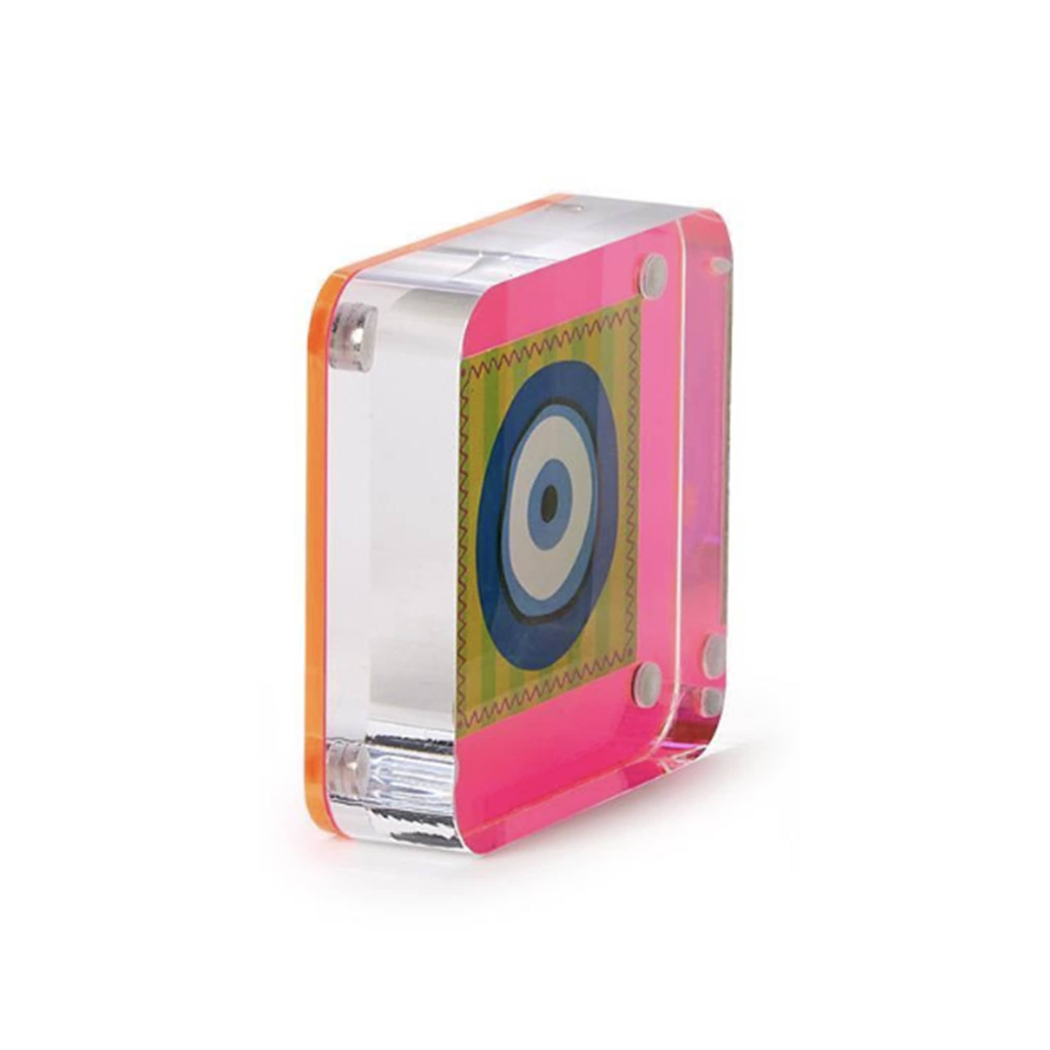 Add a vibrant flair to your space with this Color Pop 3x3 Mini Acrylic Photo Frame in Pink. Handcrafted from durable, premium acrylic, this frame is a stunning way to display your cherished artwork or showcase mini-sized photos. Perfect for adding a touch of fun to any shelf, desk, or gallery wall. Made up of two acrylic panels that attach using four industrial-strength magnets. You can also use it as a paperweight and keep the included good luck charm insert (a blue evil eye on a yellow and green striped background).