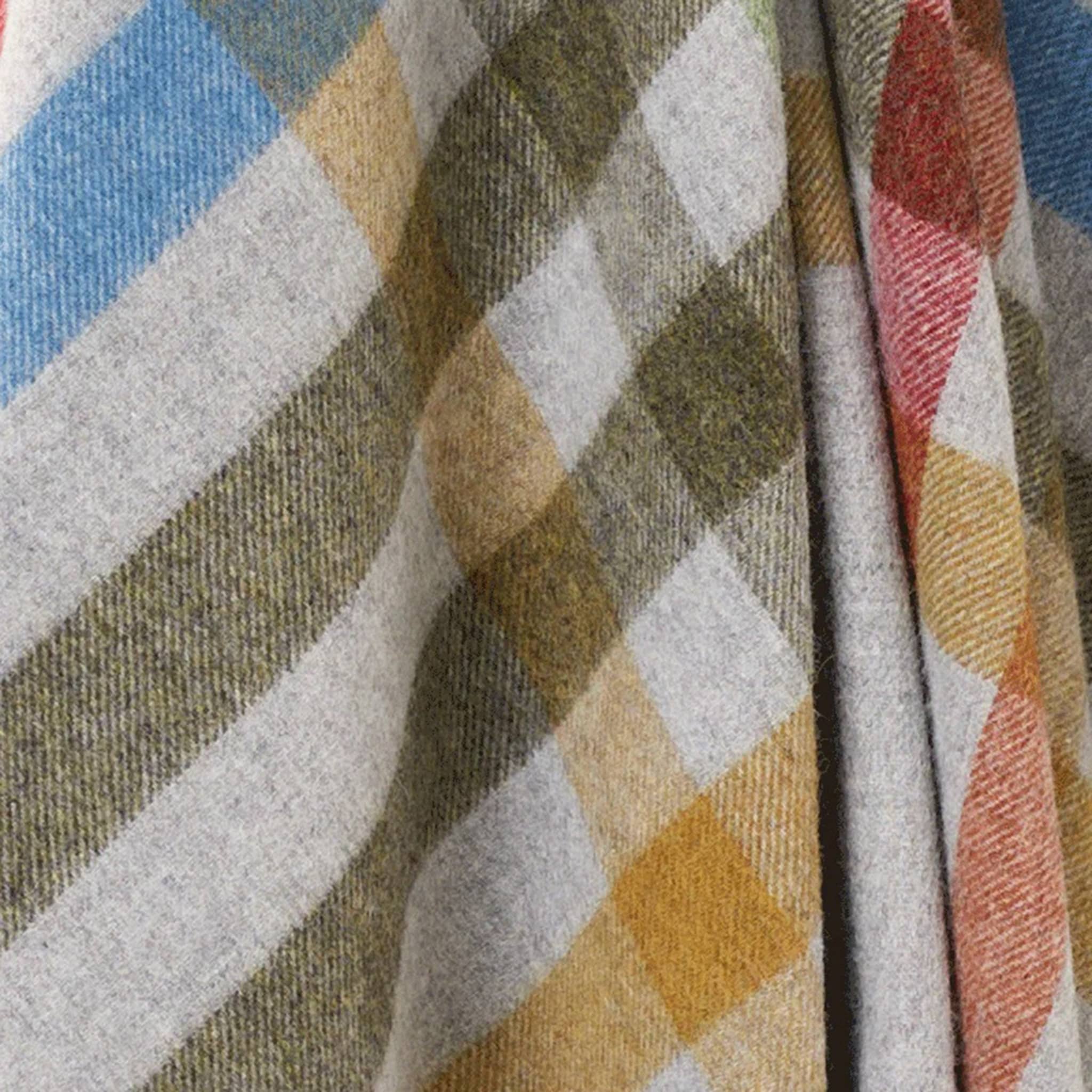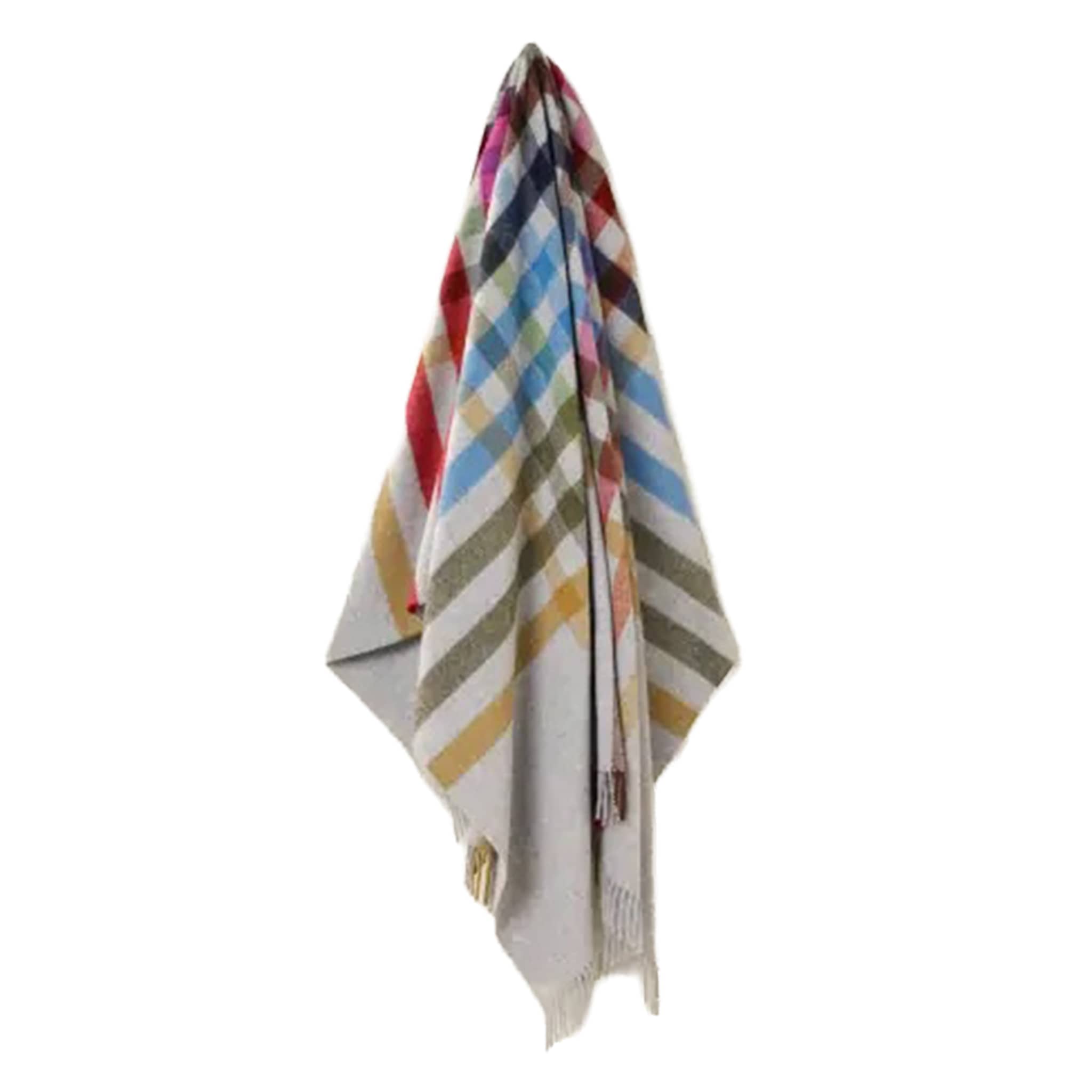 This Merino wool throw features a beautiful contemporary plaid design in shades of blue, green, yellow, and red complimented with the soft neutral grey backdrop. The wool blanket measures 55 x 72 inches, including fringe.