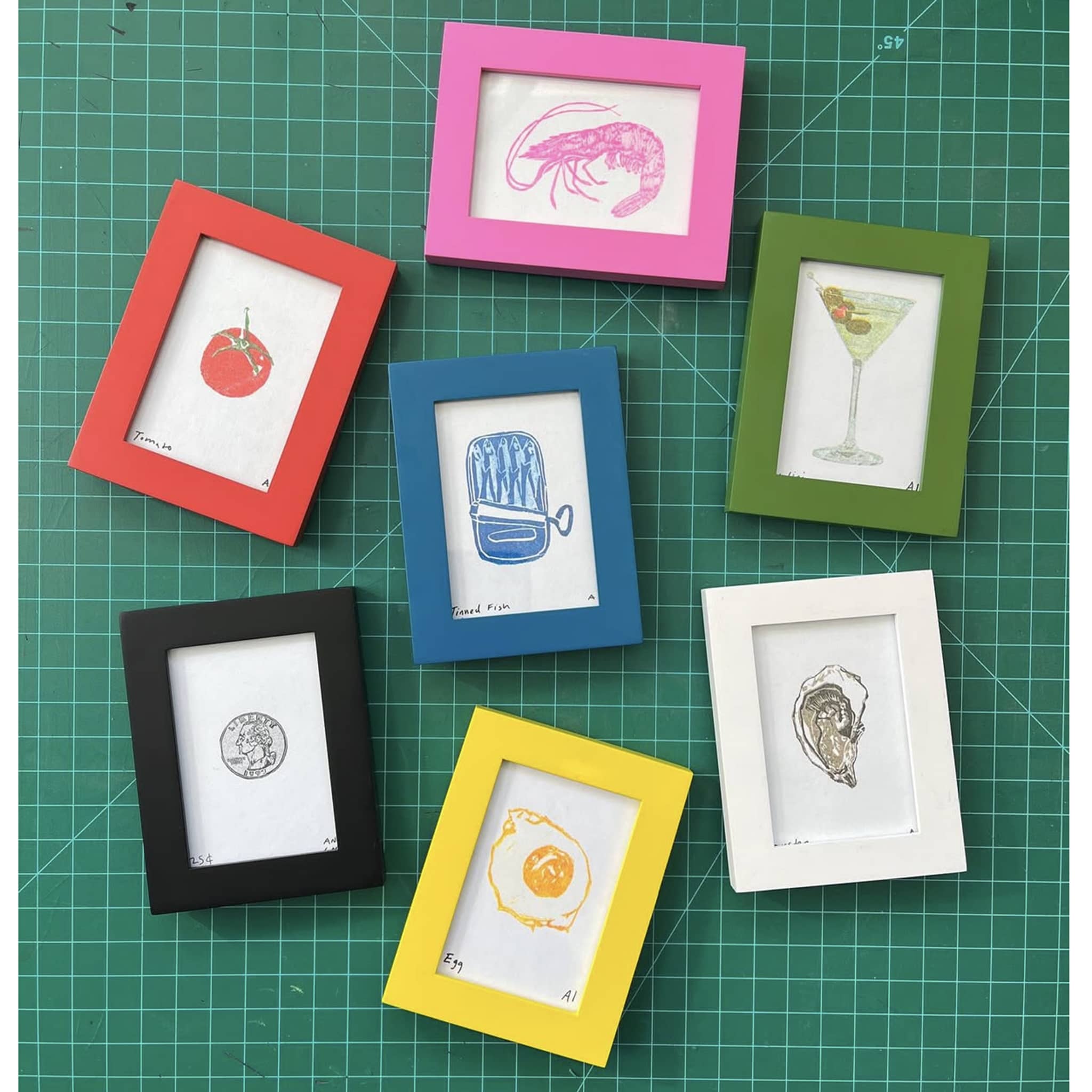 Looking for the perfect frame for all the mini prints you've collected? Look no further! Wood tabletop frame has an easel attached to the frame backing and can sit vertically or horizontally. Glass window measures 2.5 x 3.5 inches, overall frame size is 4.25 x 3.25 inches. Available in 7 colors: red, green, blue, yellow, pink, white and black. Each frame comes with 2 surprise prints!