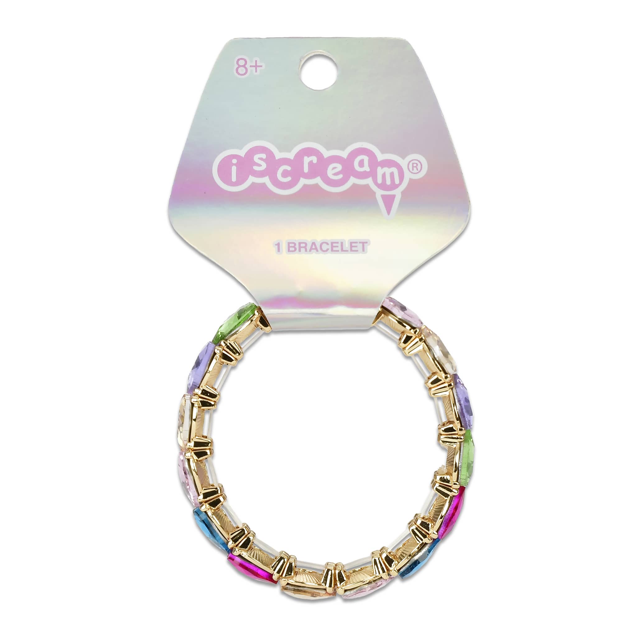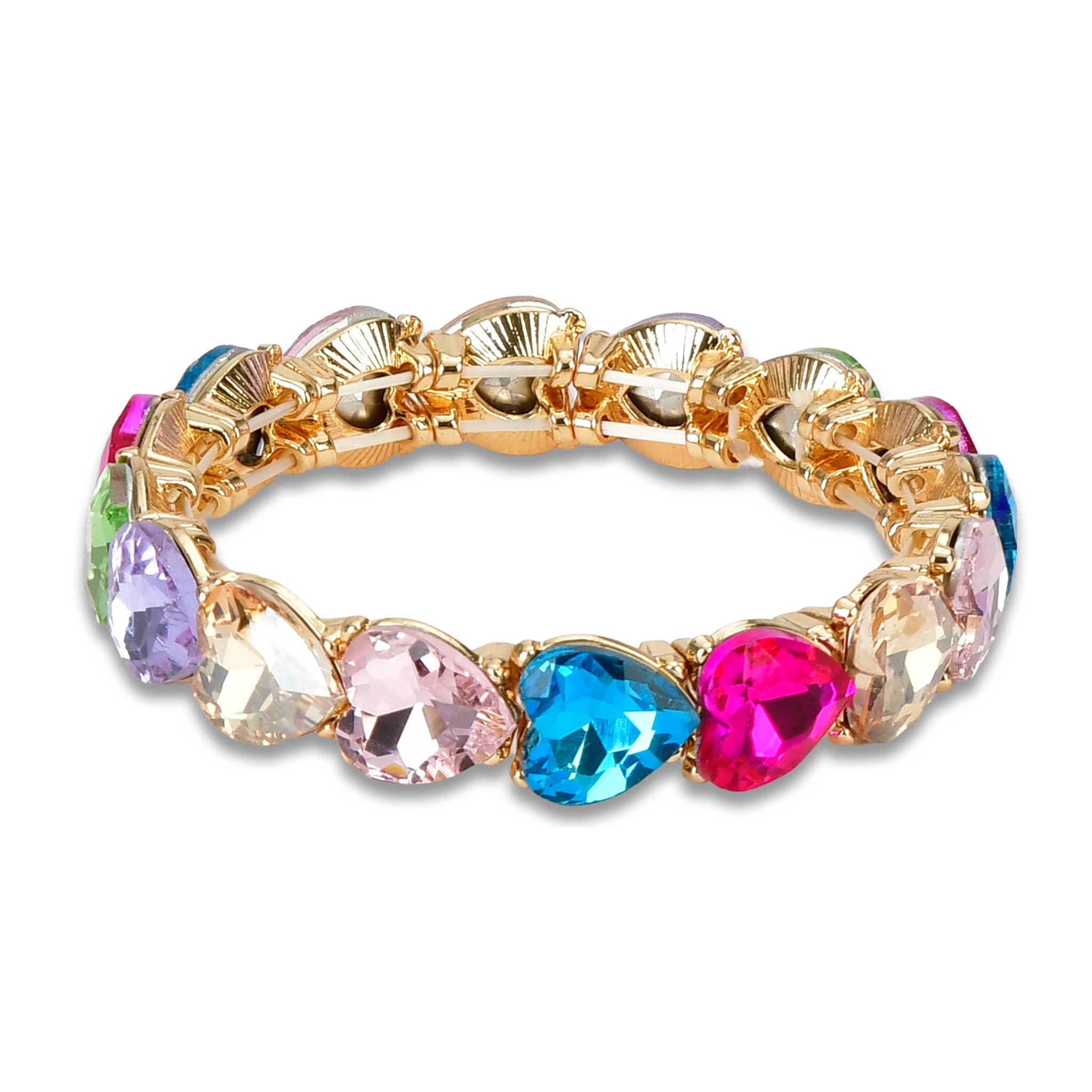 Add a pop of sparkle and color with this playful Rainbow Heart Bracelet for kids. Made from colorful interlocking heart-shaped rhinestones, this bright and cheerful bracelet shines with every movement. The hearts are strung together on a clear elastic cord for a comfortable, flexible fit, making it easy to slip on and off. Designed in a one-size-fits-all style for kids, it’s perfect for everyday wear, parties, dress-up, or gifting. A fun and eye-catching accessory that’s full of love and rainbow charm. Suitable for ages 8 and up.