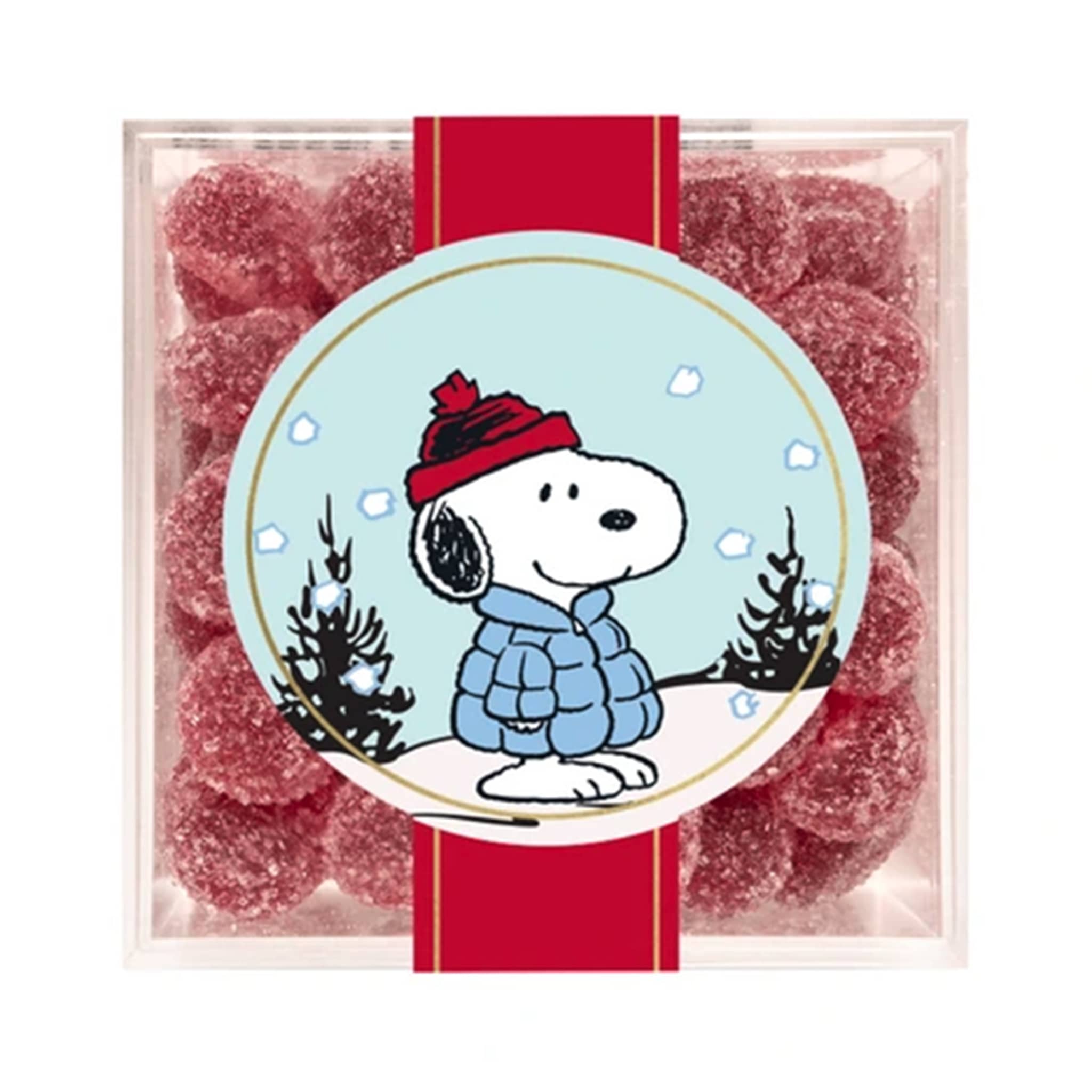 Celebrate the season with these cranberry gummies sparkling with sugar - just the kind of snack Snoopy loves! These red gummy treats are packaged in a small clear acrylic cube with Snoopy in a winter scene on top and secured with a red ribbon sticker. These gummy candies are fat-free and contain no GMO's or artificial colors. Great for holiday party favors or stocking stuffers!