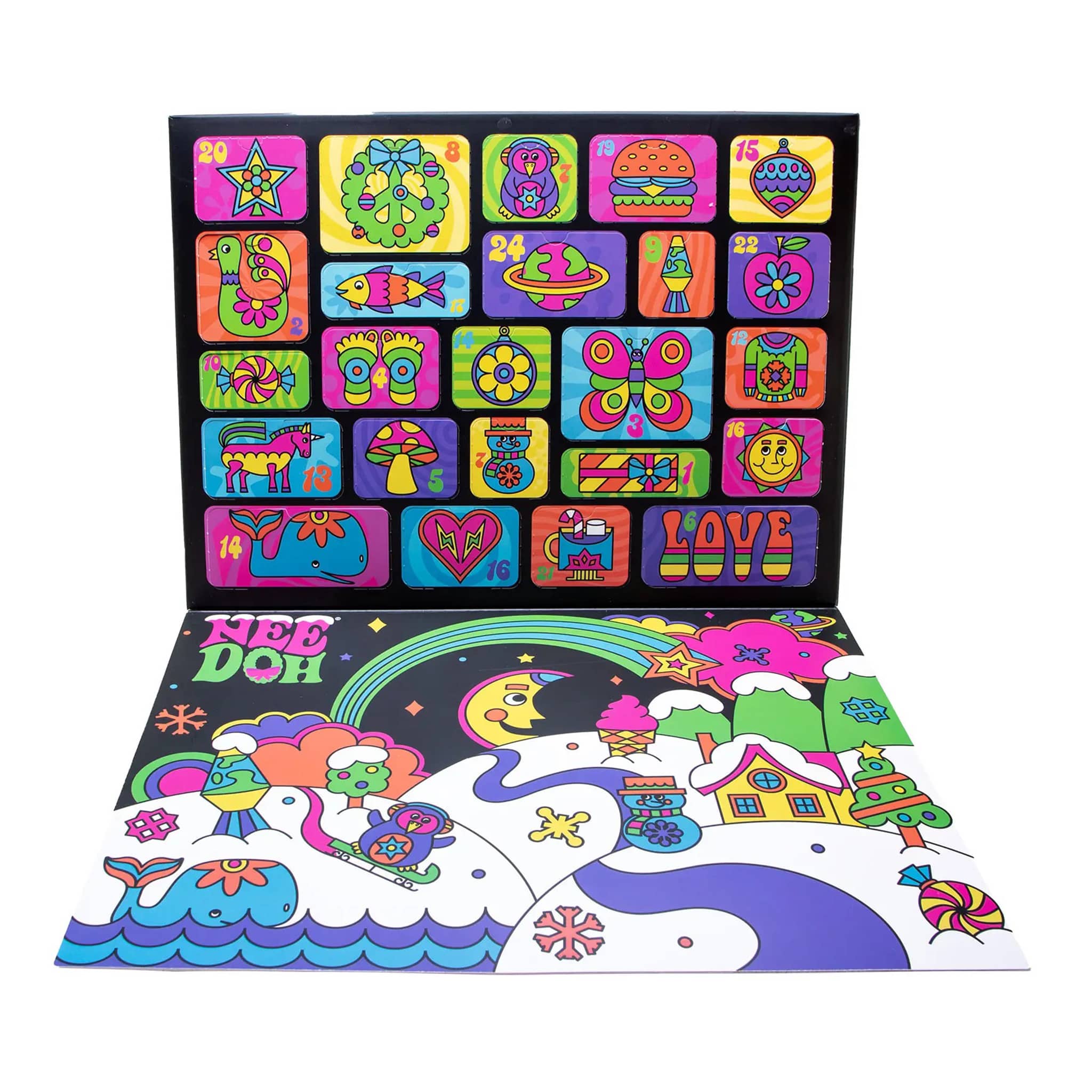 ‘Tis the squeezin’! Celebrate the holidays with a daily dose of fun from the NeeDoh Squishmas Advent Calendar! Pop open each door to uncover a bright mini sensory sensation in fun, vibrant colors. A mini NeeDoh toy, with squishies, new shapes, and groovy textures, awaits you every day as you countdown to Squishmas Eve. The advent calendar contains 24 super fun surprises in all. It's a great way to keep the holiday spirit groovy! Each toy measures approximately 1.25 inches tall. calendar measures 15 x 11 x 2.5 inches. Suitable for ages 3 and up.