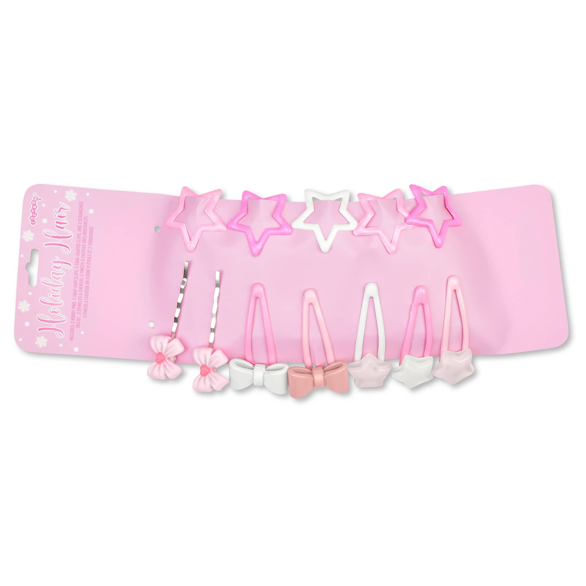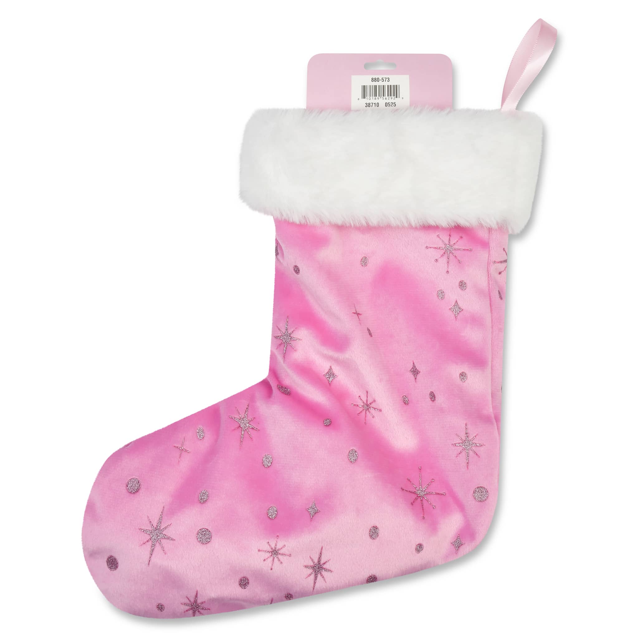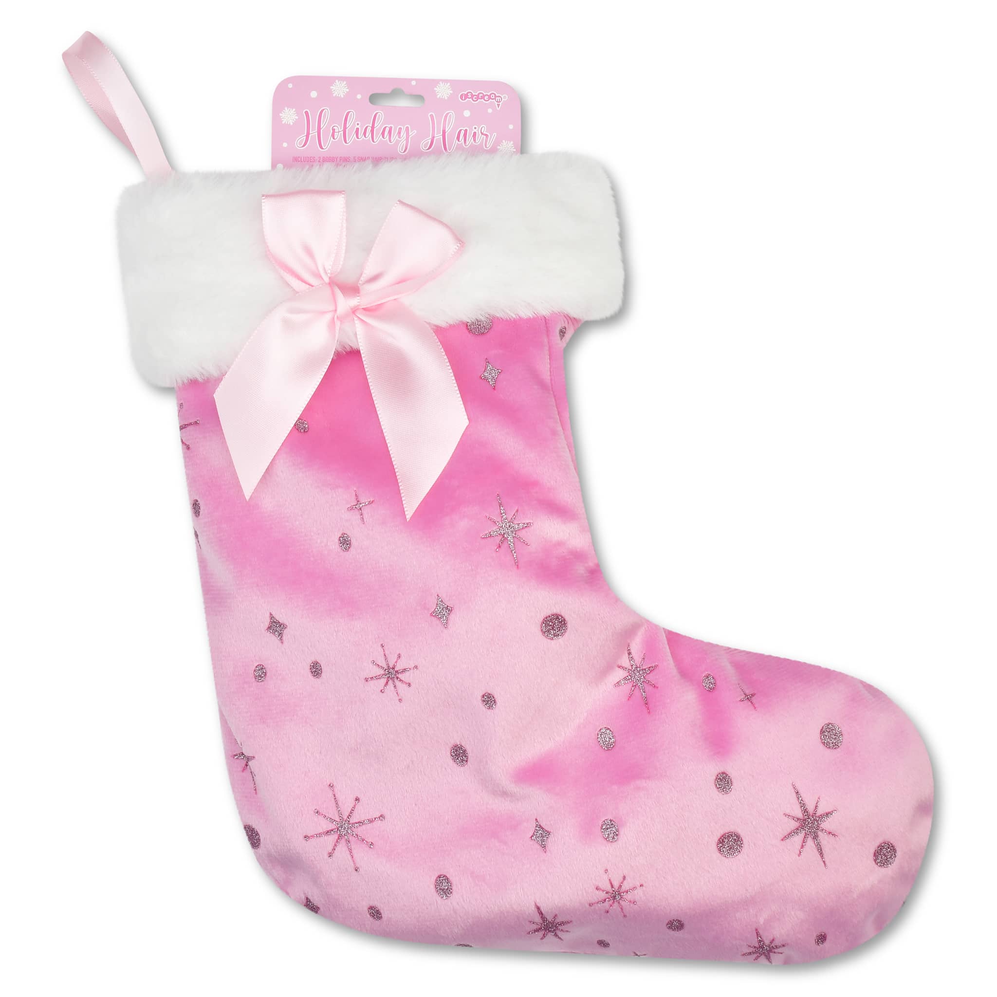 A stocking with its own stuffer! This adorable pink stocking features glittery stars, a blush pink bow, a blush pink hang loop, and a fluffy white cuff. Inside, you'll find 2 bow bobby pins, 2 bow snap hair clips, 3 star snap hair clips, 5 star-shaped clips, and 2 scrunchies. Suitable for ages 5 and up.