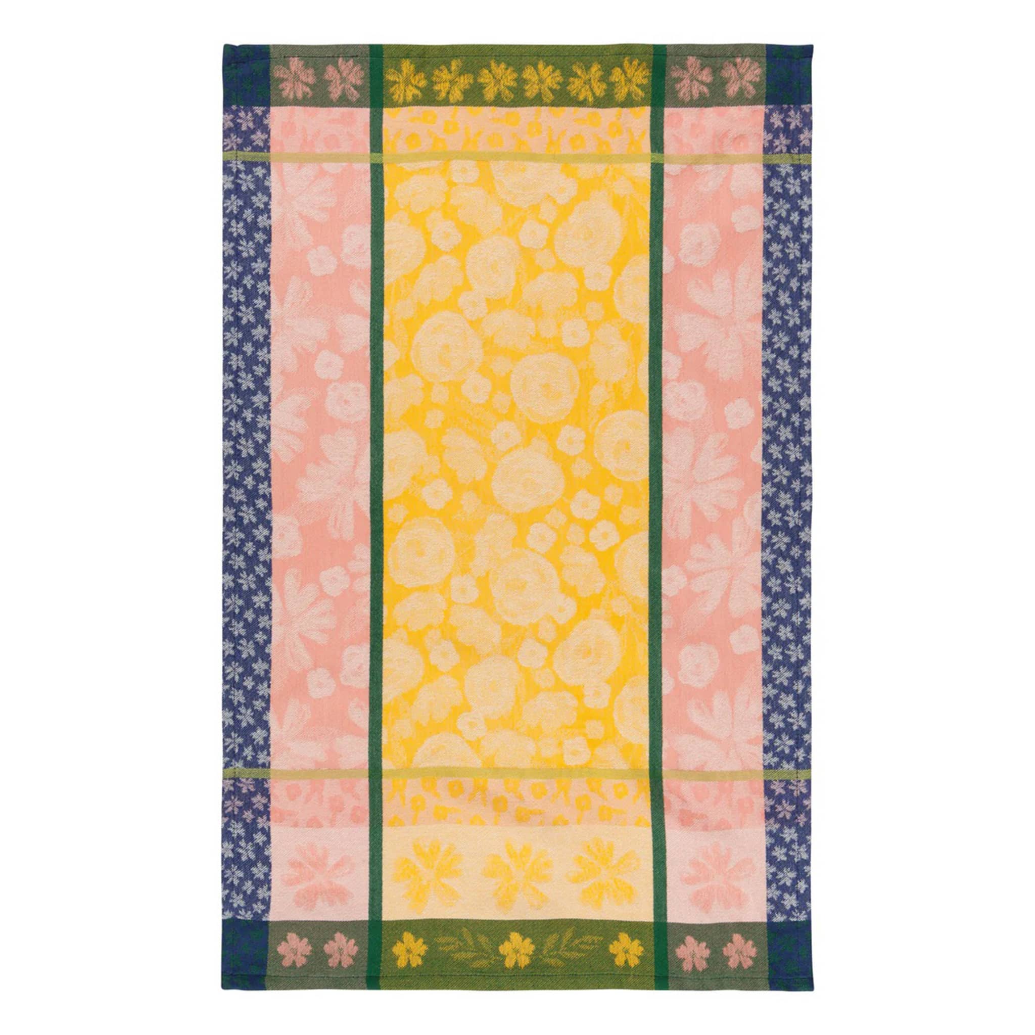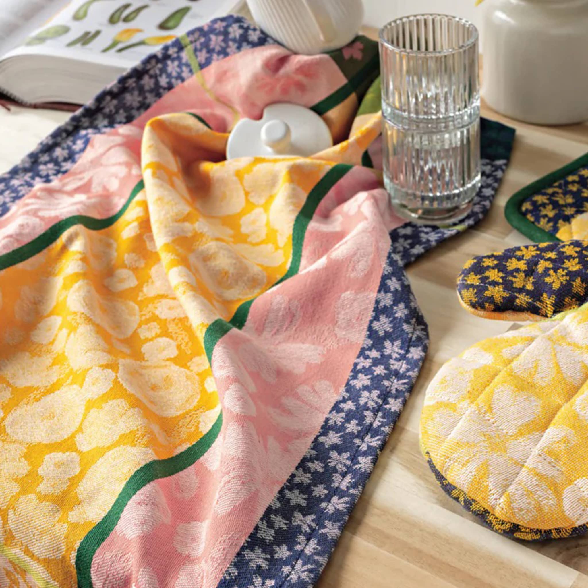 Fresh floral flowers thrive with this Full Bloom Jacquard Dishtowel. This expertly woven towel offers a sumptuous look and feel that's durable and soft. A classic design is interwoven into the yarn-dyed, 100% cotton fabric to create a timeless pattern in a thick, absorbent towel. Let the perennial beauty and reliable performance of this jacquard towel grace your kitchen for years of regular use. The Full Bloom print features joyfully rendered daisies, peonies, and other garden favorites, with a contemporary color palette of dusk blue, marigold, and coral. Kitchen towel measures 18 x 28 inches. Care Instructions: Machine wash warm, tumble dry on low setting.
