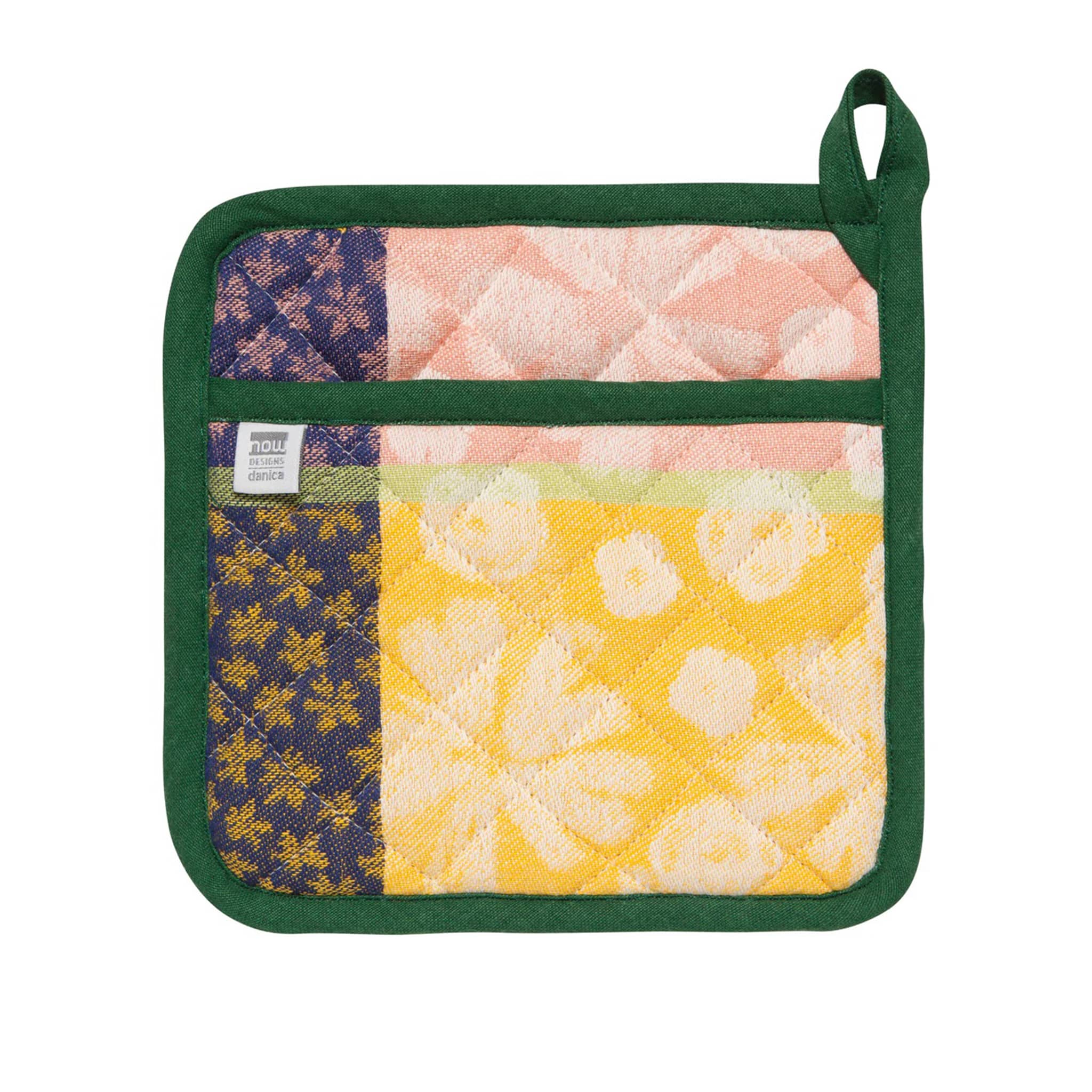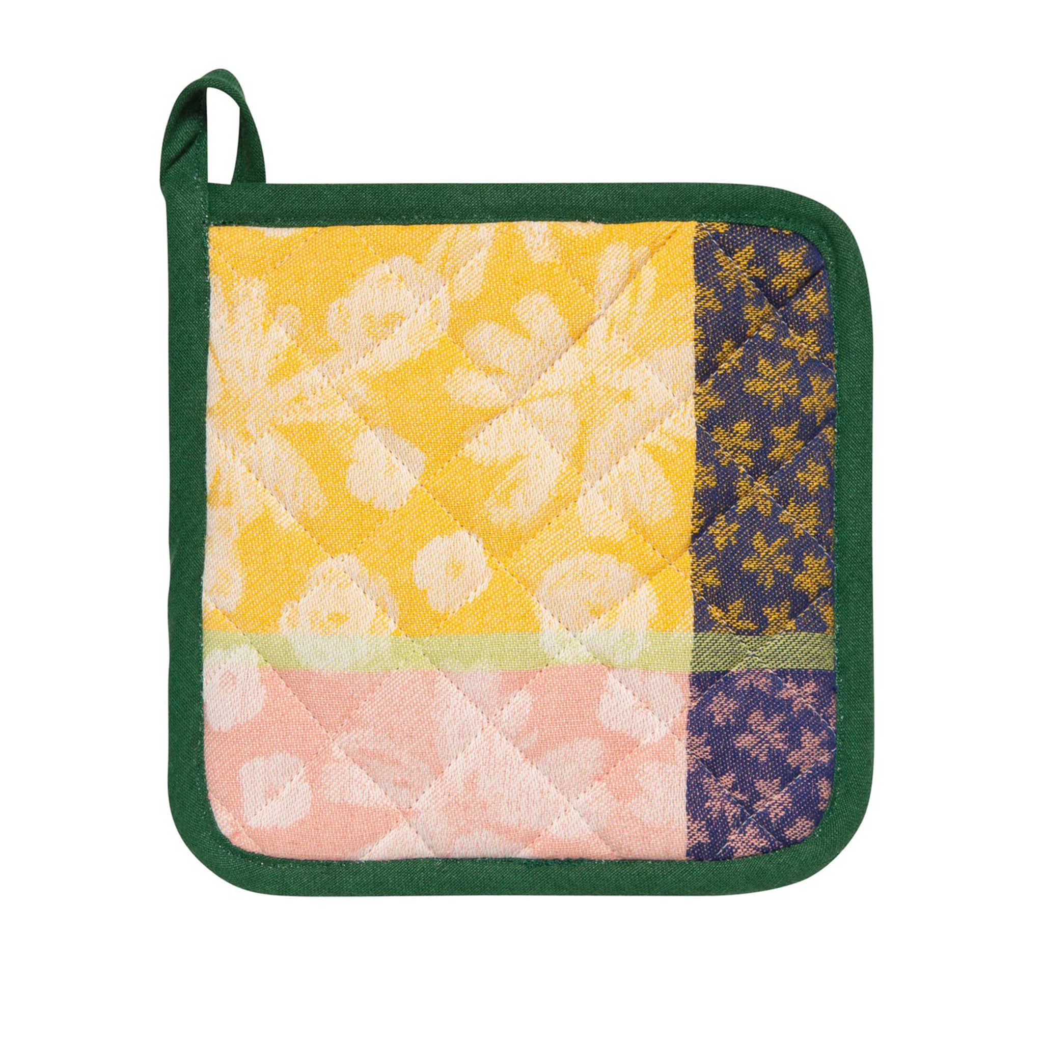Fresh floral flowers thrive with this Full Bloom Jacquard Potholder. This classic pot holder offers major heat protection while lifting and moving items from your stove or oven. The Full Bloom print features joyfully rendered daisies, peonies, and other garden favorites, with a contemporary color palette of dusk blue, marigold, and coral. Measures 8 x 8 inches. Made from 100% cotton with a 100% polyester fill. Care Instructions: Machine wash warm, tumble dry on low setting.