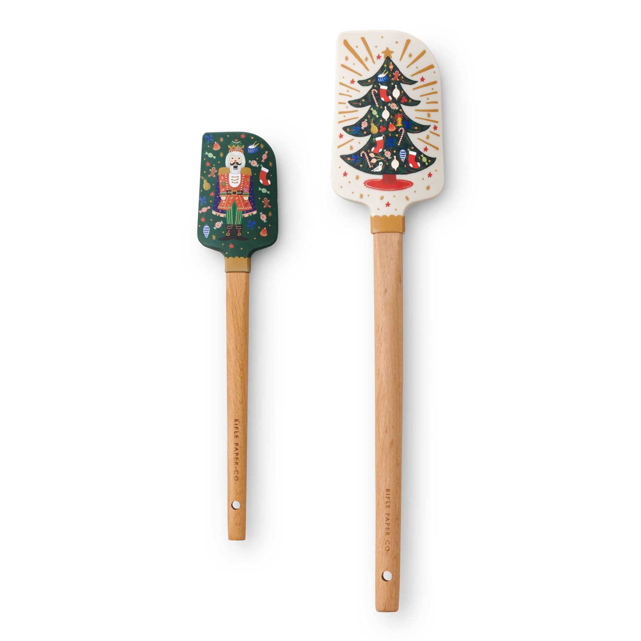 Rifle Paper Co.'s set of two silicone rubber spatulas is perfect for whipping up treats for Santa! Features characters from their signature Nutcracker holiday print on a green or white backdrop. The beechwood handles have the Rifle Paper Co. logo printed on them and a hole for hanging. The silicone rubber spatulas are BPA-free and heat-resistant up to 300 degrees Fahrenheit. Hand wash only. Small spatula measures 1.8 x 9 inches, large spatula measures 2.5 x 13 inches.