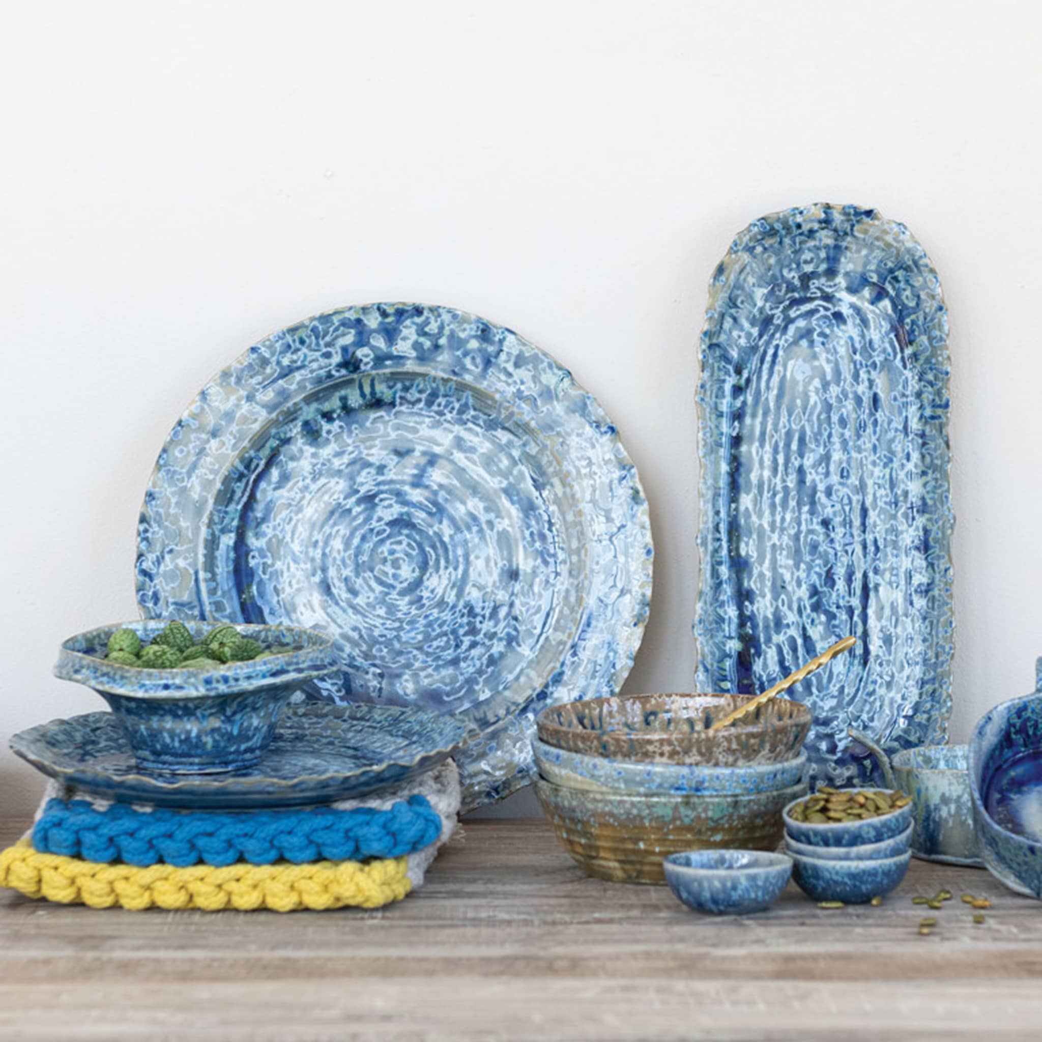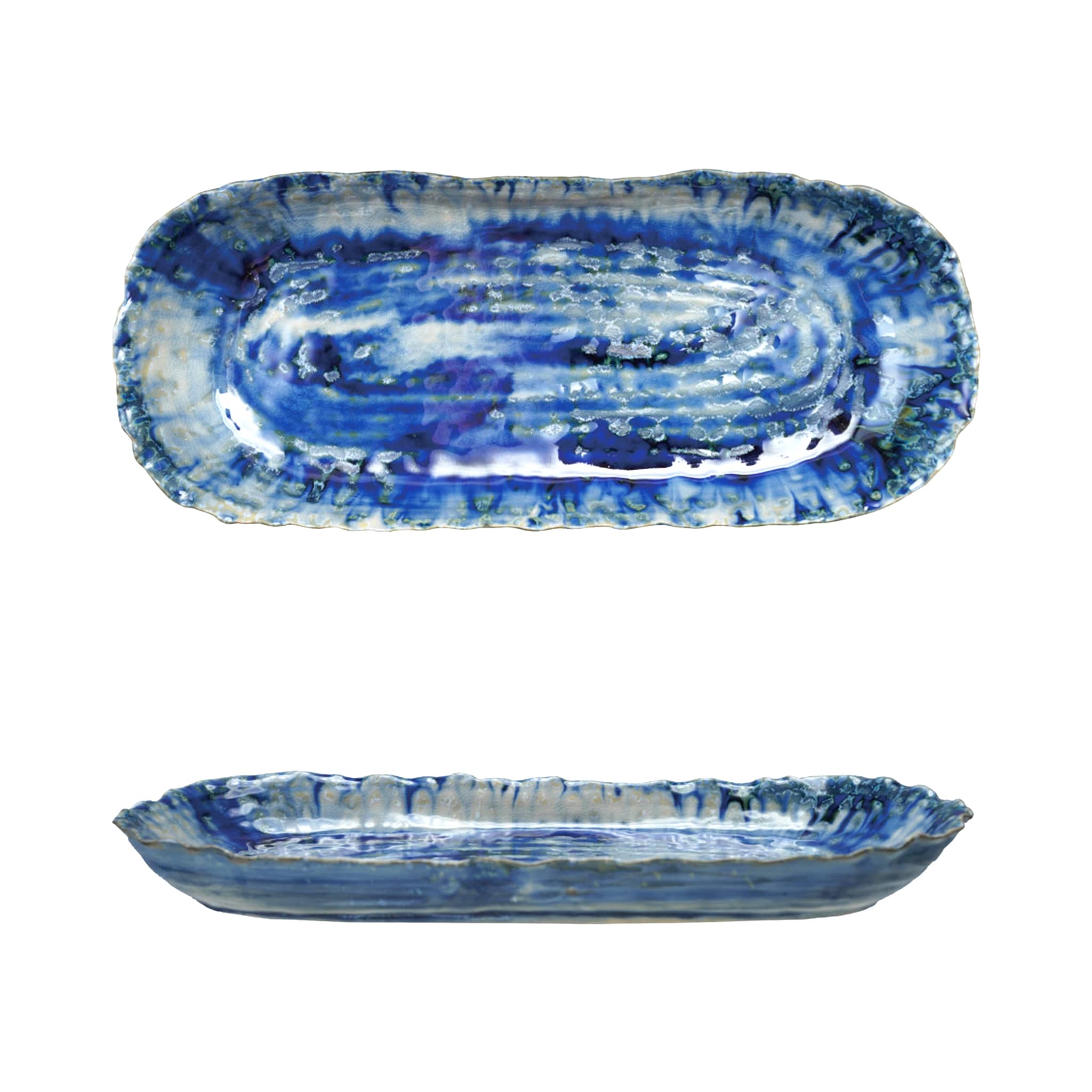 Elevate everyday serving with this oval, organically shaped stoneware platter finished in a stunning blue reactive crackle glaze. Each platter is truly one of a kind, with natural variations in color, texture, and crackle pattern that highlight its handcrafted character. The softly irregular silhouette adds an artful touch to your table, making it as beautiful on display as it is in use. Measuring approximately 13.25 inches long, 5.75 inches wide, and 1.5 inches tall, it’s perfectly sized for appetizers, small bites, or decorative styling. A timeless statement piece that brings depth, texture, and artisanal charm to any table.