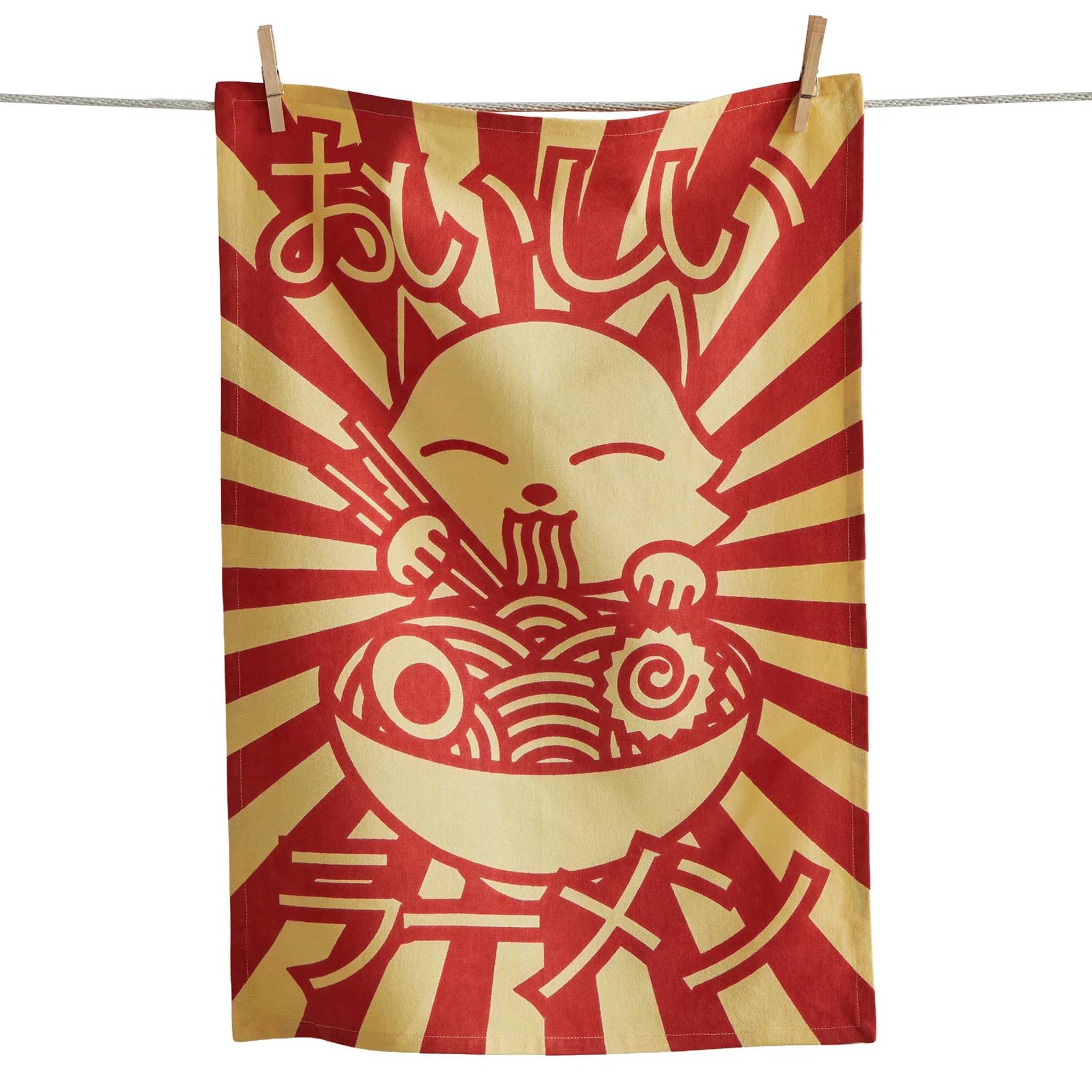 Bring instant joy to your kitchen with this vibrant 100% cotton dish towel featuring a ramen-slurping cat and sunburst graphics. Designed in eye-catching shades of red and soft yellow, this colorful kitchen towel brings artful, Asian-inspired style to everyday tasks.