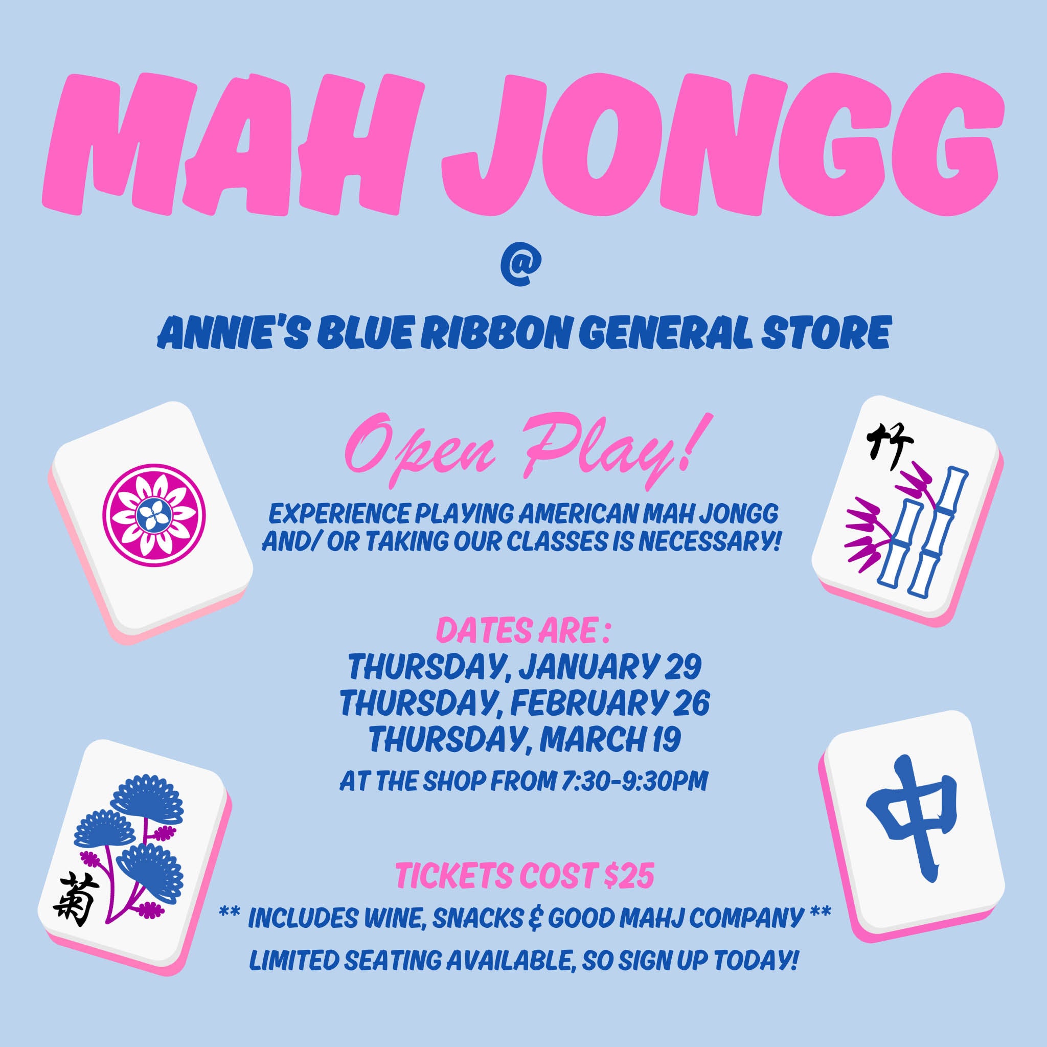 *Please note, Mah Jongg requires a certain amount of people to play so if you sign up it's important you show up so everyone has a chance to play!