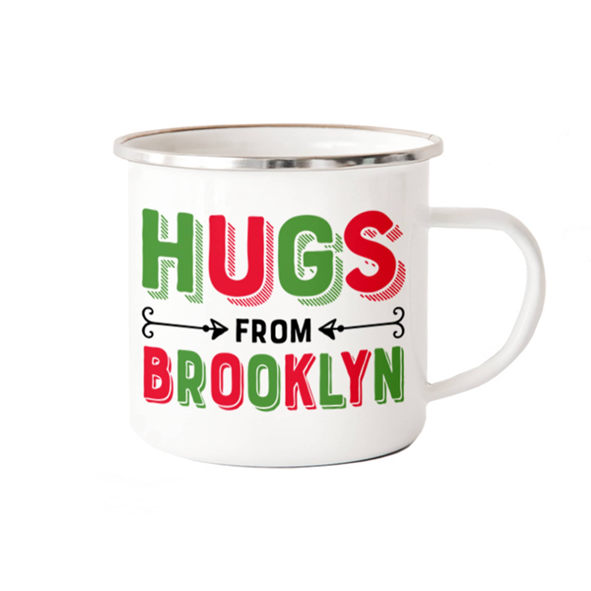 The perfect mug for daydreaming about your next getaway or serving guests coffee during the holidays! The 10-ounce stainless steel camp mug with white enamel has "Hugs from Brooklyn" on the front in green and red. The interior of the mug is white and it has a silver rim. Dimensions are 3 x 3 inches, hand wash only, not microwave safe. Makes a great gift for friends and family too!