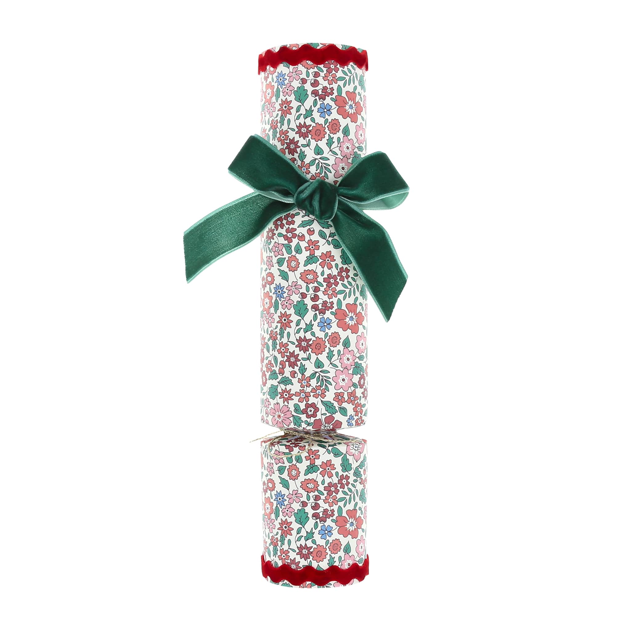 Includes 6 party crackers, each with a different Liberty floral print in festive hues and a soft velvet bow in red, pink, blue or green. Each cracker contains a gold foil paper crown, a joke, and a Liberty tree decoration. The tree decorations are star-shaped and made with Liberty printed paper, teamed with soft velvet bows, matte gold foil details, and a gold thread hanging loop. Crackers measure 9.5 inches tall x 2 inches in diameter. Suitable for ages 14 and up.