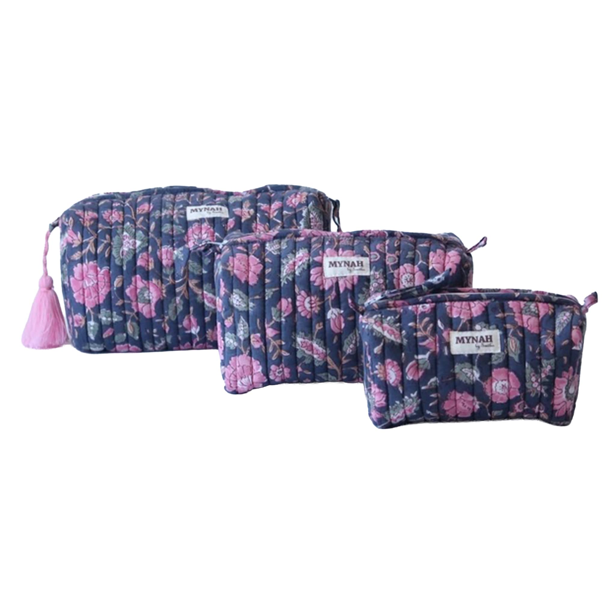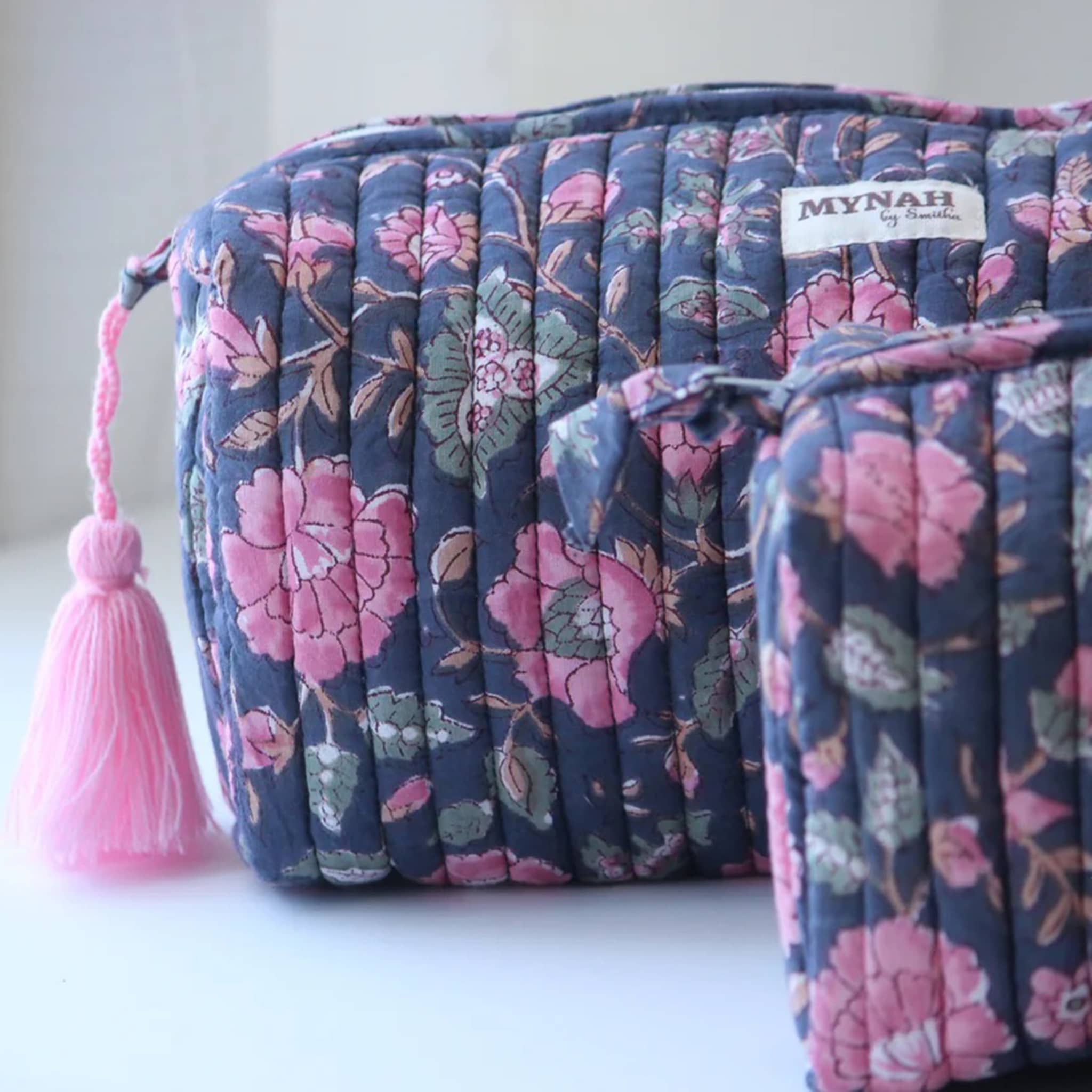 Travel bag features the Indian Rose Garden print with a pink and green flower print on a navy blue background. The print is hand-blocked on a 100% cotton base. Comes with a pink handmade tassel. Machine washable in cold water and tumble dry when needed. Wipe clean for a quick clean-up. Medium bag measures 8 x 4 x 4 inches.