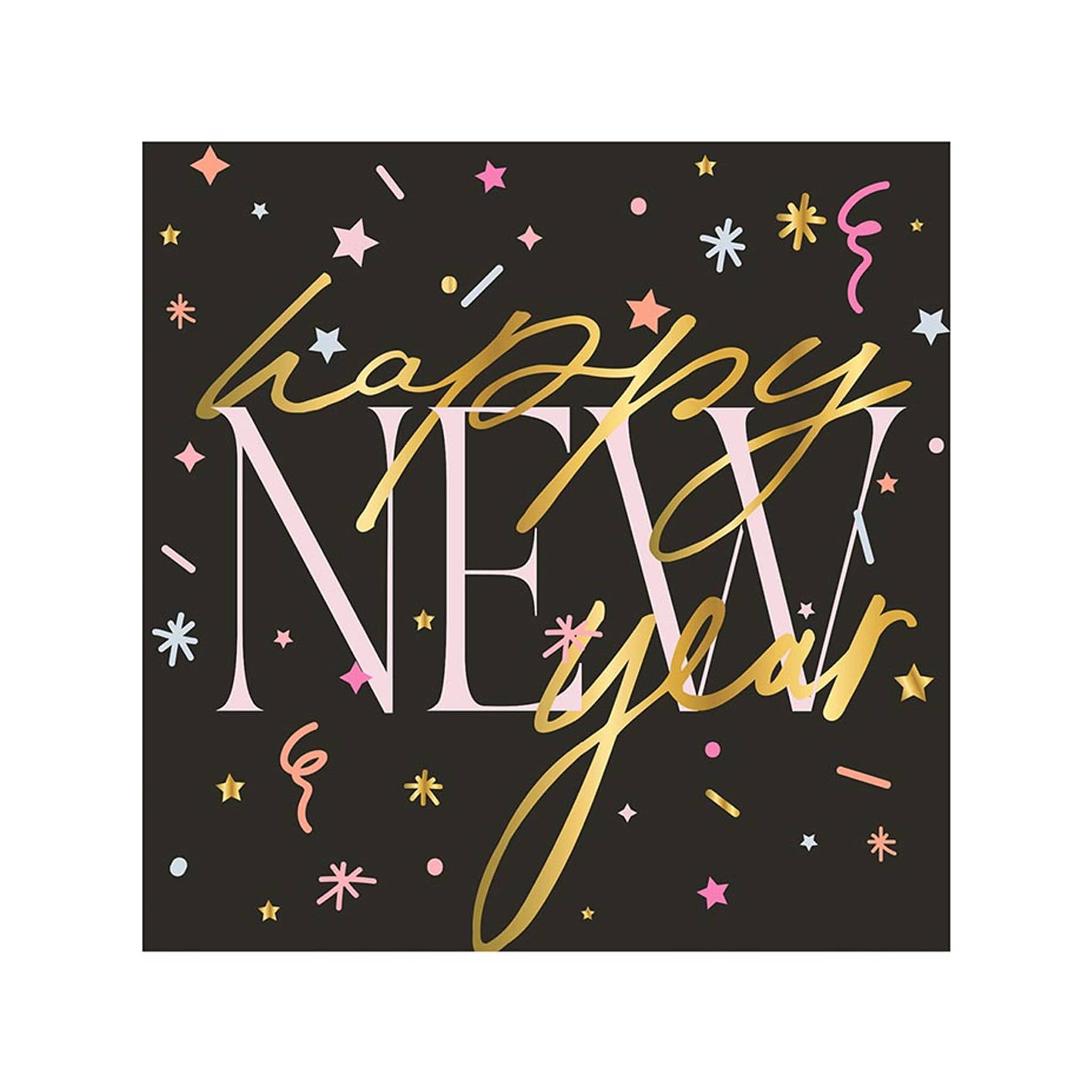 Celebrate the New Year in style with these cute and decorative party beverage napkins! Durable and disposable for easy clean-up once the festivities are over. Black napkin with "happy new year" in gold foil lettering with colorful shaped confetti. Pack of 20 napkins, each measures 5 inches square folded, not microwave safe.