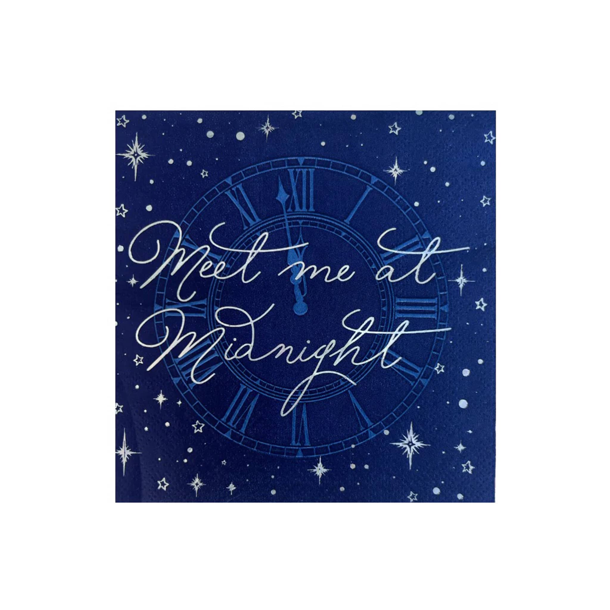 Welcome the New Year with elegance and charm with these "Meet Me At Midnight" small paper napkins. Designed to capture the excitement of the countdown, they feature a sophisticated midnight-blue palette with shimmering silver accents. Create a magical atmosphere and make every moment special as you ring in the New Year with style. Pack contains 20 beverage napkins, each measures 5 inches square when folded. Not safe for microwave use.