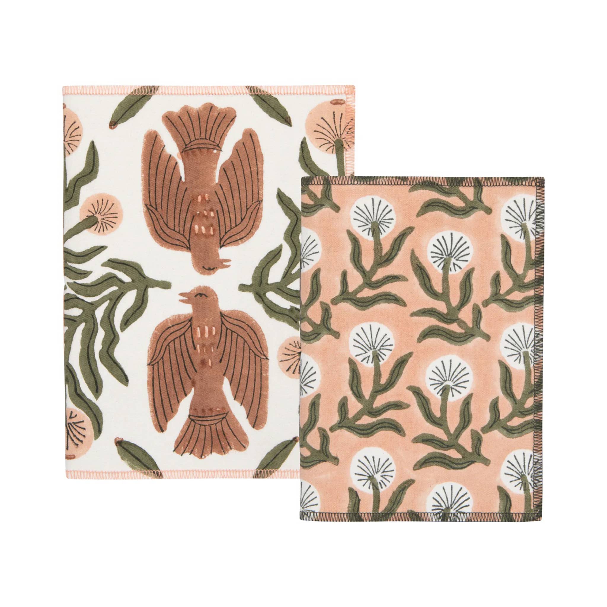 Set of 2 notebooks, each with a 100% cotton cover that's printed with a unique design. The notebooks measure 6 x 8 inches and 5 x 7 inches and include 50 ruled pages each.