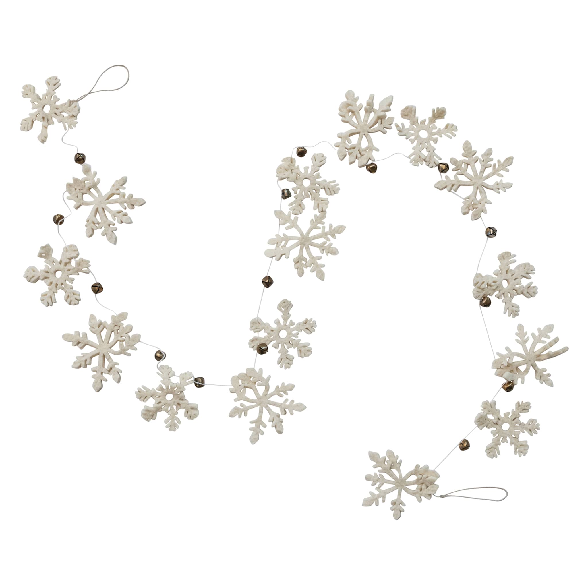 Add a touch of handmade elegance to your holiday décor with this cream wool felt snowflake garland featuring gold-finish metal bells. Each soft felt snowflake is beautifully crafted for a cozy, festive look, while the bells add a hint of holiday cheer. Measuring 72 inches long by 4.5 inches tall, this garland is perfect for draping along a mantel, window, or staircase for a timeless seasonal accent.