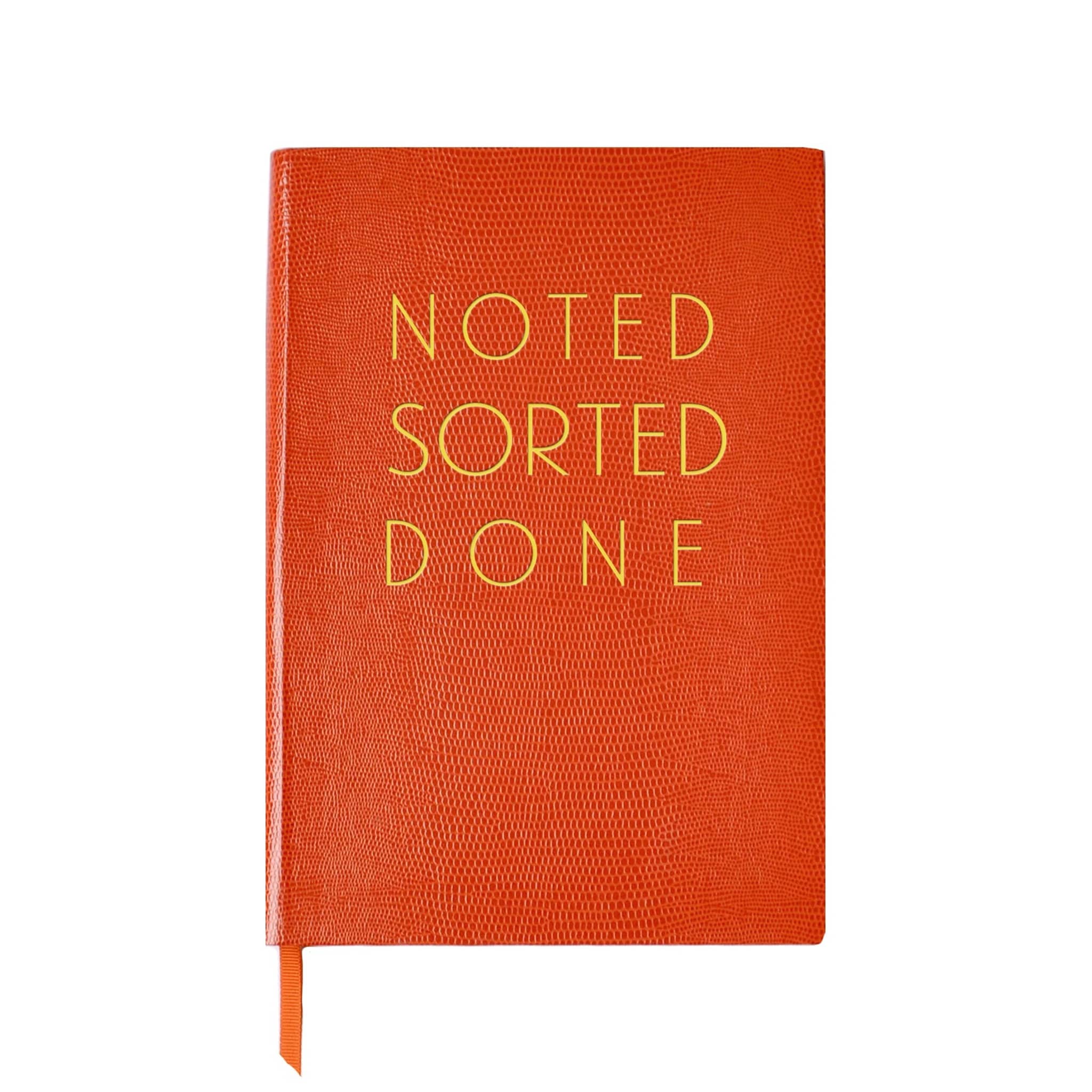 A chic pocket journal with "Noted, Sorted, Done" embossed in gold foil lettering on the orange faux lizard cover. Features gold edges and a grosgrain ribbon page marker to keep your place. Includes 72 cream unlined pages. Notebook measures 5.9 x 3.9 inches.