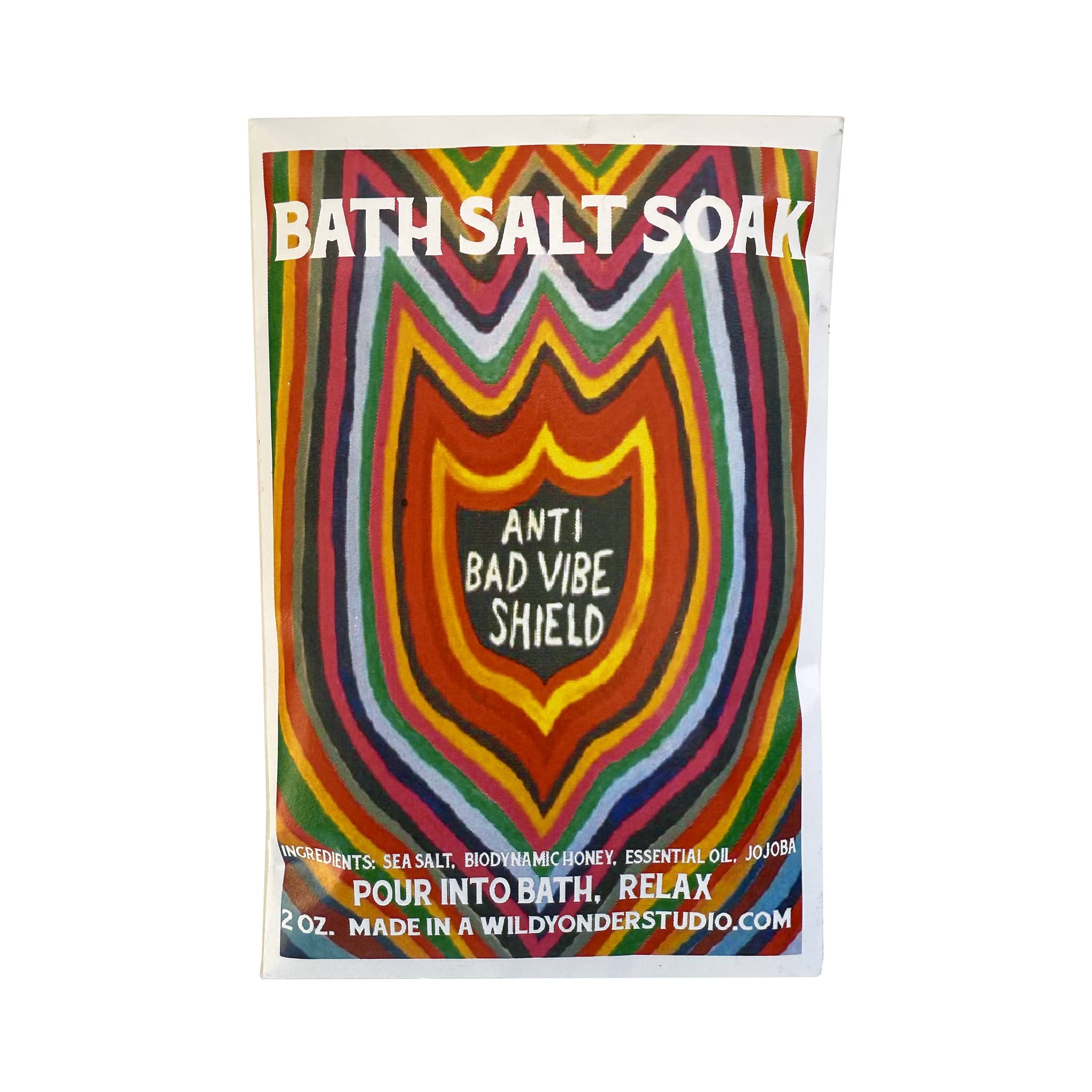 A mixture of crystal quartz charged Sea Salt, Himalayan Sea Salt, Epsom Salt, Biodynamic Organic Honey, Organic Bulgarian Rose Otto, Royal Hawaiian Sandalwood and Organic Jojoba. No synthetics. Each packet contains 2 ounces of soak, enough for 1 bath. Made in the USA by Wild Yonder Botanicals.