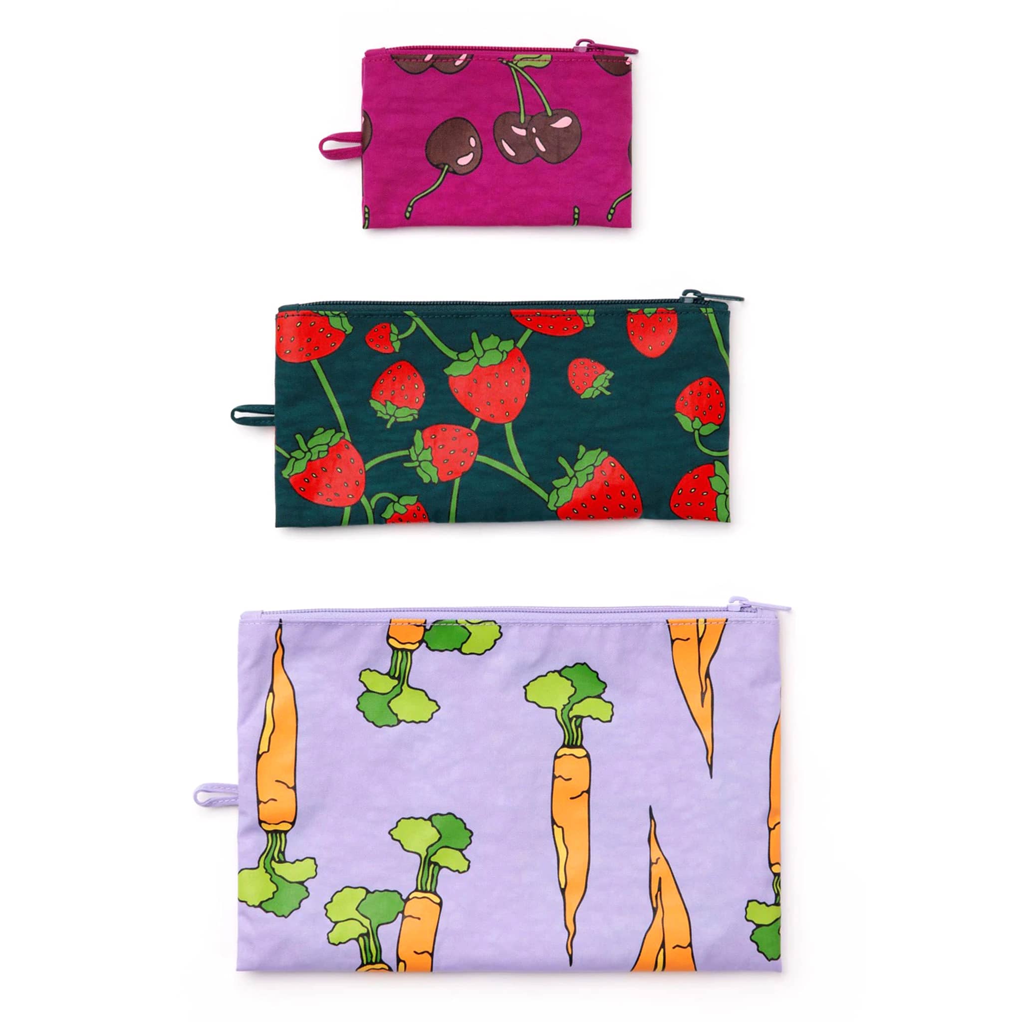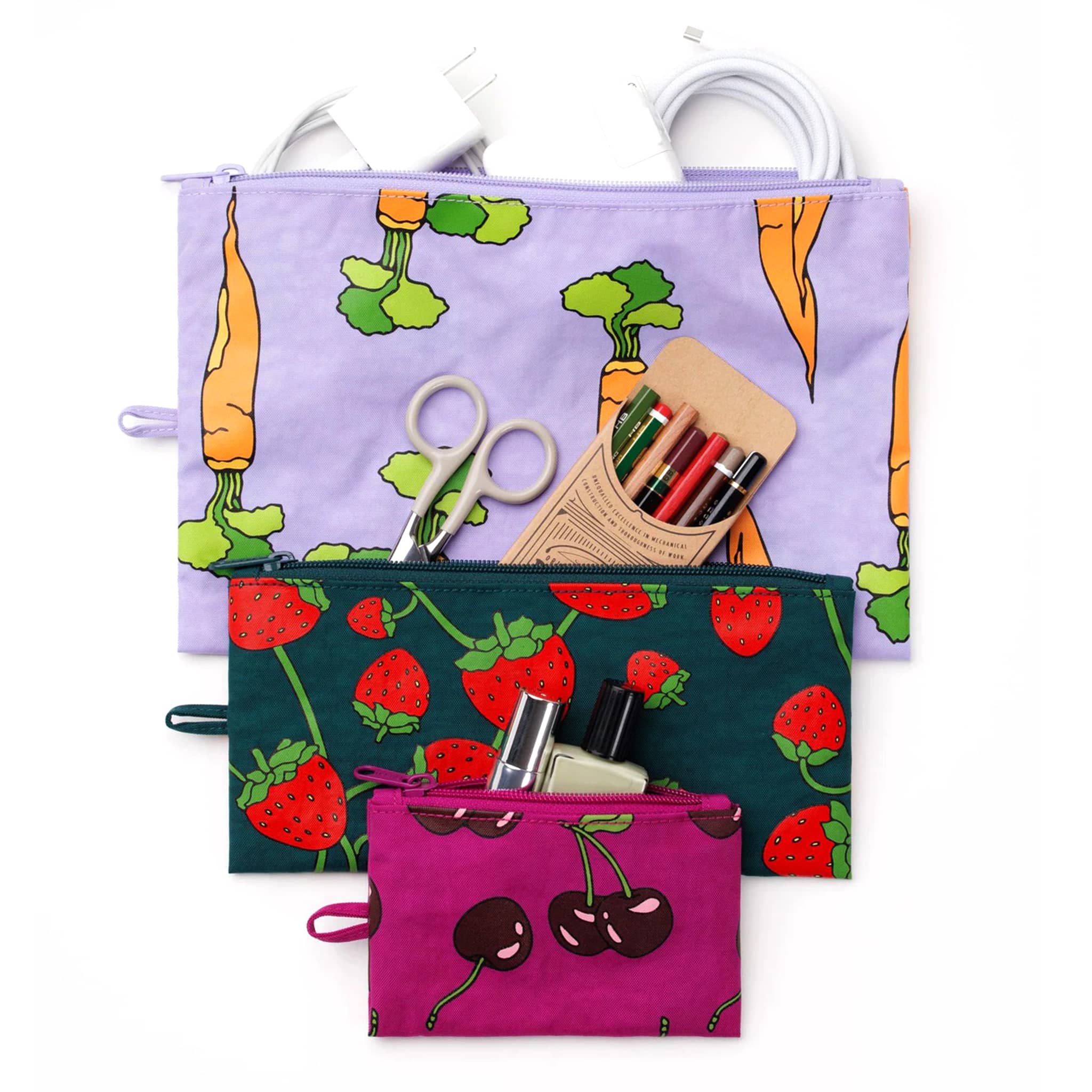 These zip pouches from BAGGU may be flat but they are full of depth and possibilities! Set of 3 pouches in different sizes, each featuring a print from the Carrots and Berries collection. Slip them in your bag and keep all of your daily essentials organized, stash them in your suitcase or use them at home to store makeup, toiletries, craft supplies, coins, keys, and more. Beautiful and functional zipper pouches keep items secure inside.