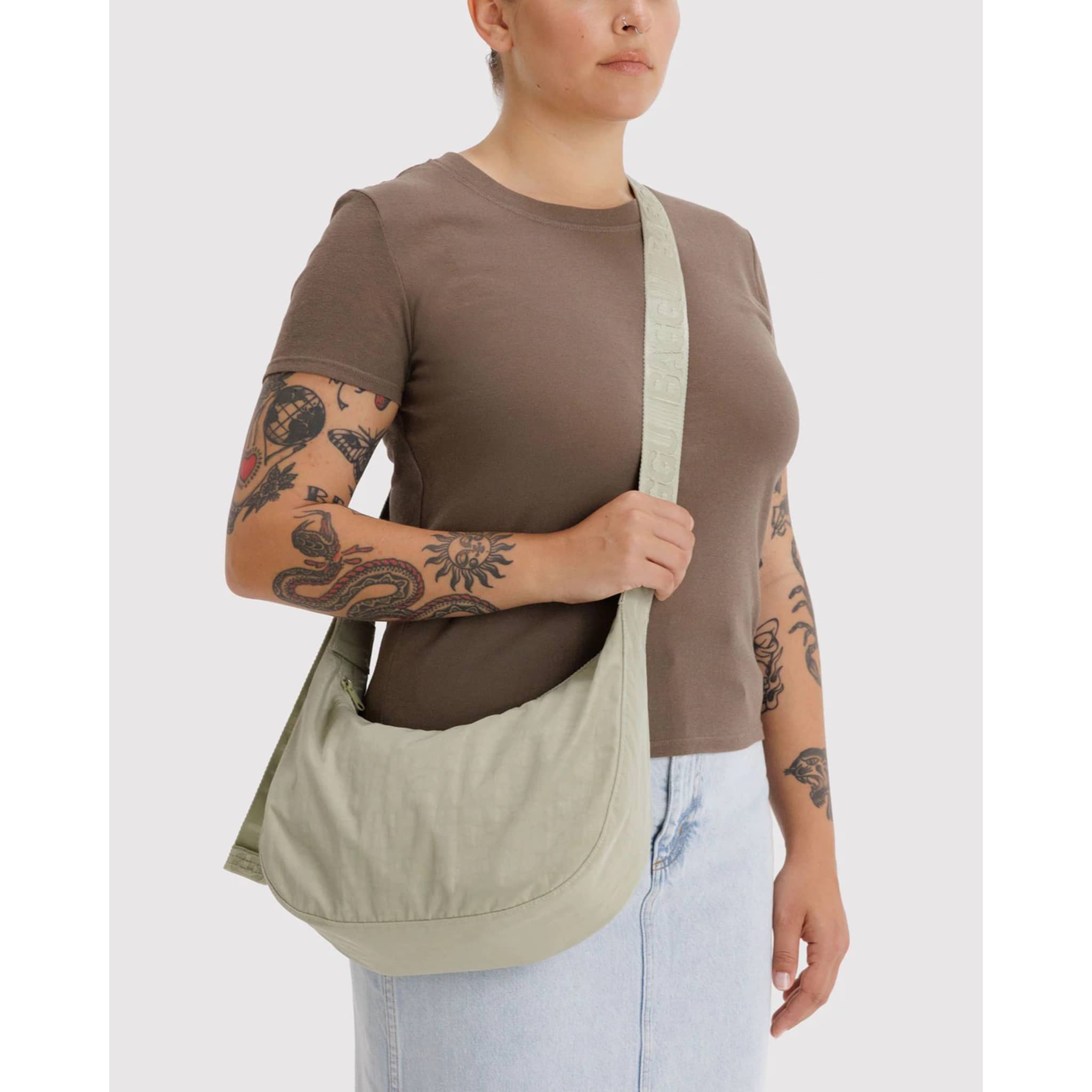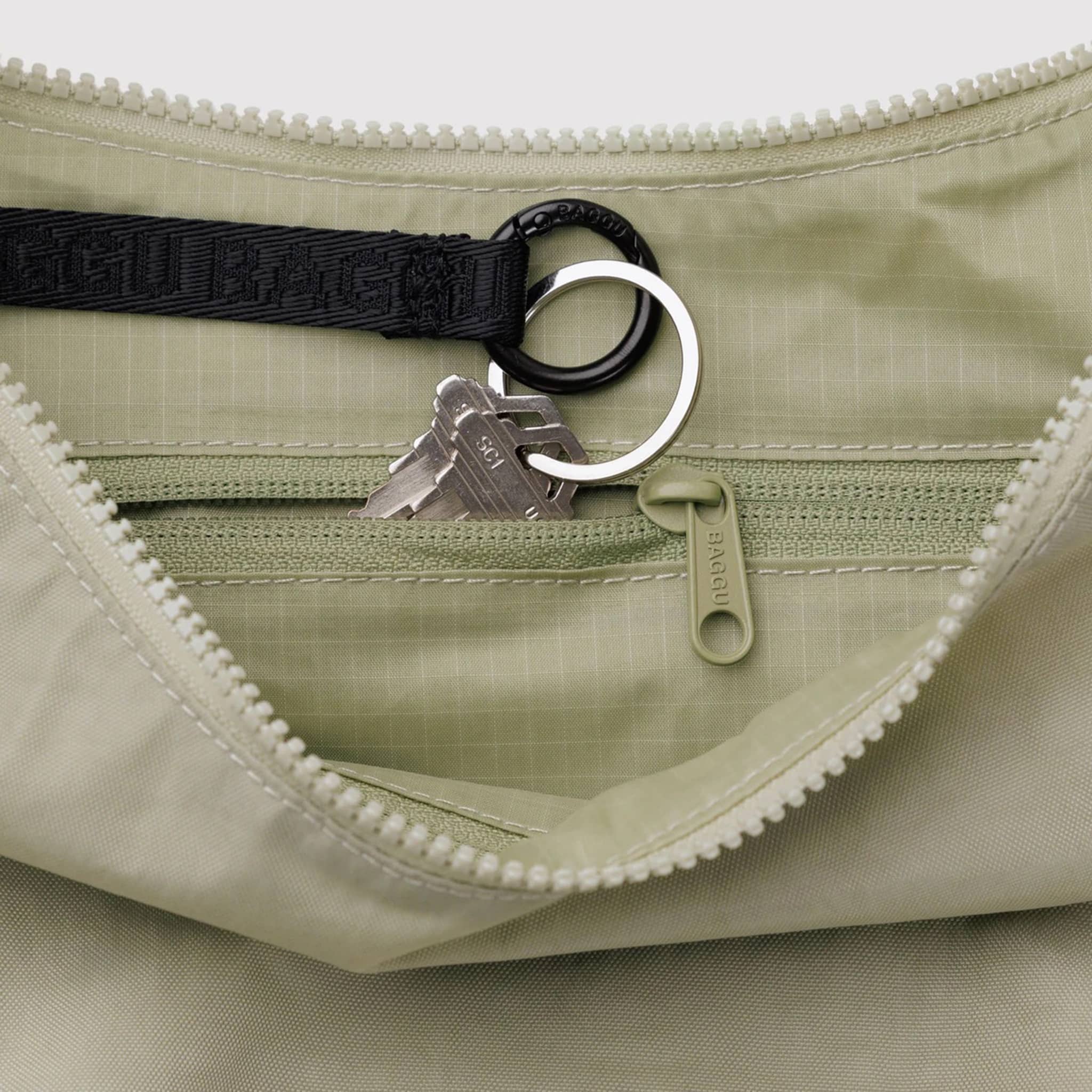 Practical doesn't have to be boring. The Medium Nylon Crescent Bag from BAGGU is effortlessly casual and large enough to carry more than just the essentials. Wear this Celadon bag slung over your shoulder or crossbody for a hands-free experience. Complete with 2 interior zip pockets that make it easy to stay organized, an internal black logo key leash, and a metal carabiner. The medium size fits a 32-ounce water bottle along with the small and medium sizes of Go Pouch Sets.