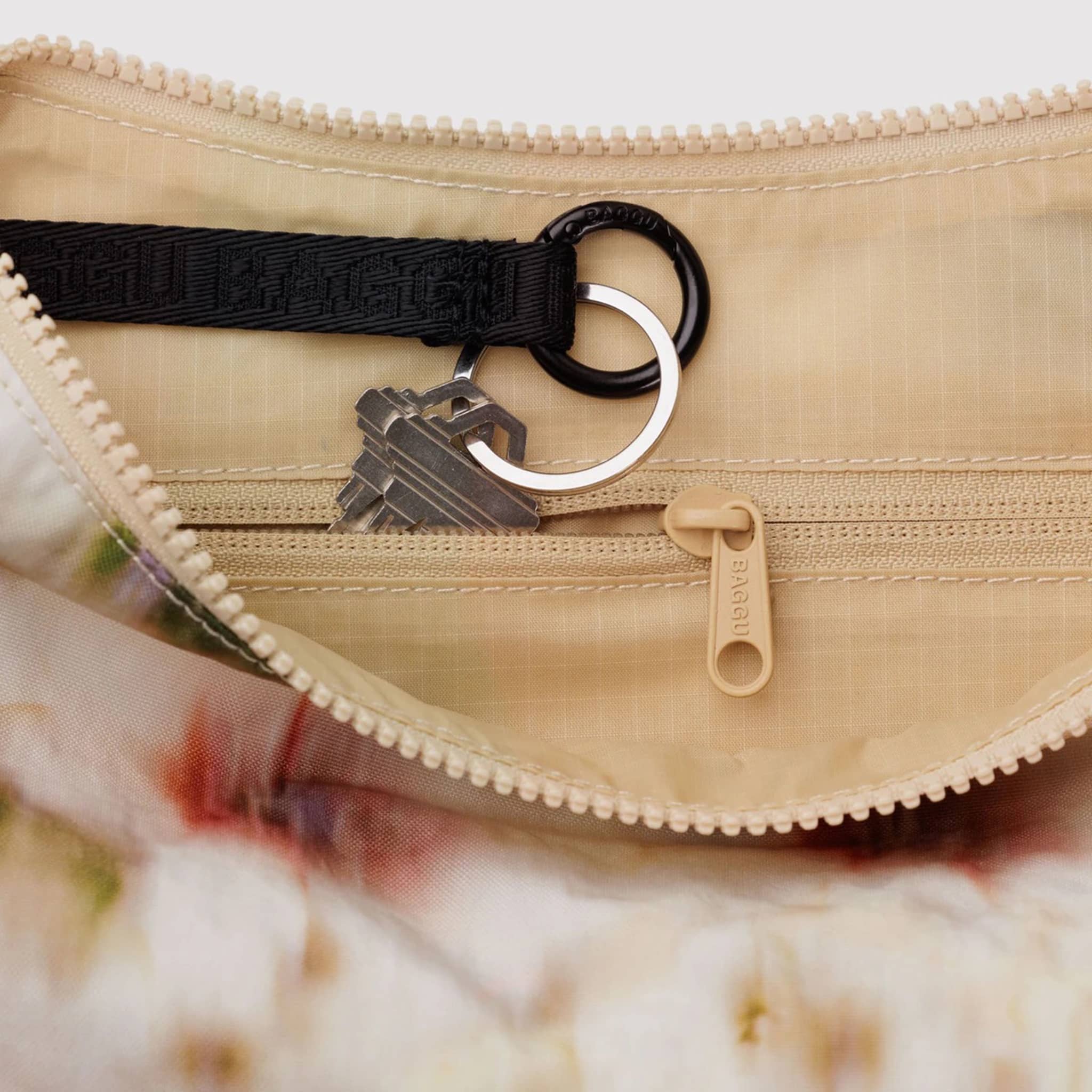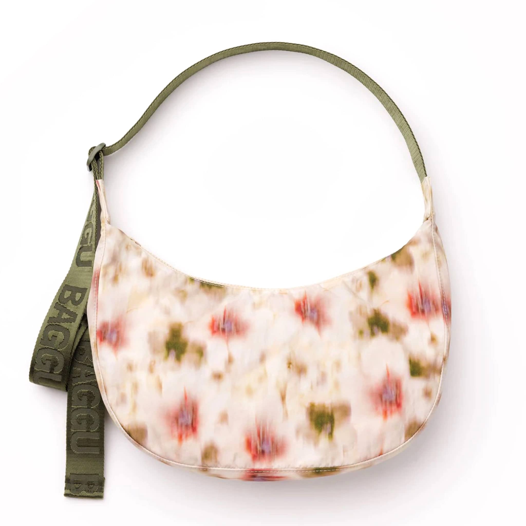 Practical doesn't have to be boring. The Medium Nylon Crescent Bag from BAGGU is effortlessly casual and large enough to carry more than just the essentials. Wear this Abstract Floral bag slung over your shoulder or crossbody for a hands-free experience. Complete with 2 interior zip pockets that make it easy to stay organized, an internal black logo key leash, and a metal carabiner. The medium size fits a 32-ounce water bottle along with the small and medium sizes of Go Pouch Sets.
