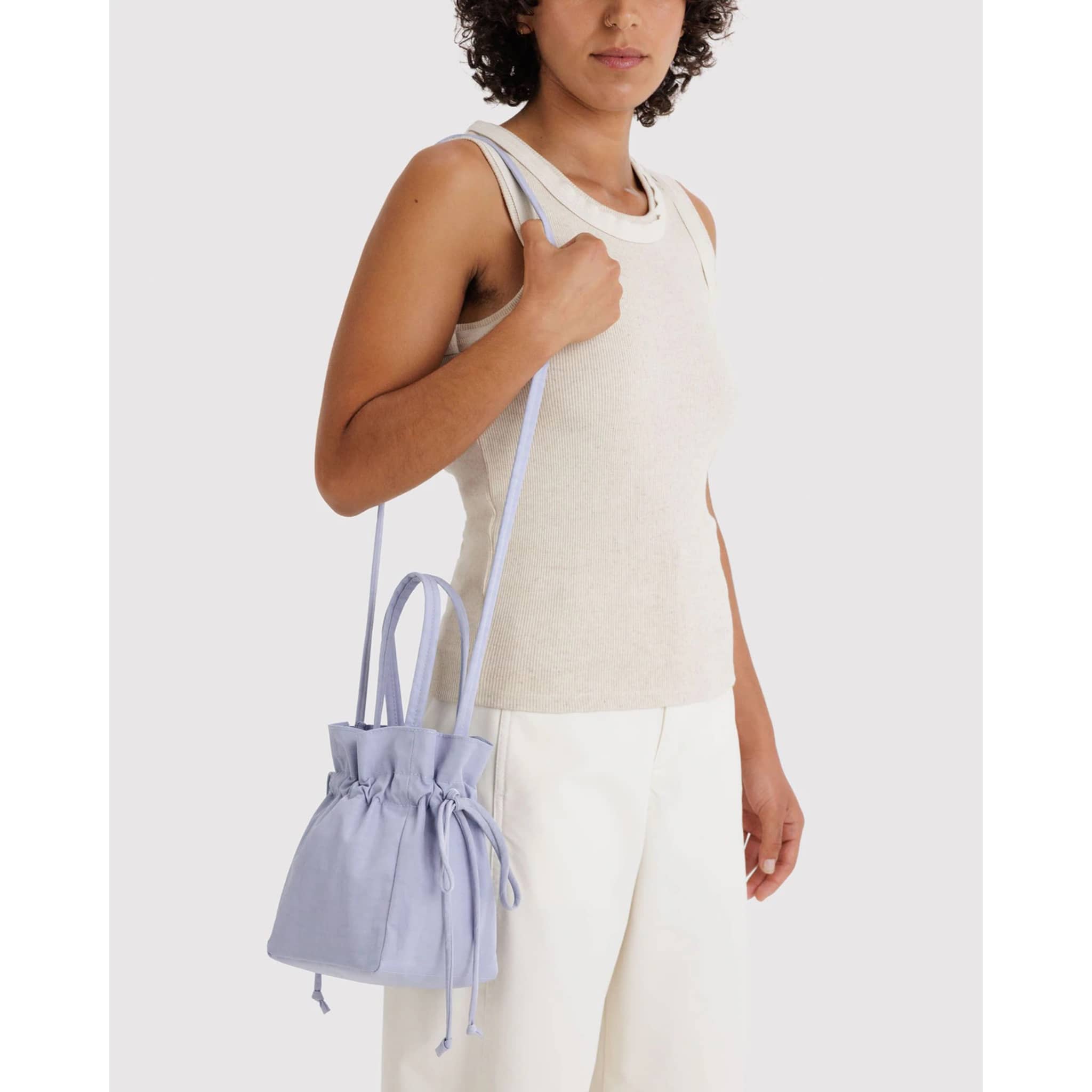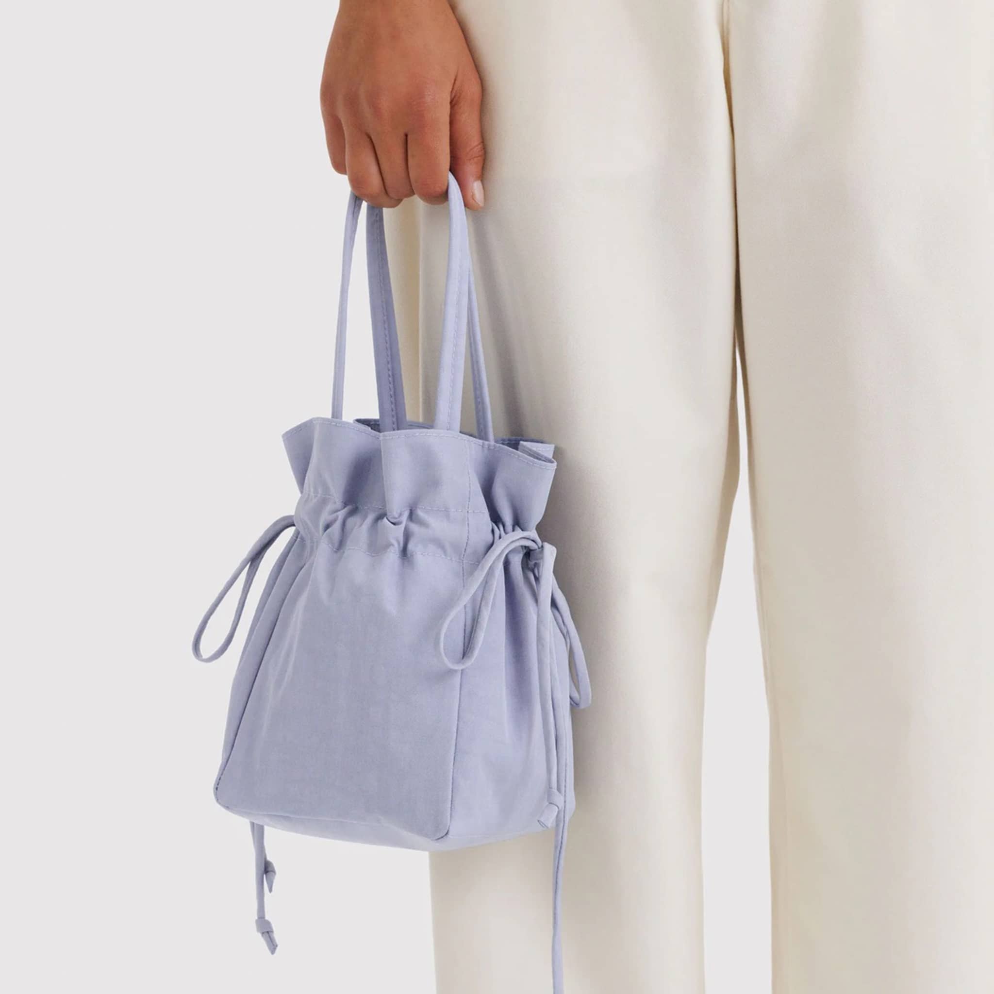 The BAGGU Nylon Drawstring Bag in Mist is made for all kinds of special occasions. It fits exactly what you need without looking overstuffed, thanks to a cinch-top design. Carry by its top handles or style as a crossbody with a removable strap. Features an interior zip pocket to keep smaller things close at hand.