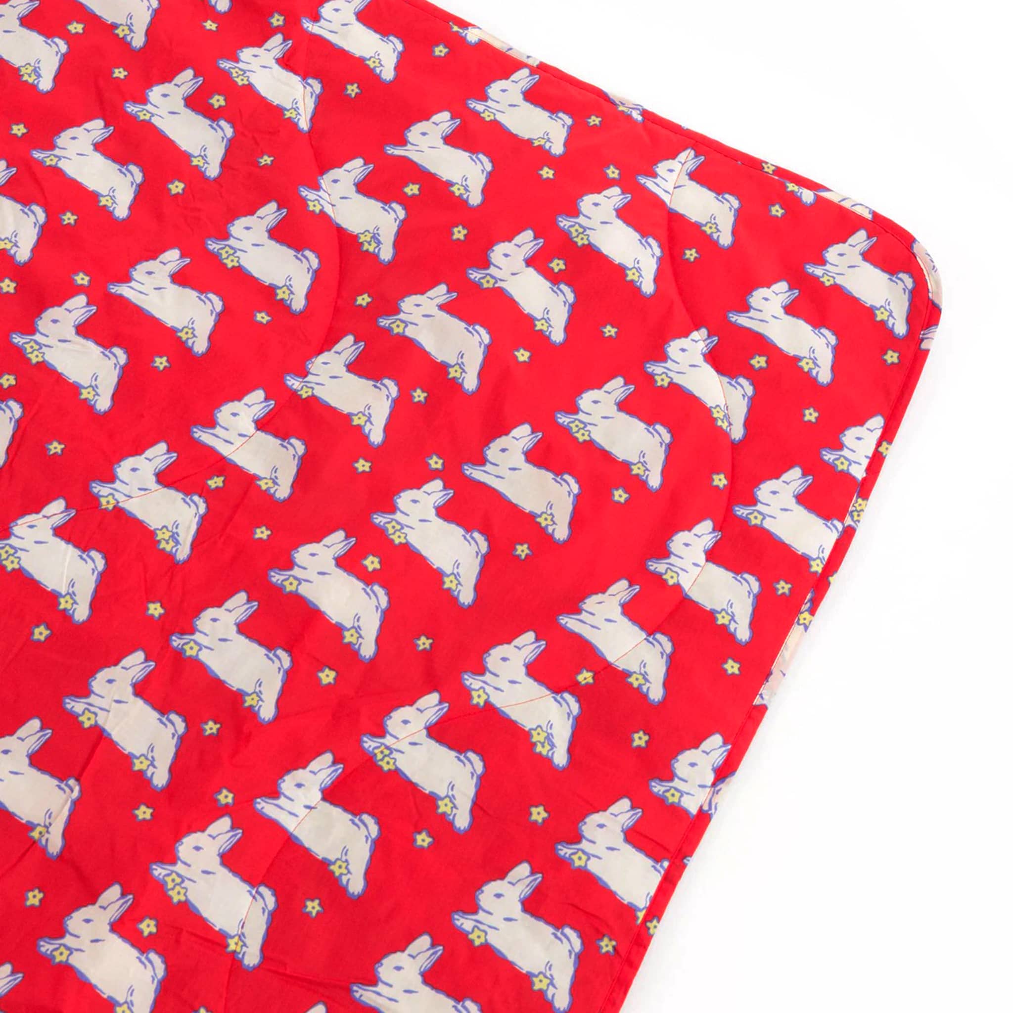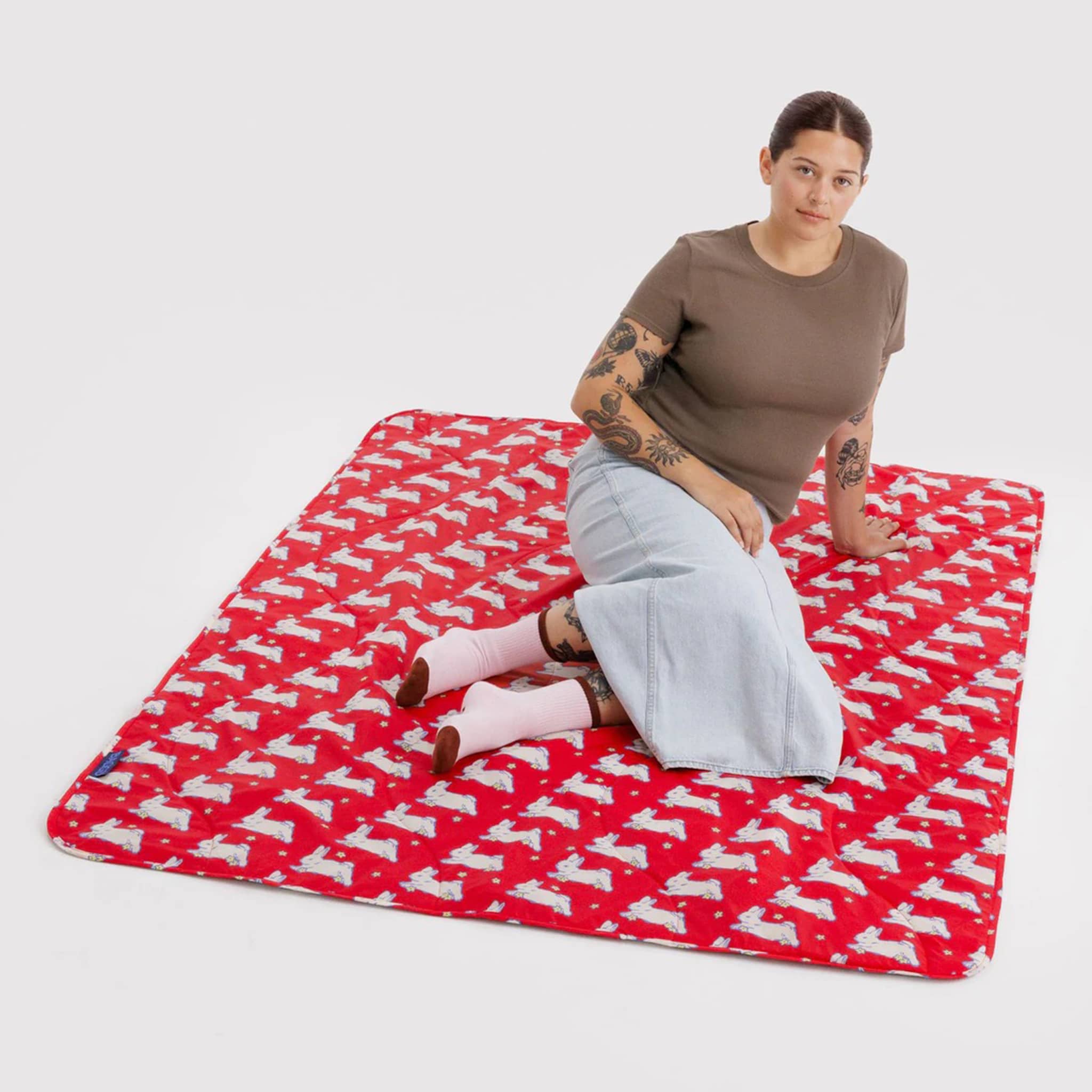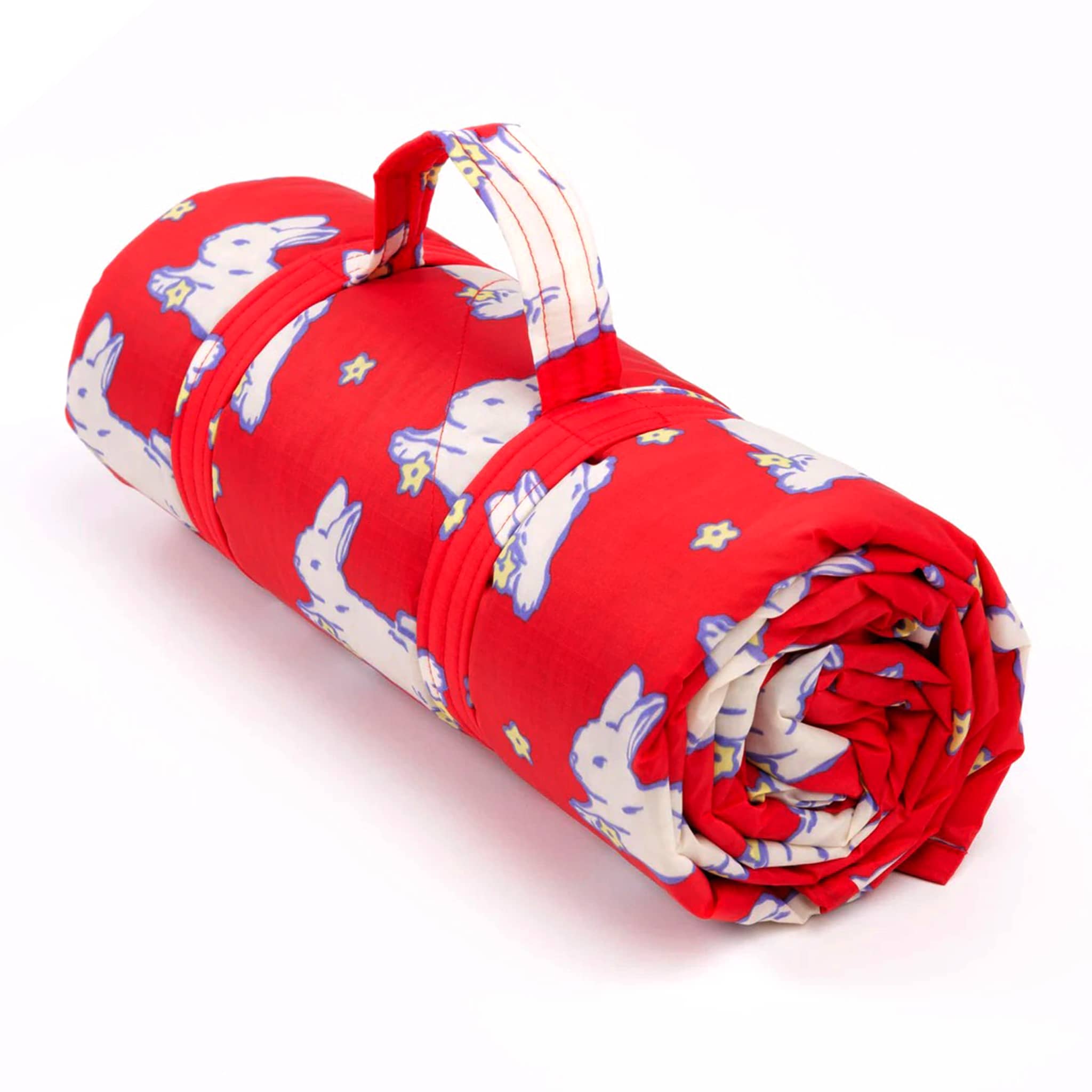 This puffy quilted picnic blanket from BAGGU features the Bunnies print, perfect for picnics in the park or beach outings! Adorable white bunnies with tiny blooms leap across a bright red backdrop. Includes a carrying strap so you can roll it up and bring it anywhere.