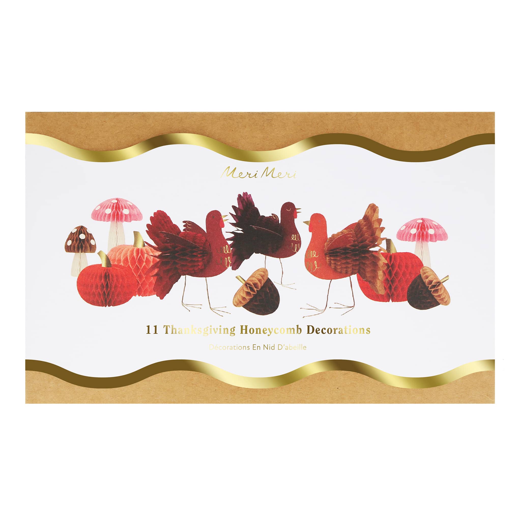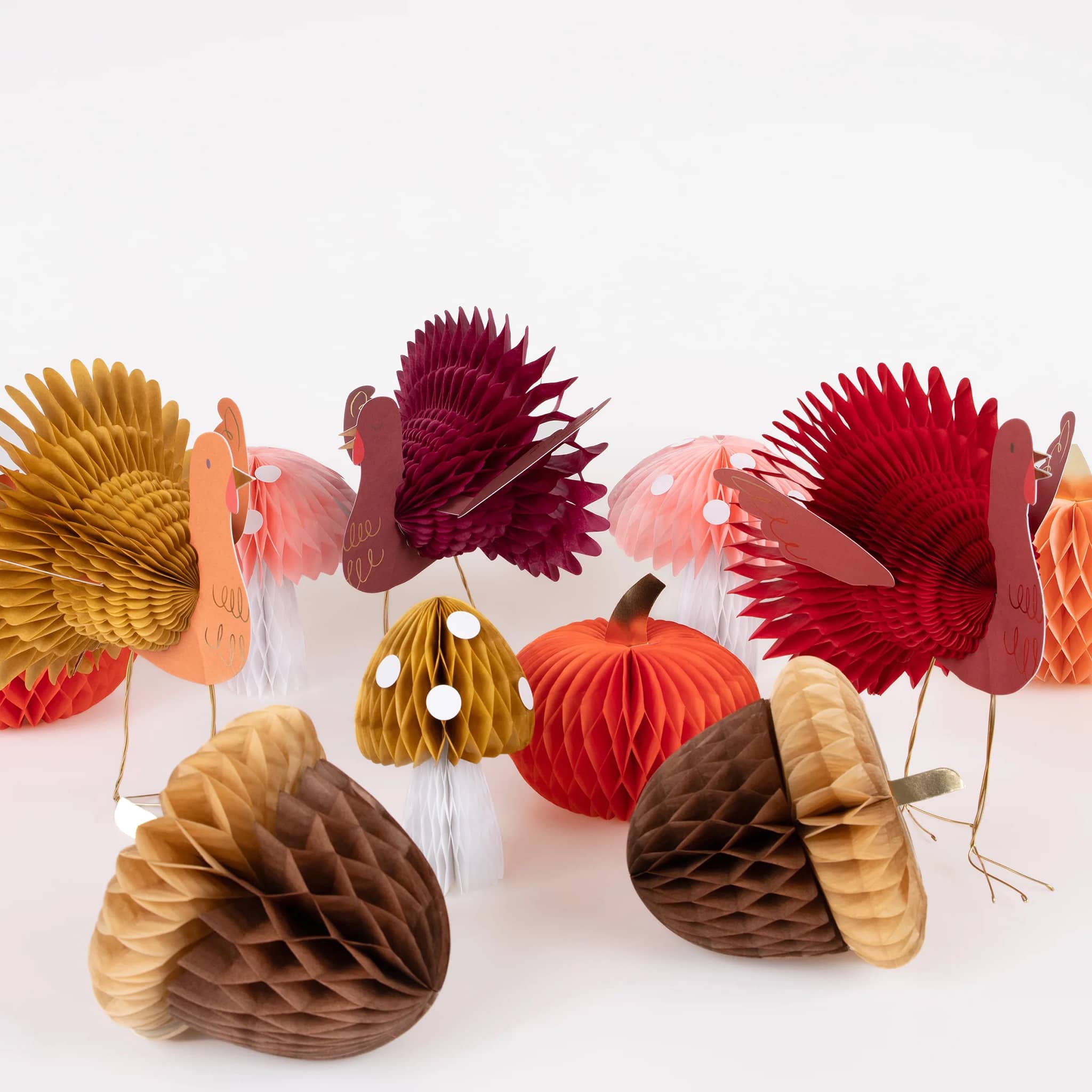 Create a wonderful woodland effect with this delightful Mixed Thanksgiving Honeycomb Decorations Set from Meri Meri. It features vintage-inspired designs of traditional Thanksgiving icons including turkeys, pumpkins, mushrooms and acorns. Use them as amazing Thanksgiving table decorations, or place them on the mantel. Fold them away after the celebrations are over to reuse them year after year.