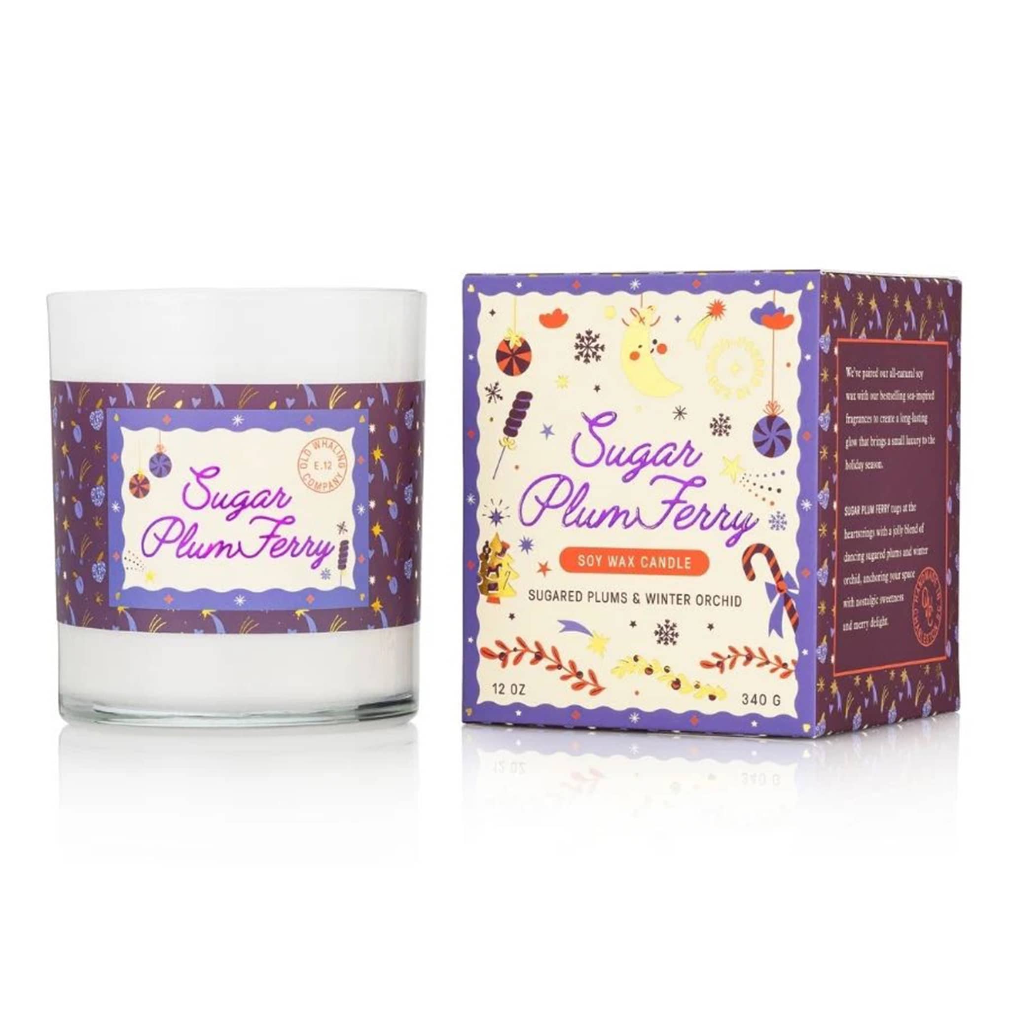 Set sail into a world of holiday magic with Sugar Plum Ferry, a whimsical fragrance that blends sweet, fruity warmth with a coastal breeze of enchantment. Juicy plum and a splash of citrus sparkle like sugar crystals, while soft sandalwood and winter orchid add a velvety, comforting finish. Inspired by a charming ferry boat drifting through a sea of snowflakes and candy-colored dreams. Old Whaling Company's limited edition holiday scent features beautiful packaging with gold foil, embossing, and original artwork by Lulu Dubreuil.