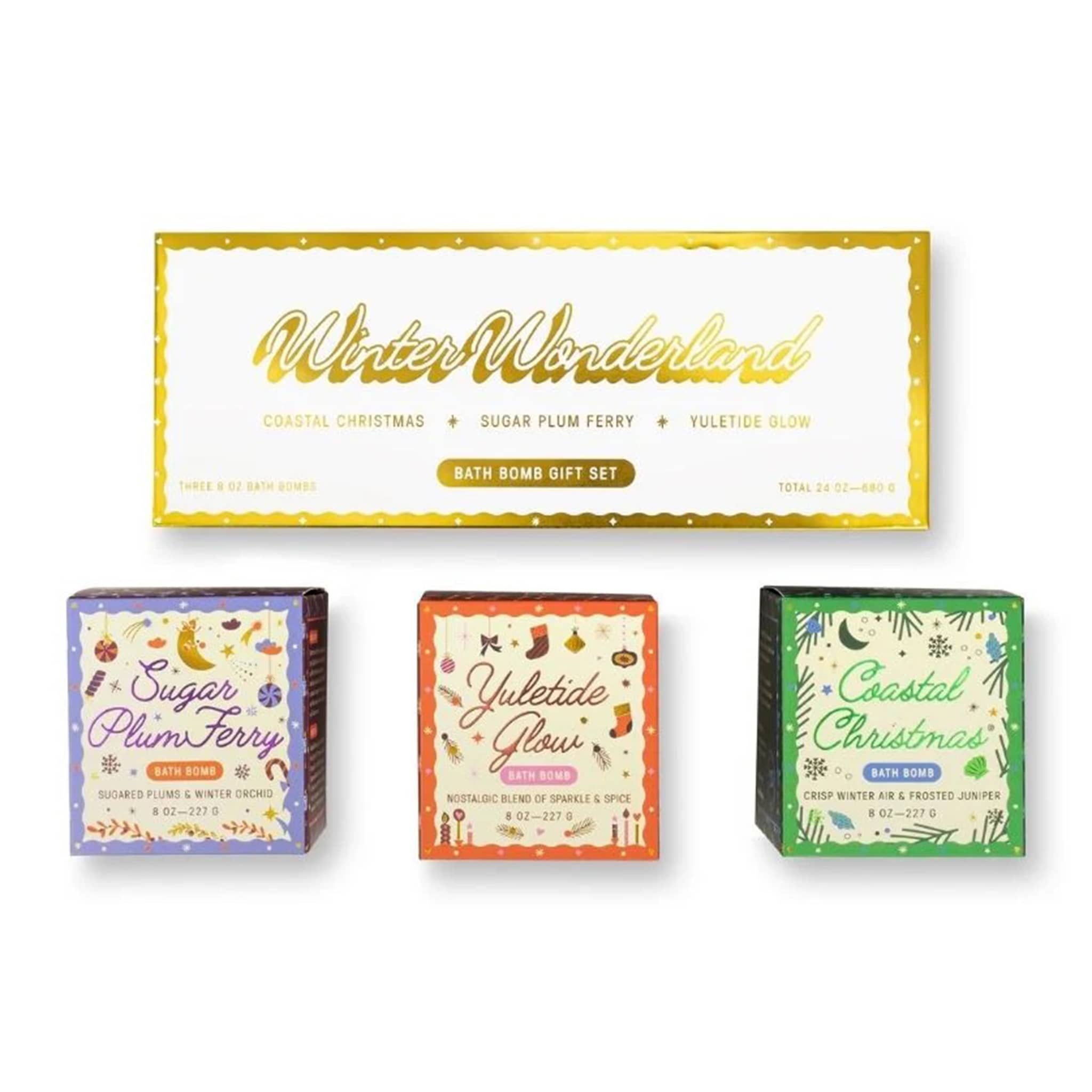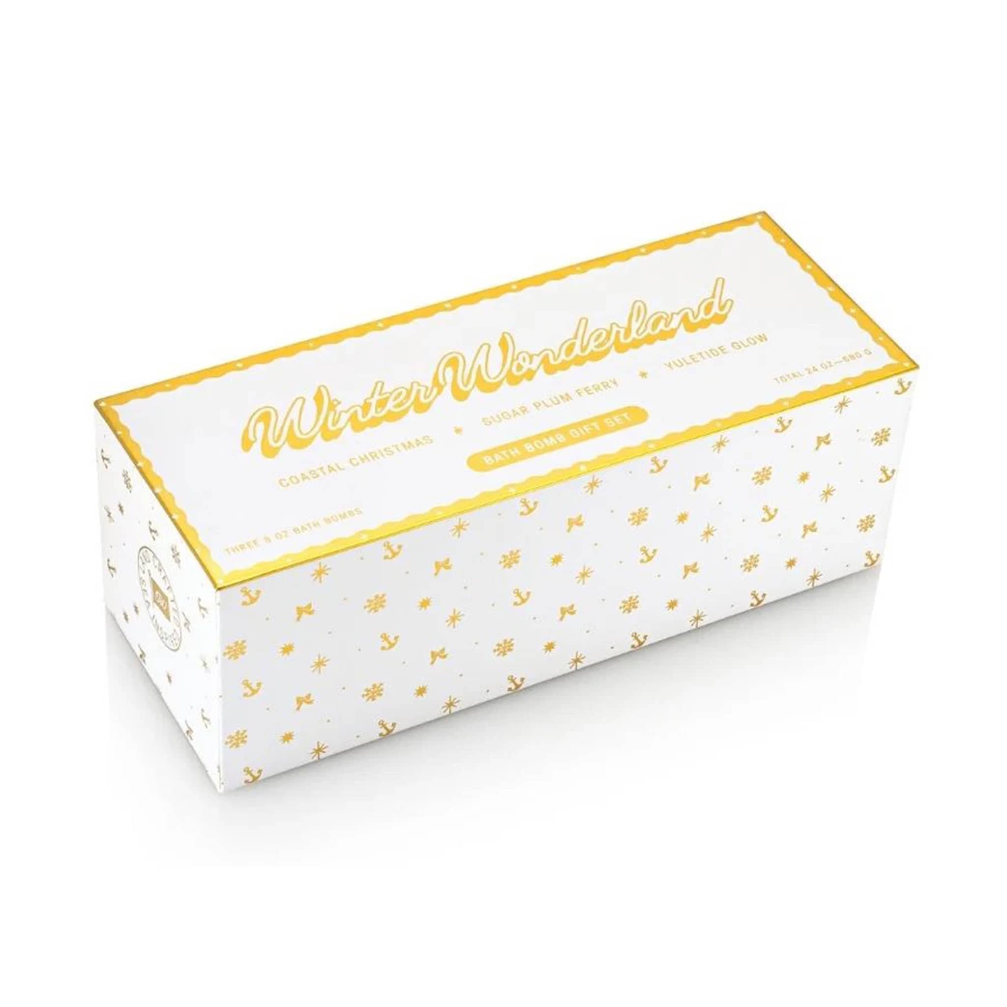 Celebrate the season with the Winter Wonderland Bath Bomb Gift Set from Old Whaling Company! Features 3 handcrafted, limited edition, holiday scented bath bombs: Coastal Christmas, Sugar Plum Ferry, and Yuletide Glow! Beautifully packaged in a white gift box with gold foil and embossed elements, this festive set is perfect for holiday gifting or treating yourself to a relaxing soak. Each bath bomb is made with skin-loving ingredients and festive fragrances that capture the cozy, joyful spirit of the holidays. A must-have gift for bath lovers and anyone who loves luxurious, holiday-inspired self-care.