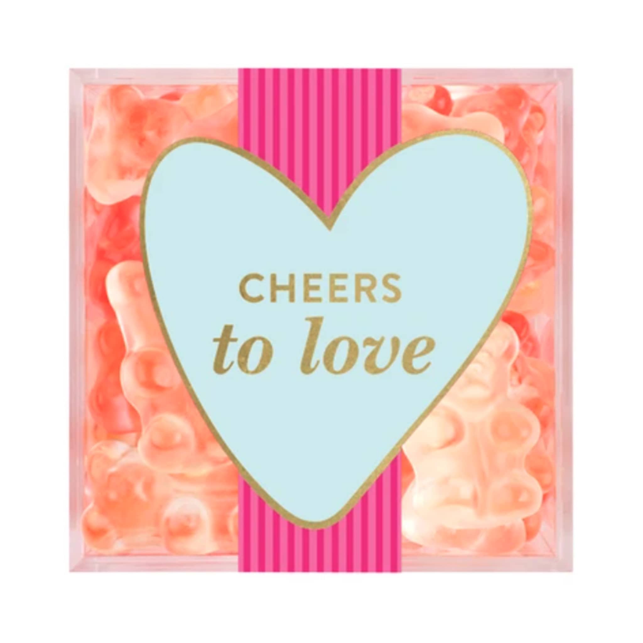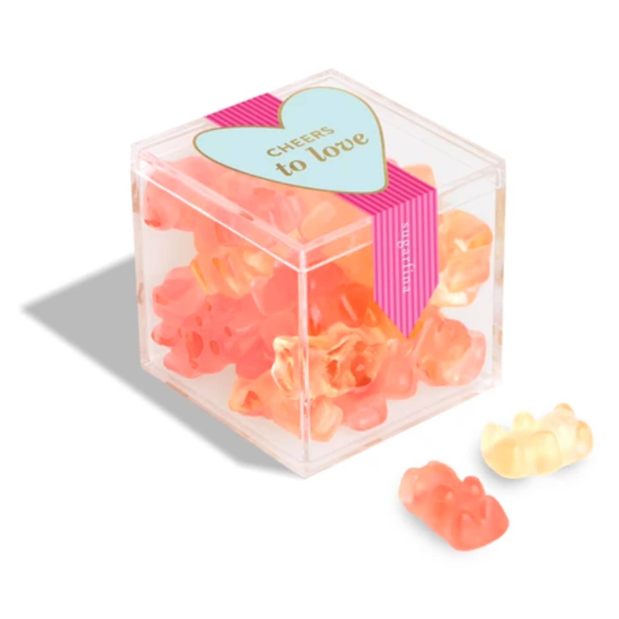 Raise a glass to love with these sophisticated, decidedly grown-up gummy bears from Sugarfina made with Dom Pérignon Vintage Champagne and sparkling in flavors* of classic Brut and fashionable Rosé. This 3.9 oz cube of gummies are the finest bears in all of candy land and are packaged in a clear acrylic candy cube with a blue heart-shaped sticker that says "Cheers to Love" in gold foil and a striped pink ribbon seal. These gummy candies are fat-free and contain no GMO's or artificial colors. Contains approximately 35 pieces. Non-alcoholic and available to ship to any state. They make great Galentine or Valentine party favors for grown-ups!