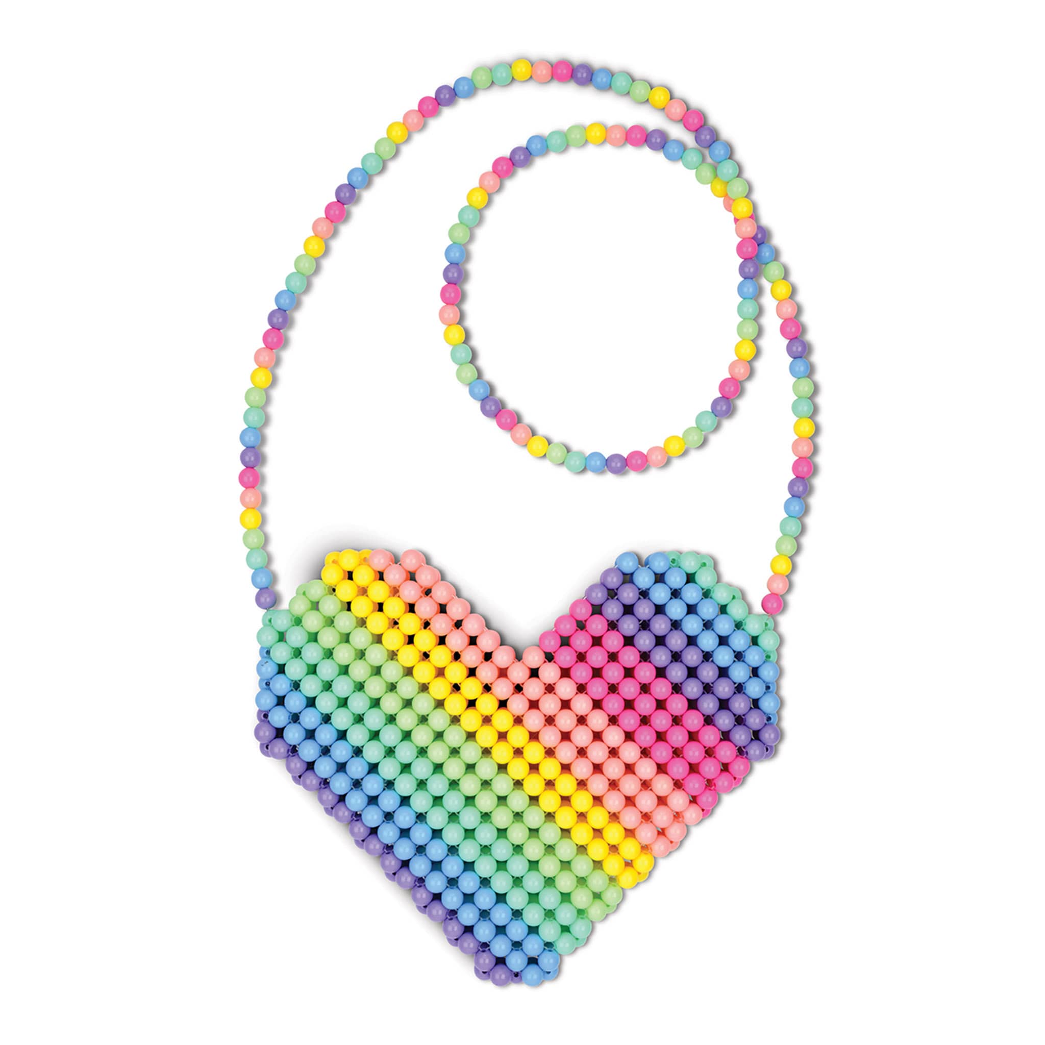 Carry your heart on your sleeve (or shoulder) with our Heart Bead Crossbody Bag. A playful and colorful addition to any outfit, this heart-shaped bag is crafted from pastel plastic beads, making it lightweight and durable. The beaded shoulder strap adds a touch of whimsy to the open weave design, while clear nylon cord keeps it all together. Perfect for adding a pop of color to any ensemble. Bag measures 9 inches wide x 8 inches tall x 1 inch deep.