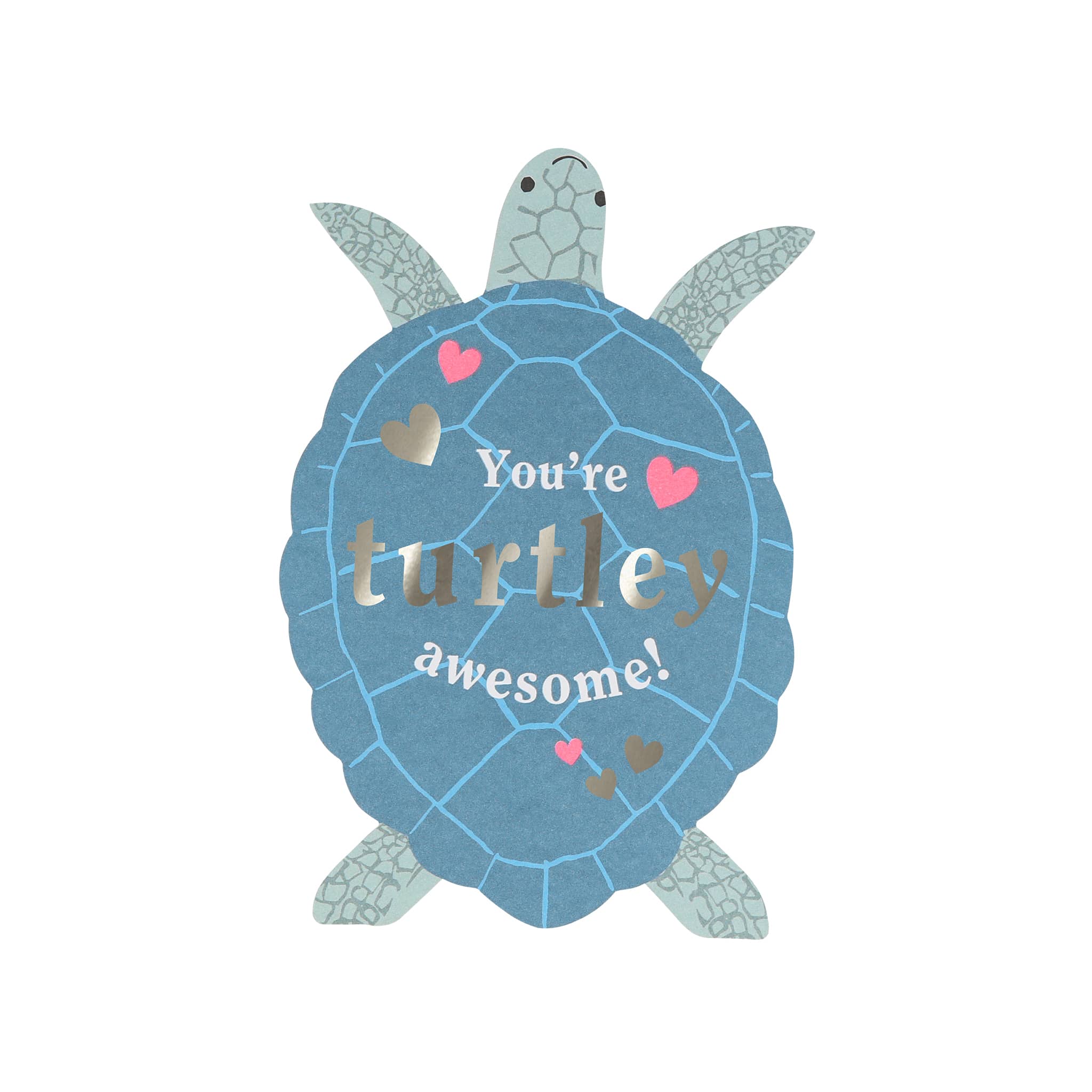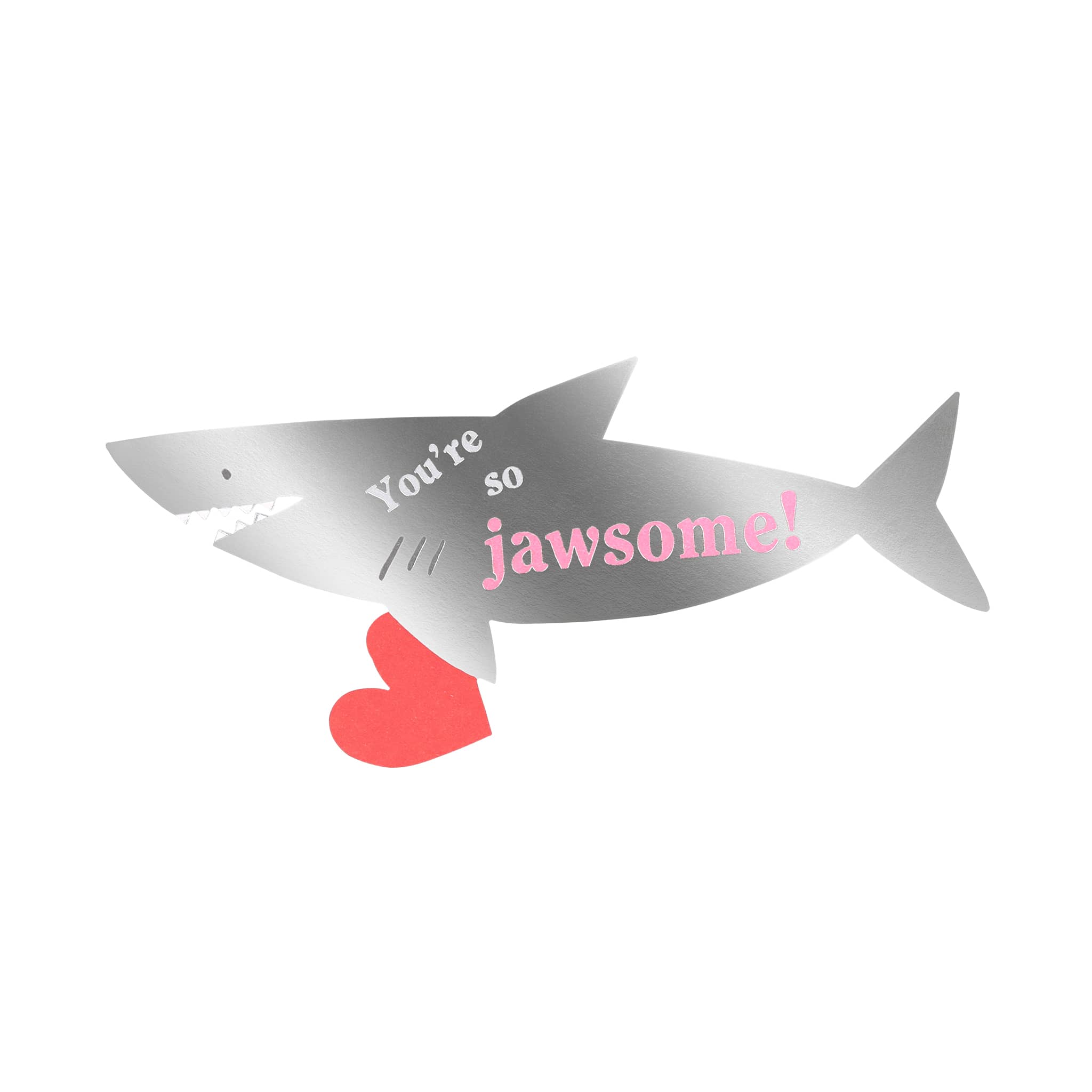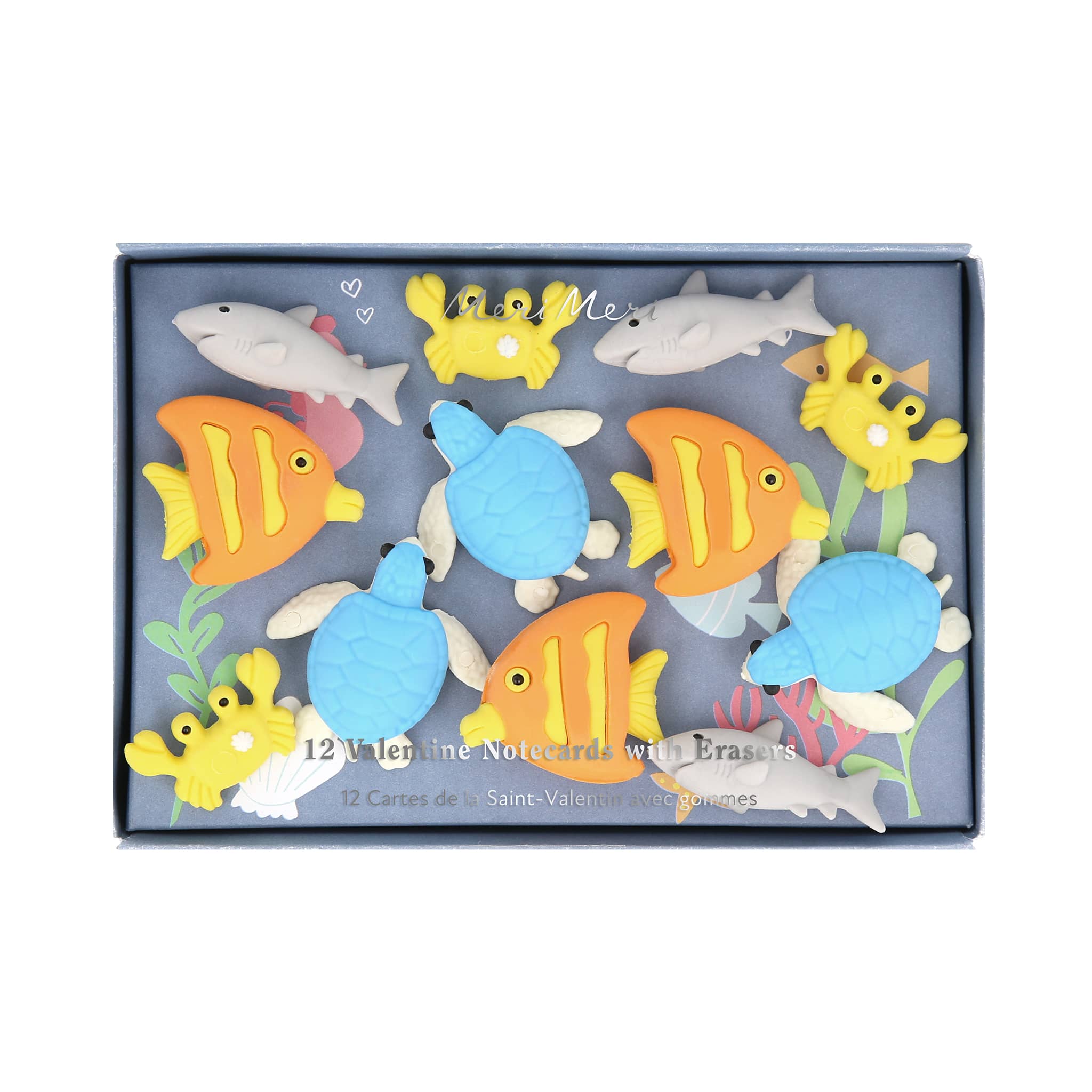 Includes 12 note cards in 4 different designs: red crab, blue turtle, silver shark and yellow fish, with the message "Happy Valentine's Day" printed inside and silver foil details. Also includes 12 erasers in matching designs and 12 envelopes with a sea-themed design. Envelopes measure 5.75 x 3.875 inches. Suitable for ages 3 and up.