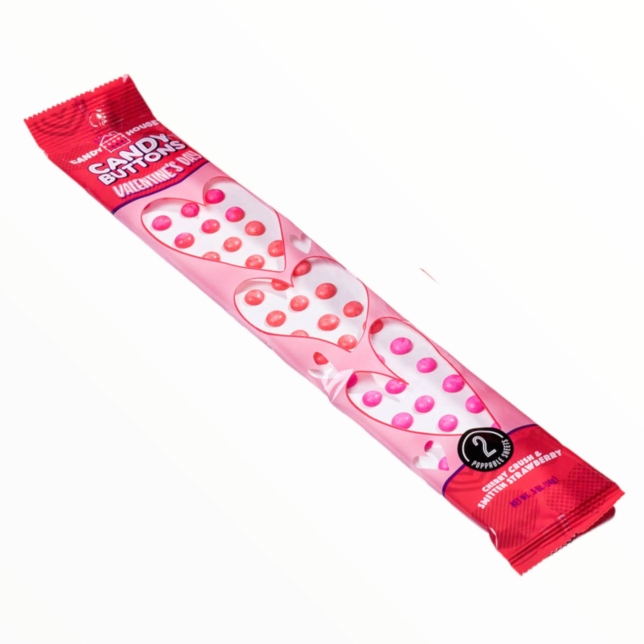 A candy classic! Add some nostalgia and whimsy to your Valentine's Day with these old-fashioned Candy Buttons in special seasonal packaging. Buttons come in red and pink with fruity flavors of Cherry Crush and Smitten Strawberry. Pack contains 2 sheets of poppable candy buttons.
