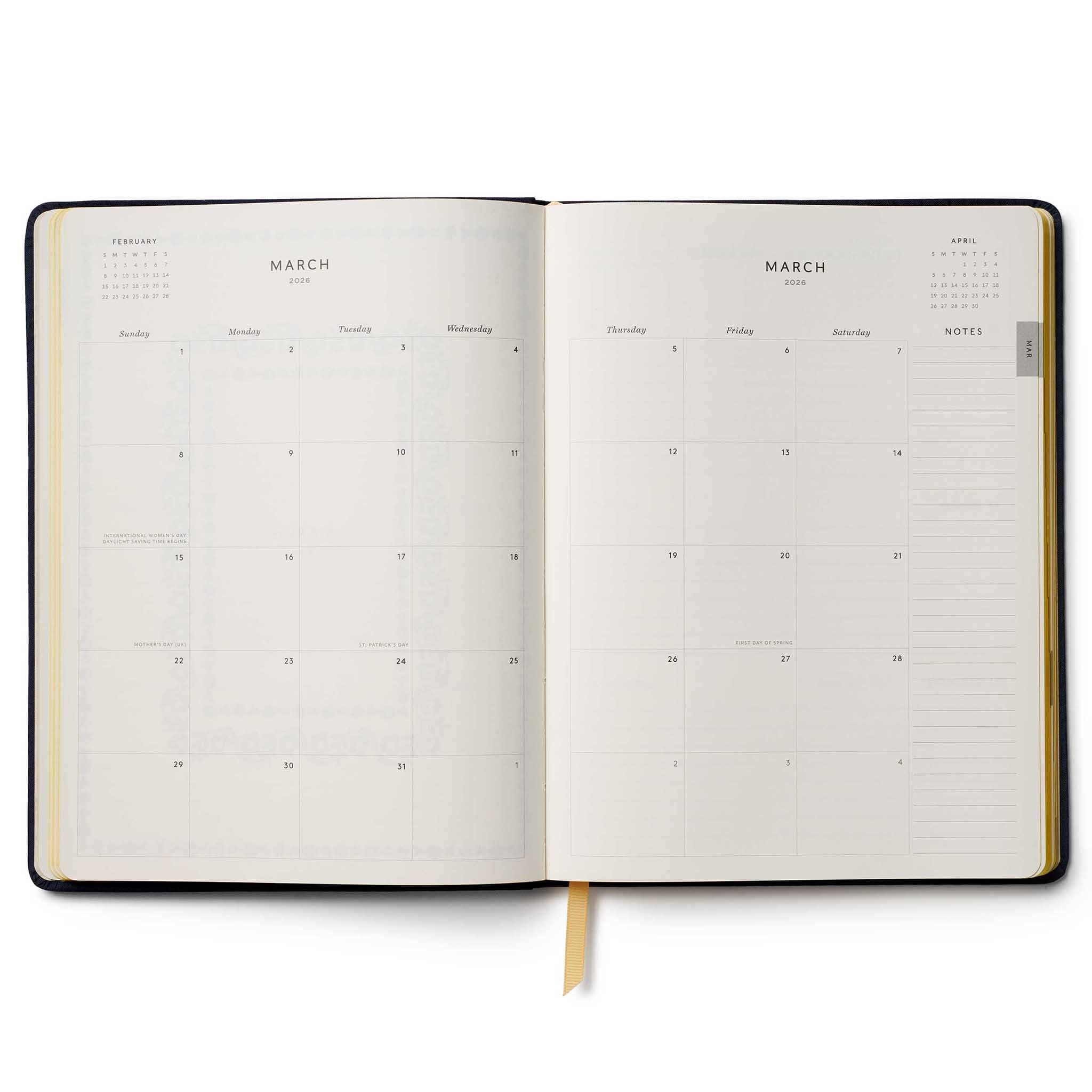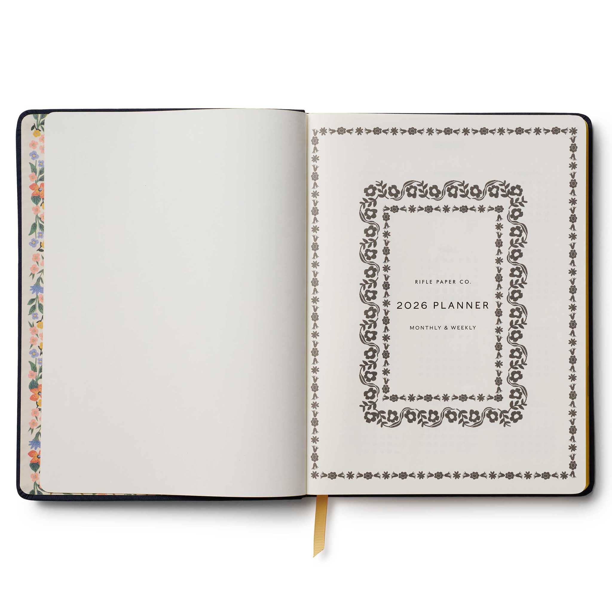 The Wildwood Embroidered Bookbound Planner is a daily essential with a keepsake quality. This book cloth fabric-wrapped planner features delicate embroidery, metallic gold foil details, and a gold elastic closure, as well as weekly and monthly views, space for notes and to-dos, and a list of celebrations. The 12 month planner covers January 2026 to December 2026 and measures 7.18 x 9.62 x 0.75 inches.