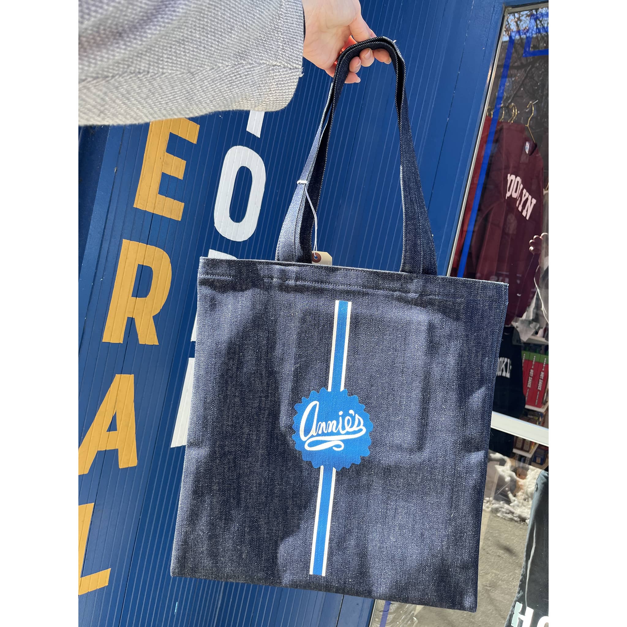Show your love for Annie's with this custom tote! We worked with Maptote to create this chic and strong reusable denim tote bag, complete with a ribbon stripe and the Annie's Blue Ribbon logo. Big enough to hold all your daily essentials but small enough to carry with you wherever you go! Great for stuffing with gifts or on its own for friends and family. Made from 100% natural cotton denim, dimensions are 15.5 x 14 inches with 21-inch handles. Spot clean only to preserve color. Proudly cut, sewn, and printed right here in Brooklyn, NY.