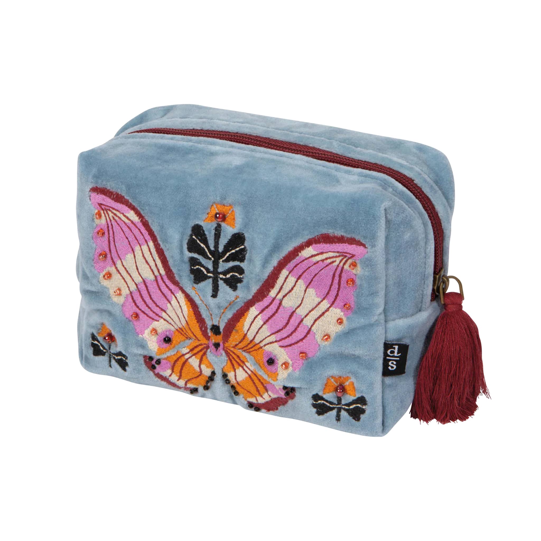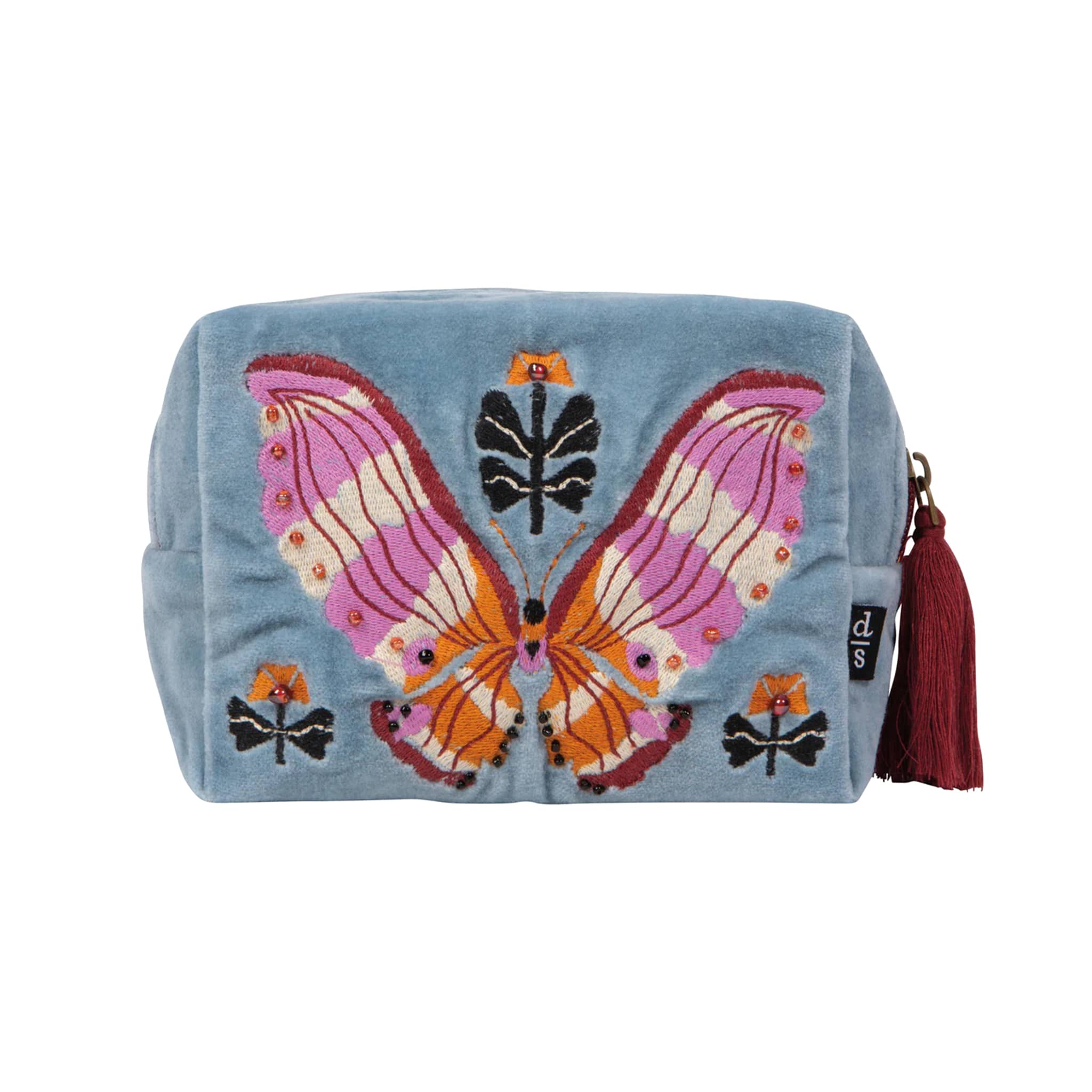 Embroidered and embellished with tassels and beading, this elegant Aurora Velvet Pouch is a cushiony-soft yet sturdy space for storing all your trinkets and treasures. Features a gorgeous butterfly with a sunrise of color gracing its wings along, with delicate florals. Made with 100% cotton velvet with 100% cotton embroidery. Measures 5.75 x 2.75 x 4.75 inches, spot clean only.