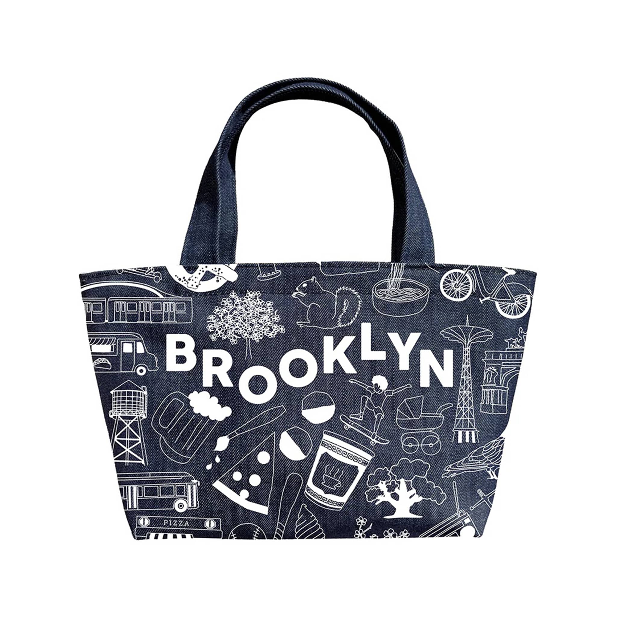 Made from durable 100% denim cotton, it features playful illustrations of iconic Brooklyn sights in white. This design captures the spirit of stoop hangs, Coney Island rides, and late-night pizza runs. It’s a love letter to the borough that always brings the cool. Measures approximately 12.5 x 7.5 x 4.5 inches with 7-inch drop handles. Spot clean when needed.